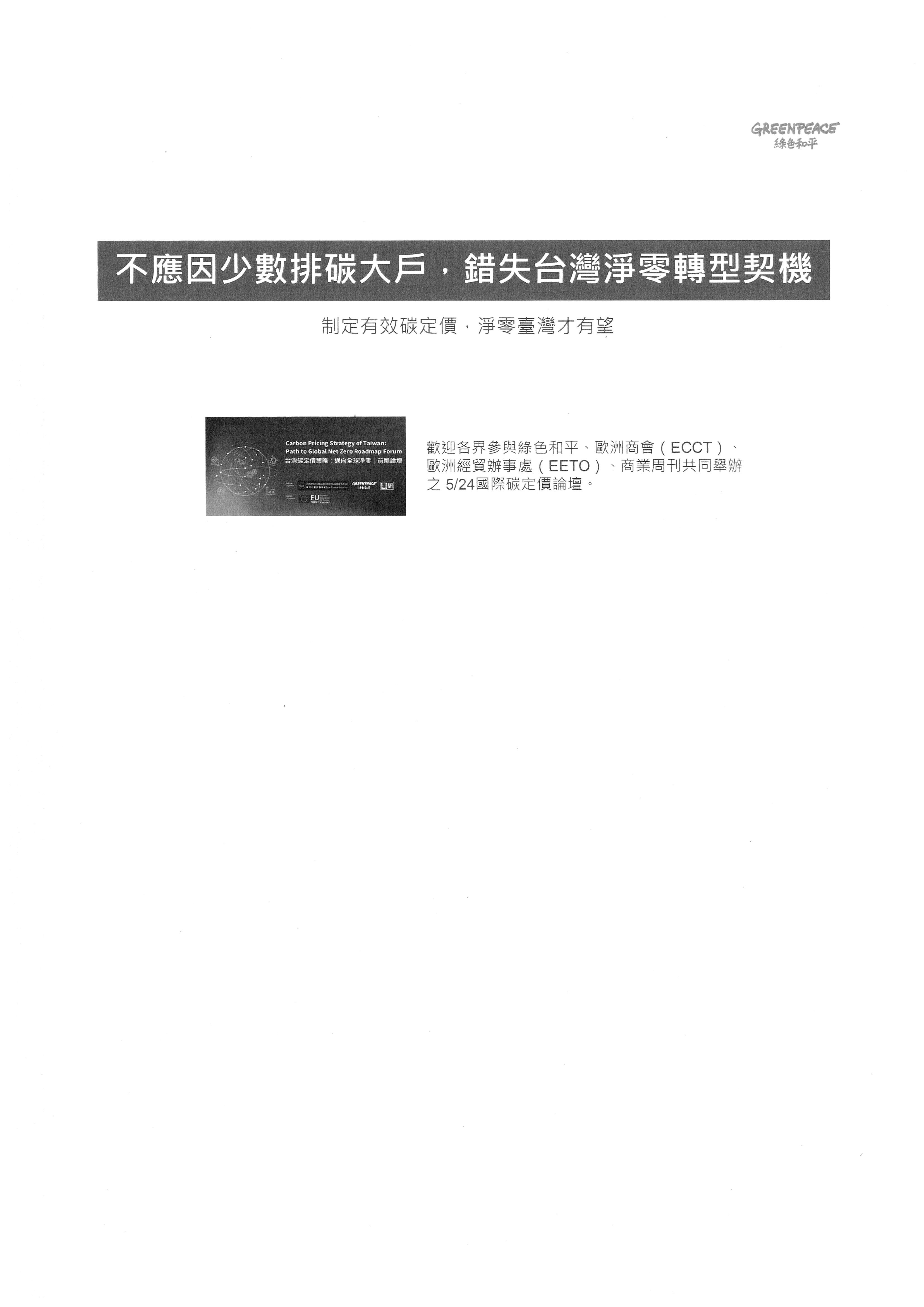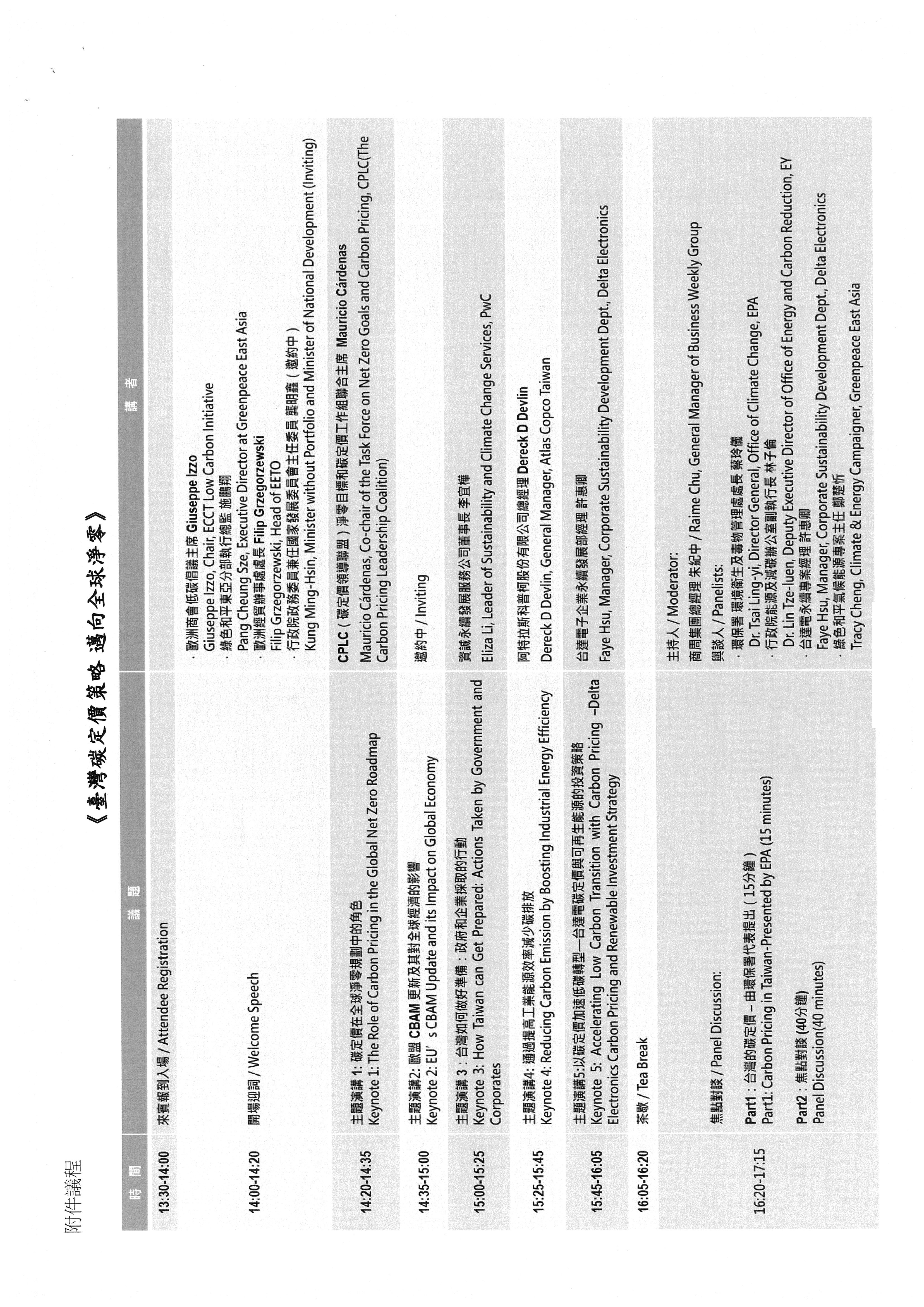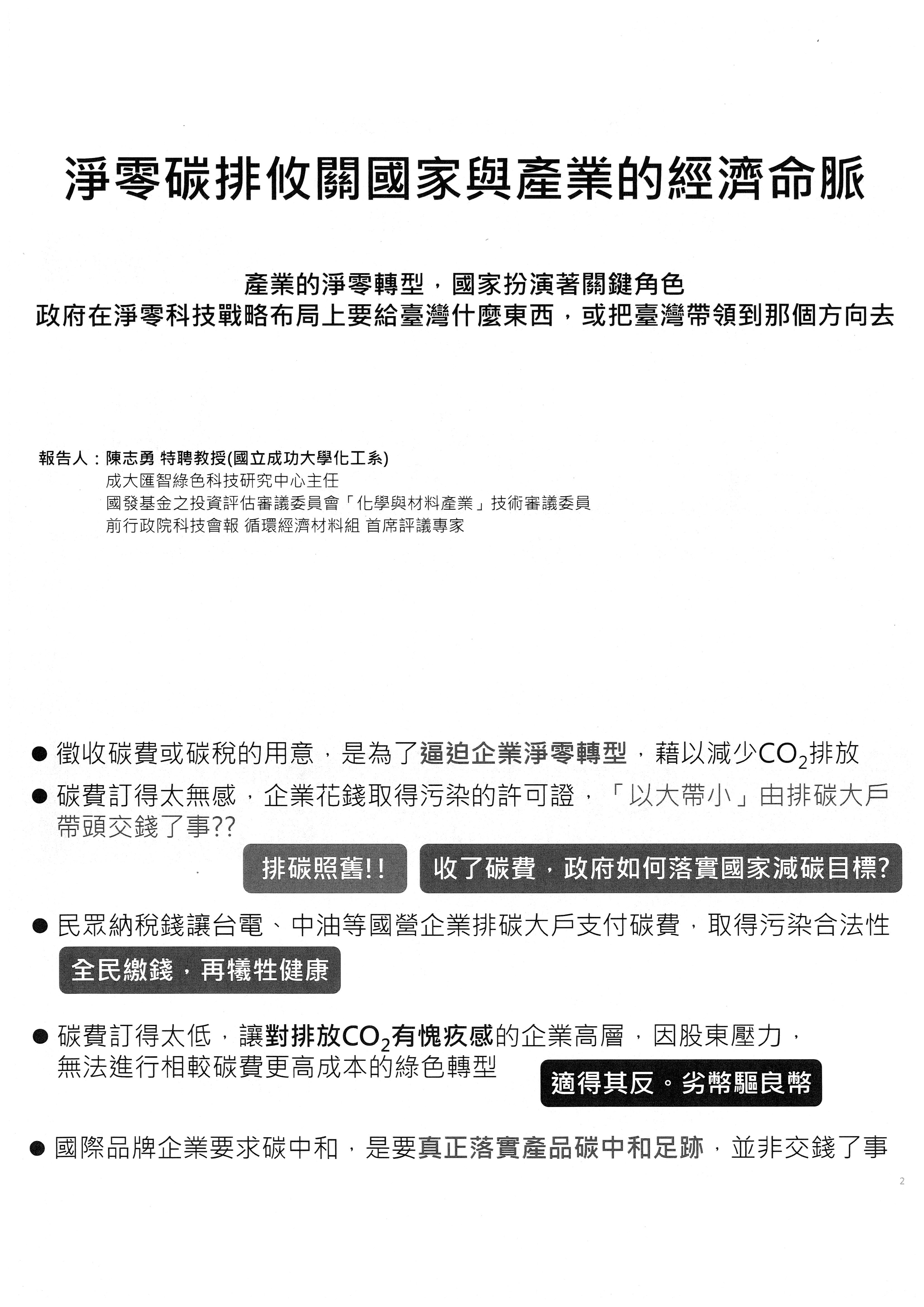 主席:以國內的政經因素而言,如果我們的碳費訂的太高,怕外界會認為企業轉型失敗;如果訂的太低,我們又怕民眾會覺得政府偏頗企業,不顧及人民的健康安危。所以碳費其實很難得到一個共識,訂出費率。