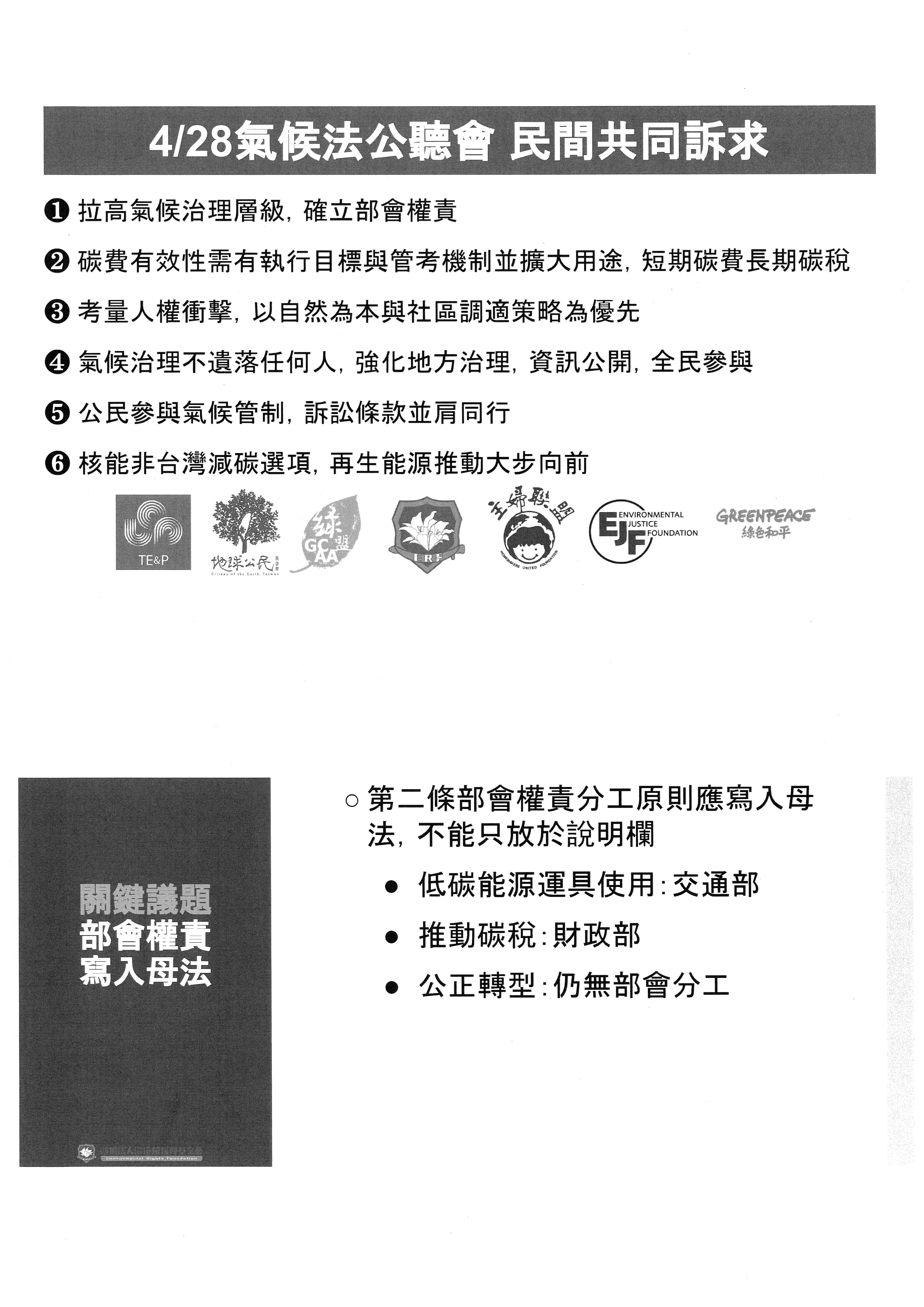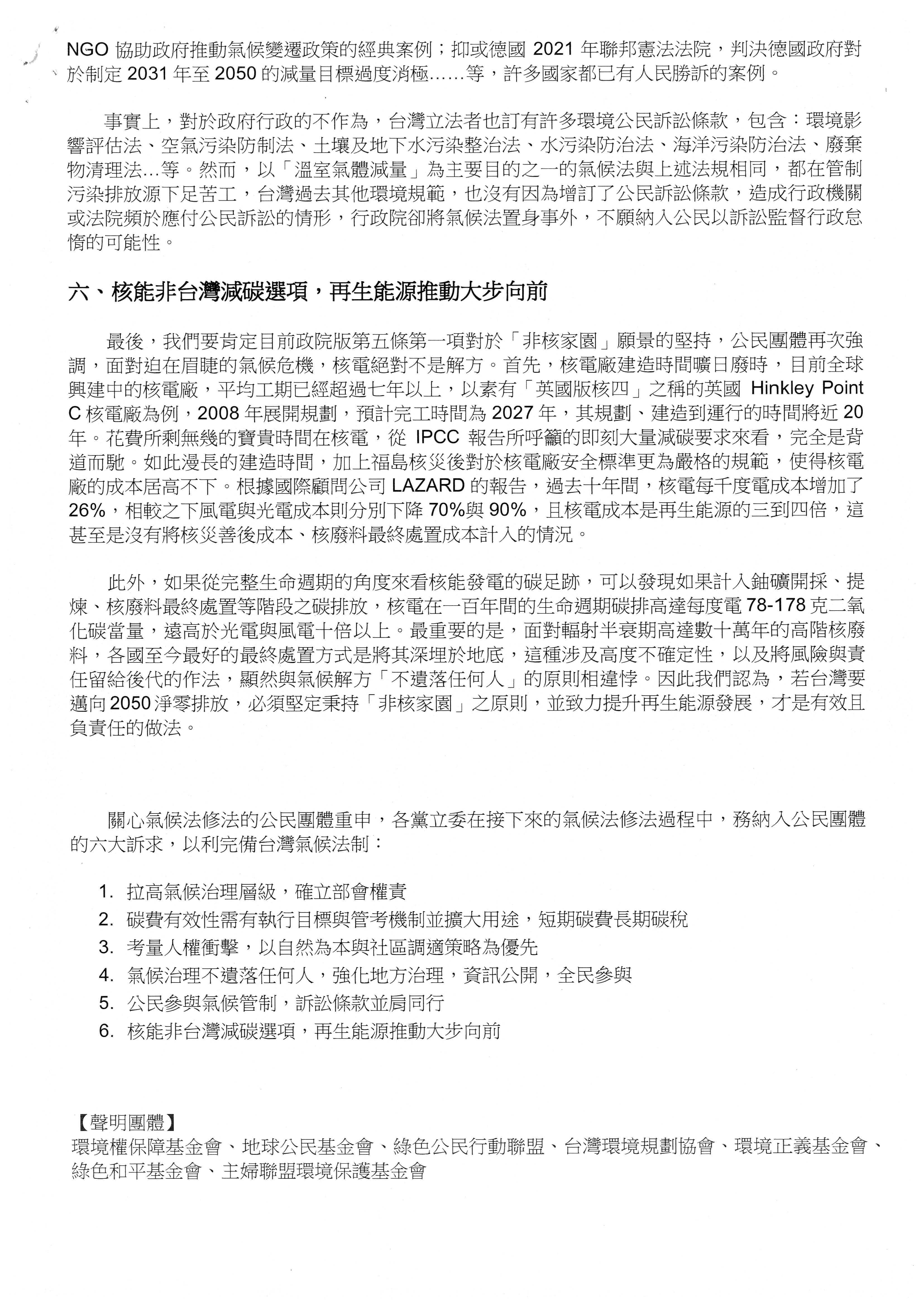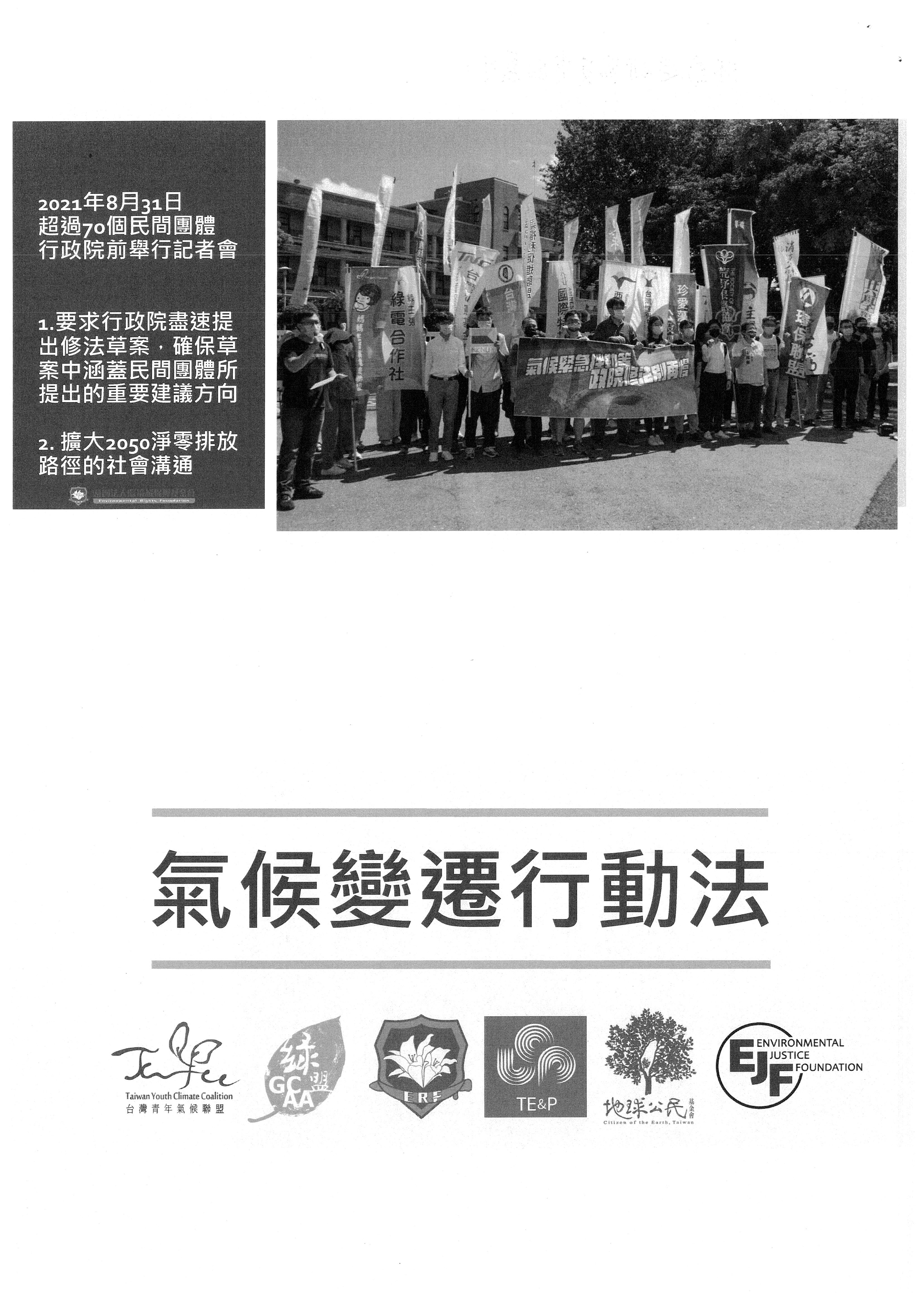 其實去年8月31日的時候,就有超過70個民間團體在行政院前舉行記者會,我們要求行政院儘速提出草案,確保民間團體的重要建議和方向被採納,擴大2050淨零排放路徑的社會溝通。這次行政院總算把他們的草案送進立法院,也希望各黨的立法委員可以採納我們的意見,並納入這次的修法討論,趕快讓這個法通過,相關的氣候治理及路徑才能完備。
