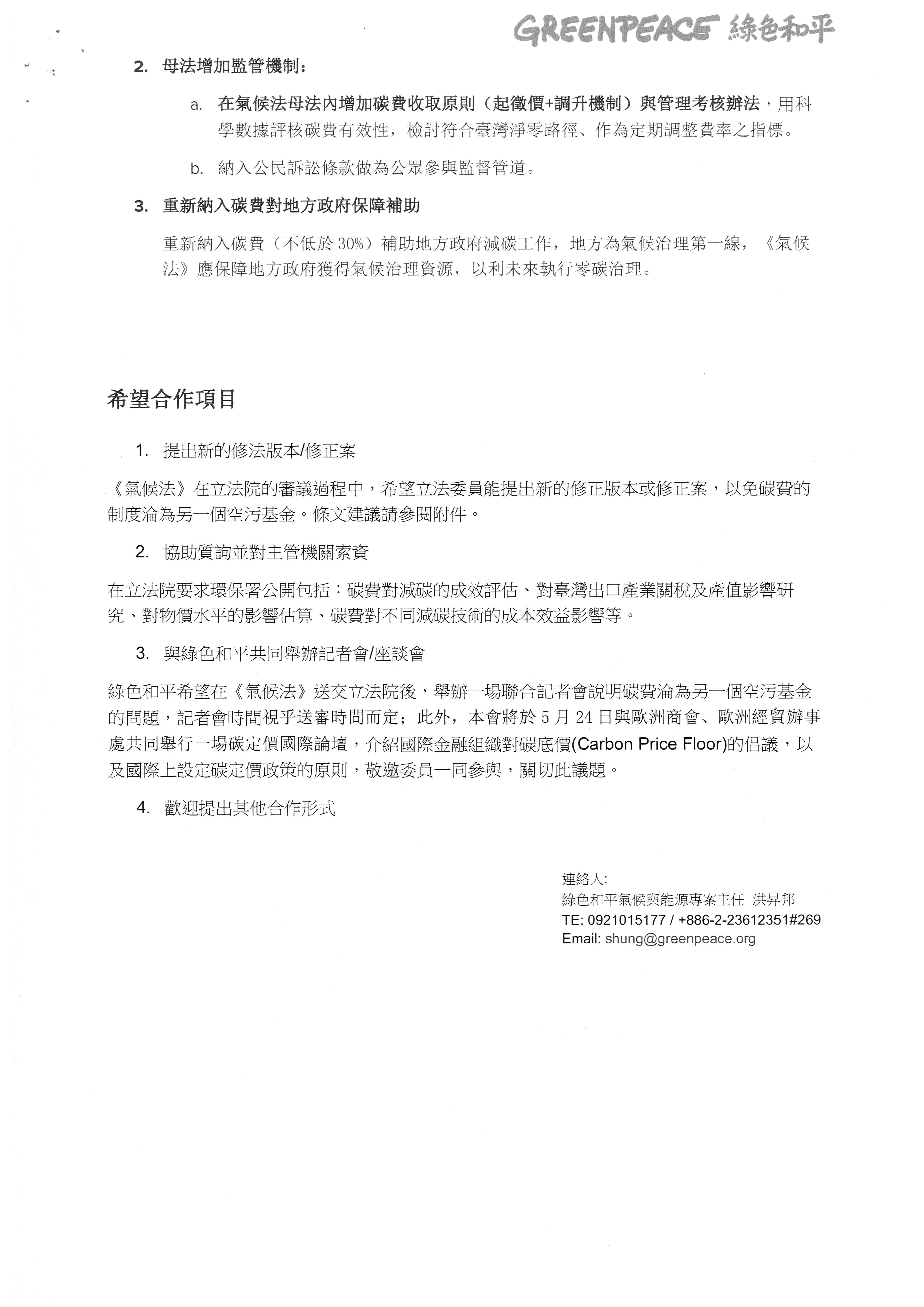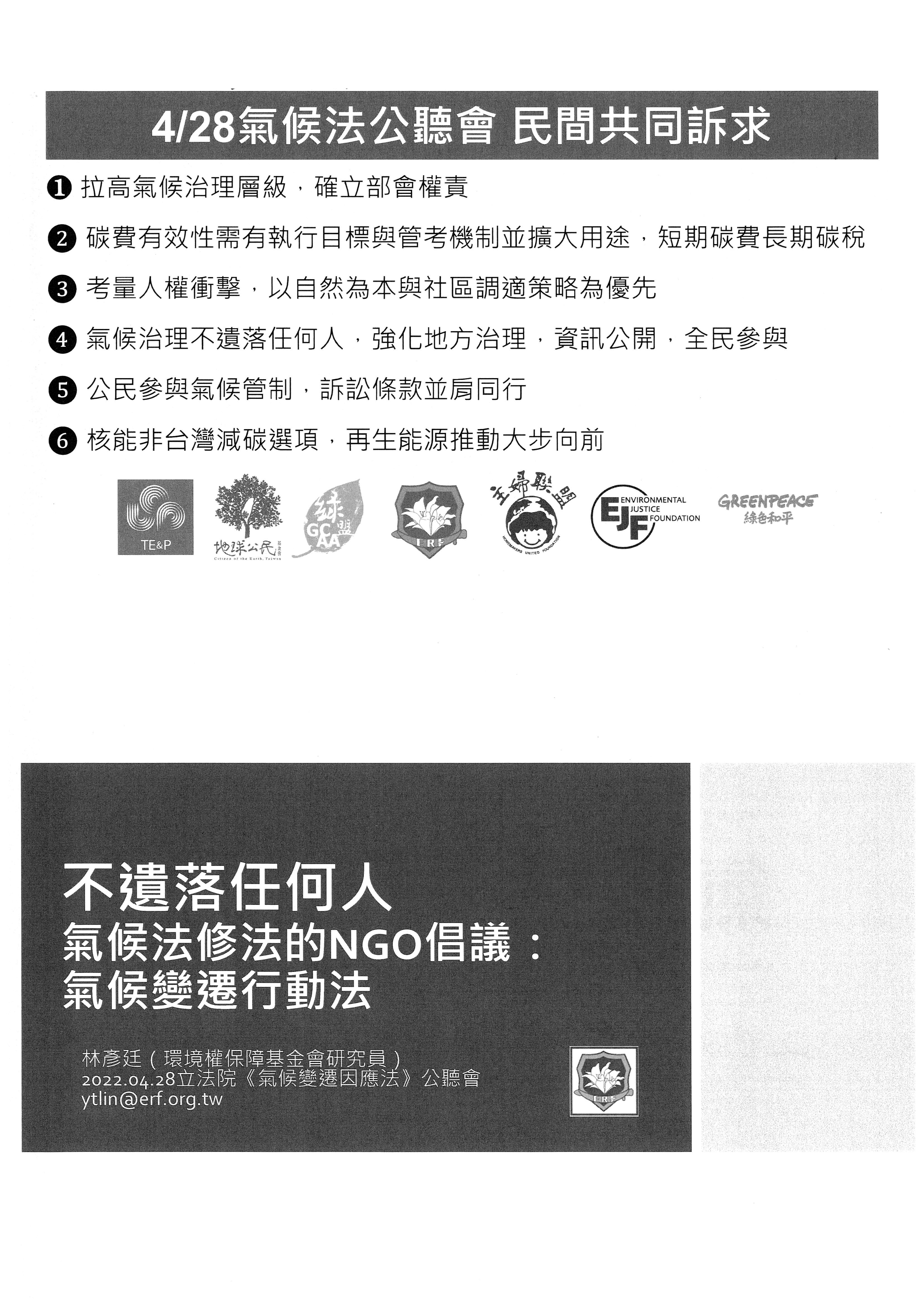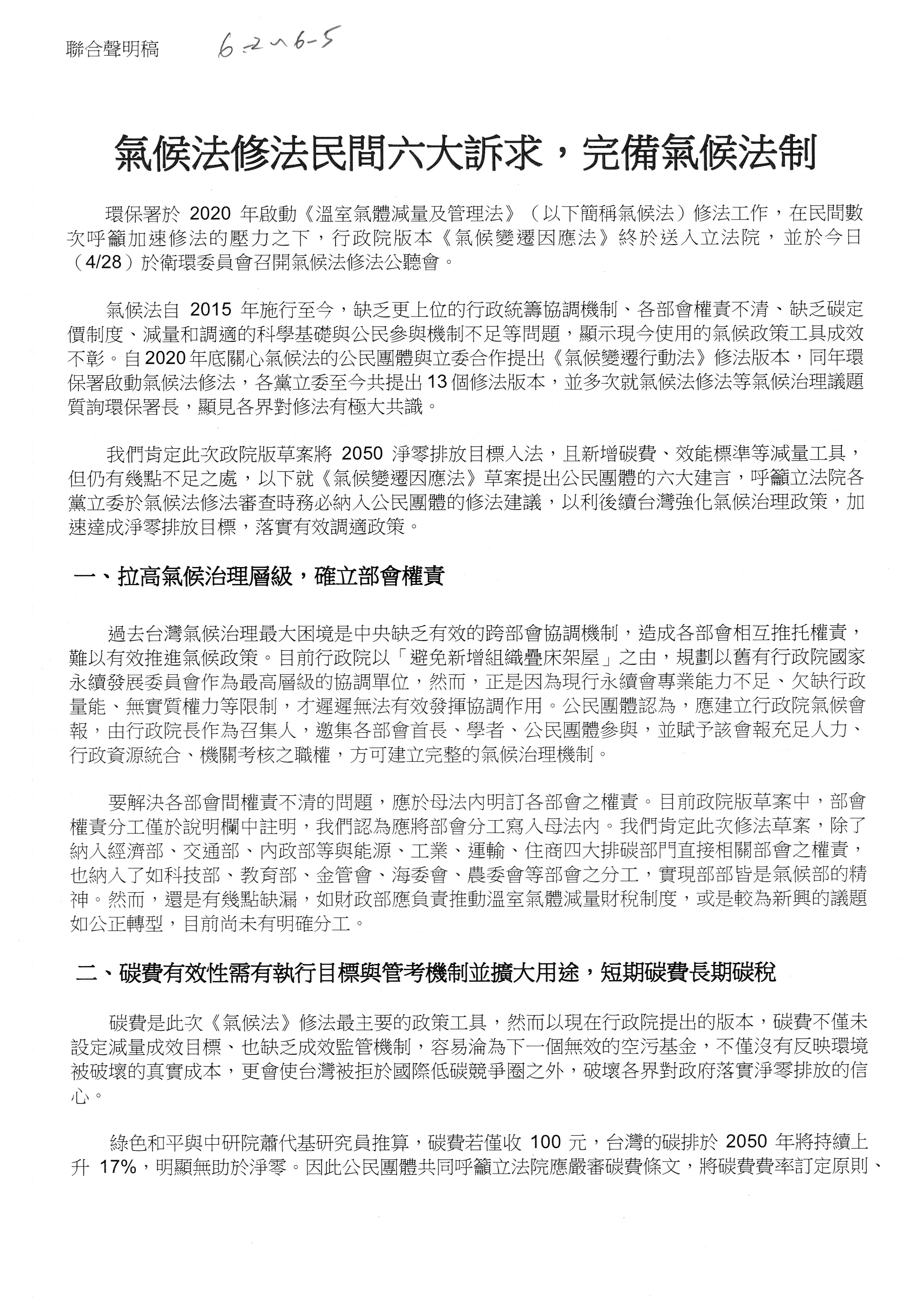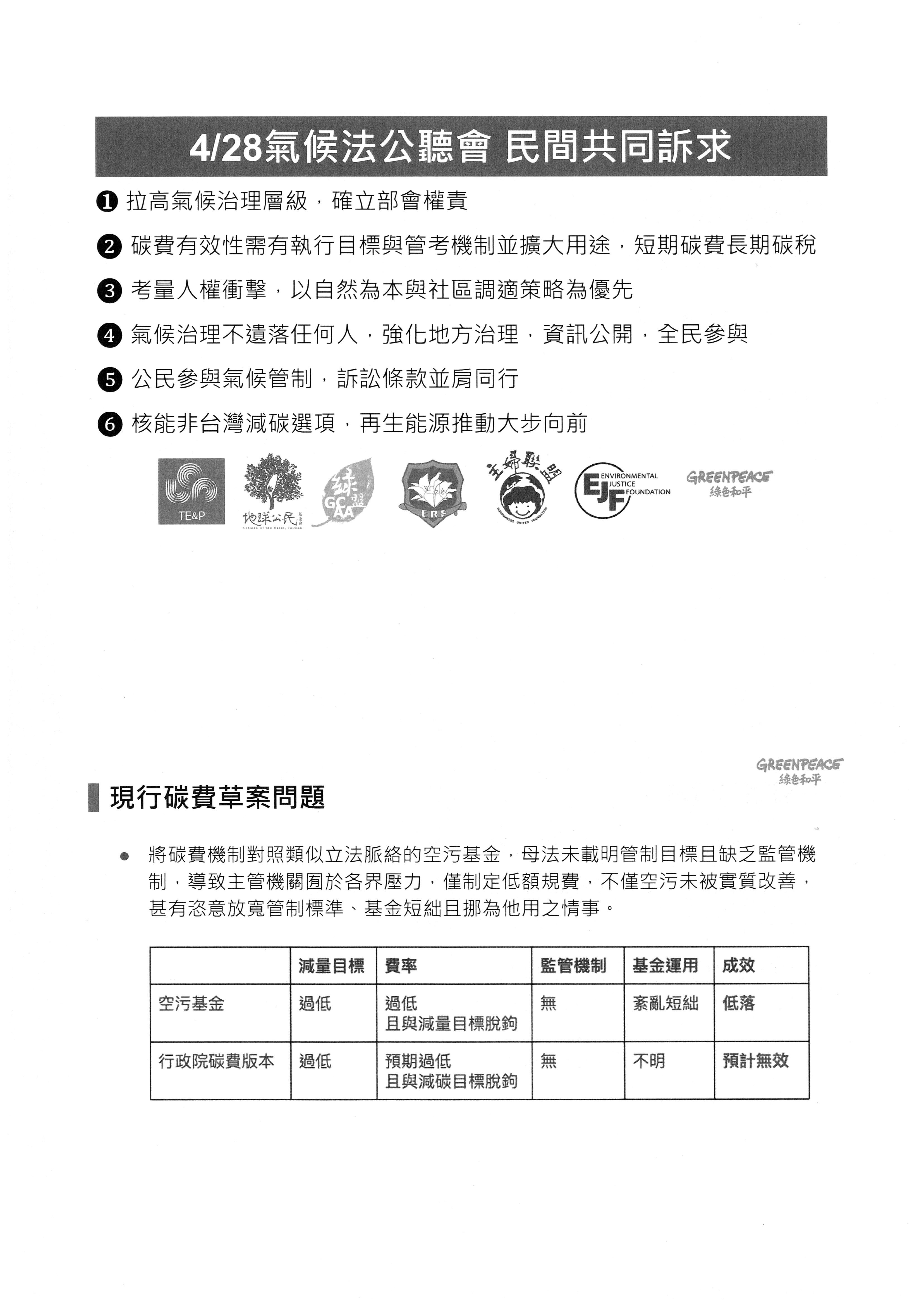 其實去年8月31日的時候,就有超過70個民間團體在行政院前舉行記者會,我們要求行政院儘速提出草案,確保民間團體的重要建議和方向被採納,擴大2050淨零排放路徑的社會溝通。這次行政院總算把他們的草案送進立法院,也希望各黨的立法委員可以採納我們的意見,並納入這次的修法討論,趕快讓這個法通過,相關的氣候治理及路徑才能完備。