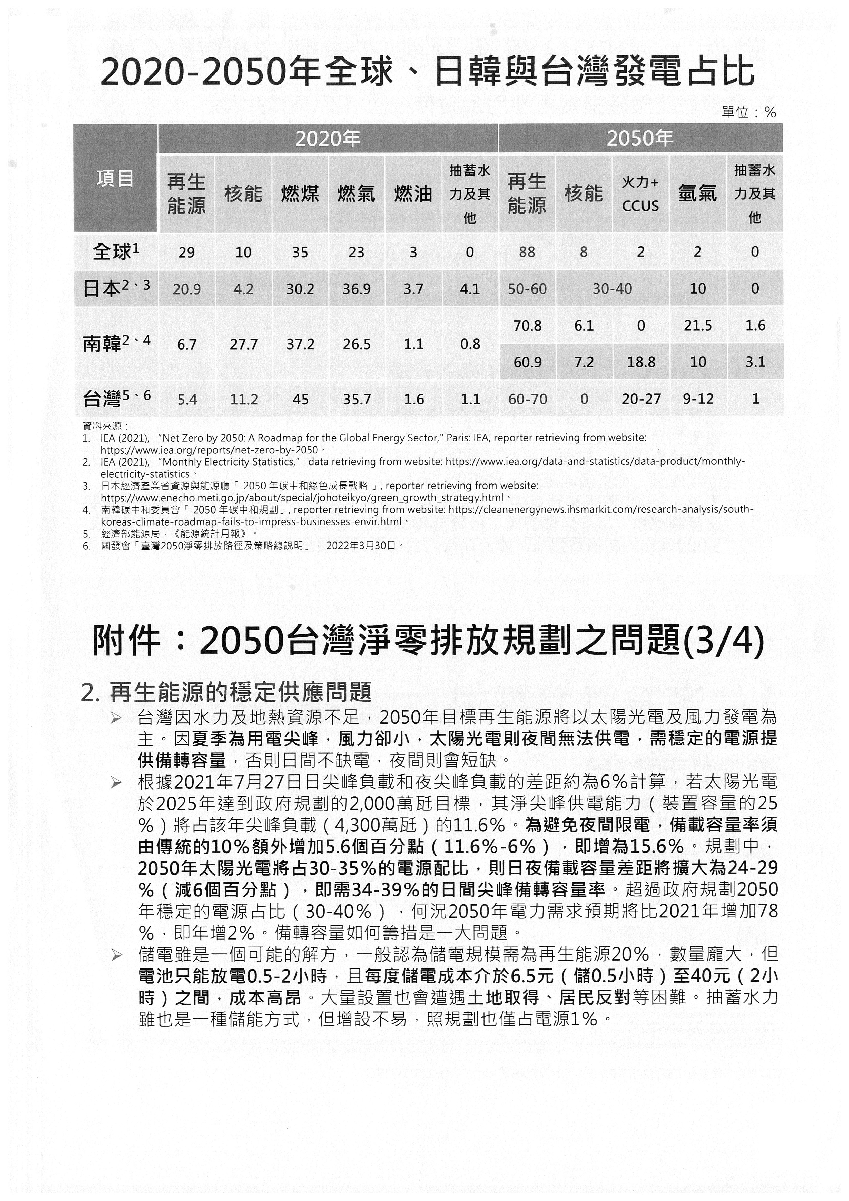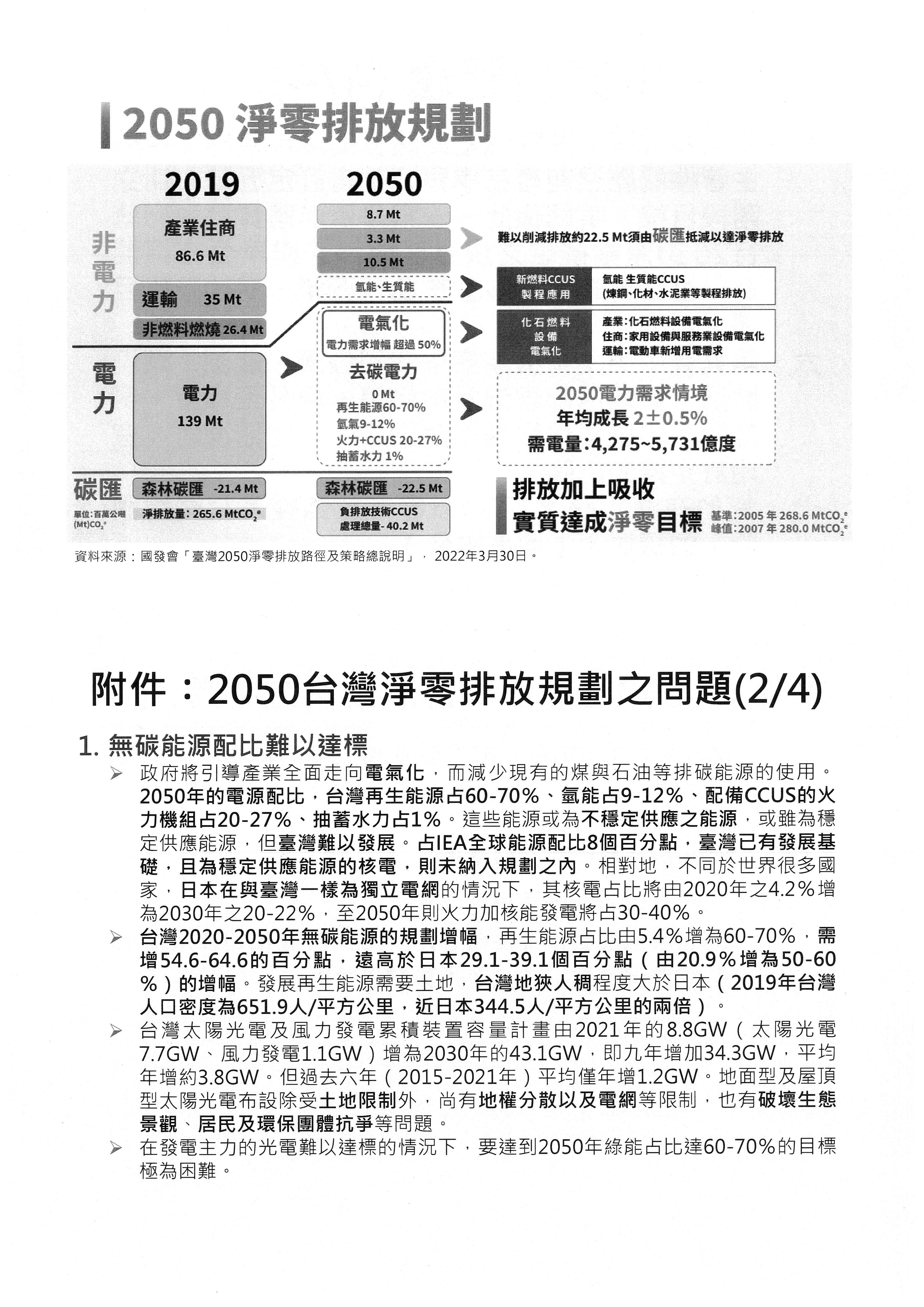 因為時間的關係,我要提的是國發會3月30日公布的「臺灣2050淨零排放路徑及策略總說明」,裡面的內容若要真正執行會有很大的問題。簡單來說,可以看到簡報上的資料,再生能源到2050年會占到60%到70%,跟日本相較,他們是占到50%到60%,我們會比他們高,但以2020年的再生能源的發電占比來看,日本是占21%,我們是占5.4%,所以困難度很高。另外還有晚上沒有電的問題,未來的再生能源比重高的話,那些替代的機組、備轉容量率就要提高,不能讓備轉容量率往下走。最後是預算要從哪裡來?說是從油、電公司來,油、電公司會提供價格補貼,所以能源效率要提高有困難,預算也有困難,謝謝。