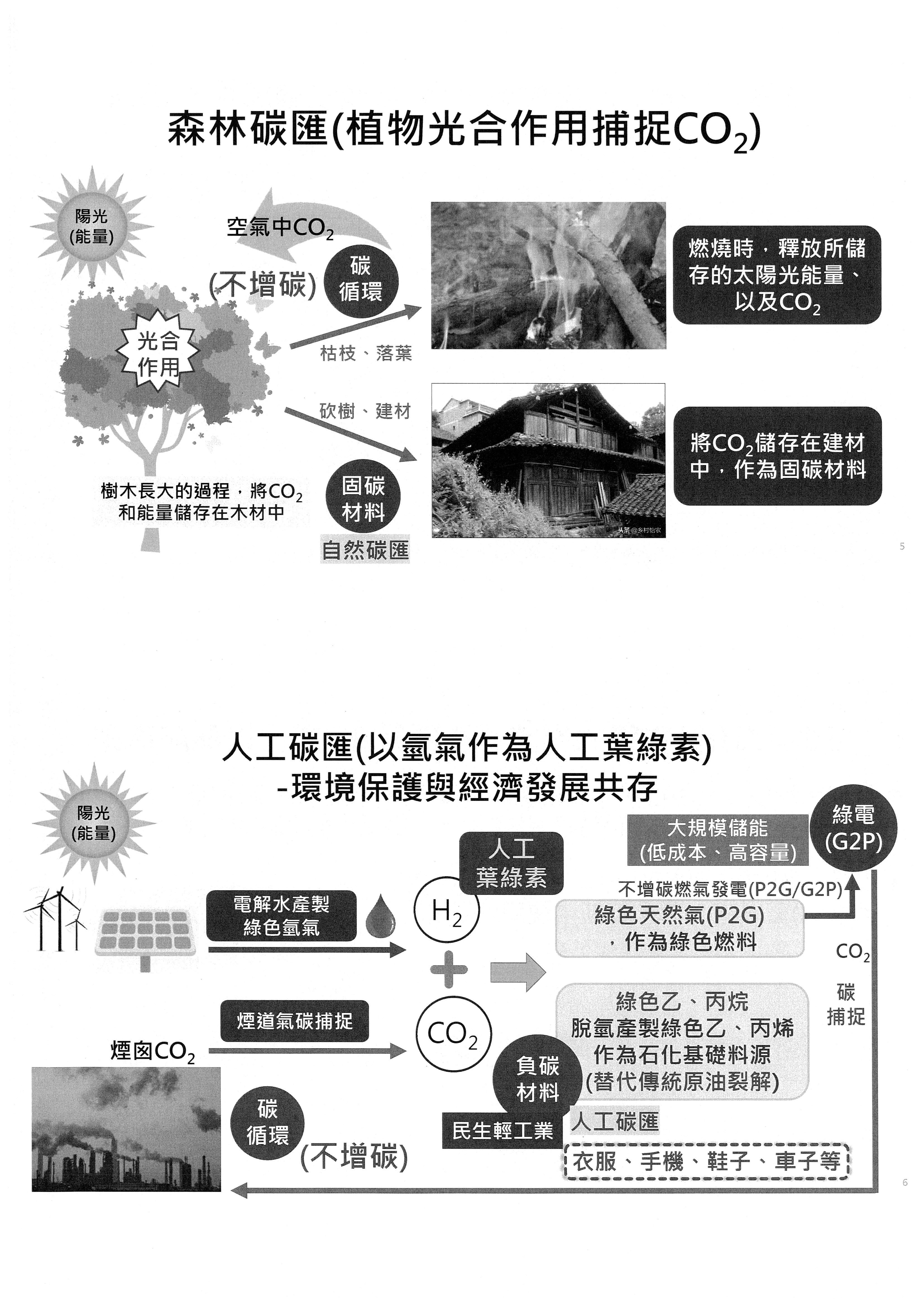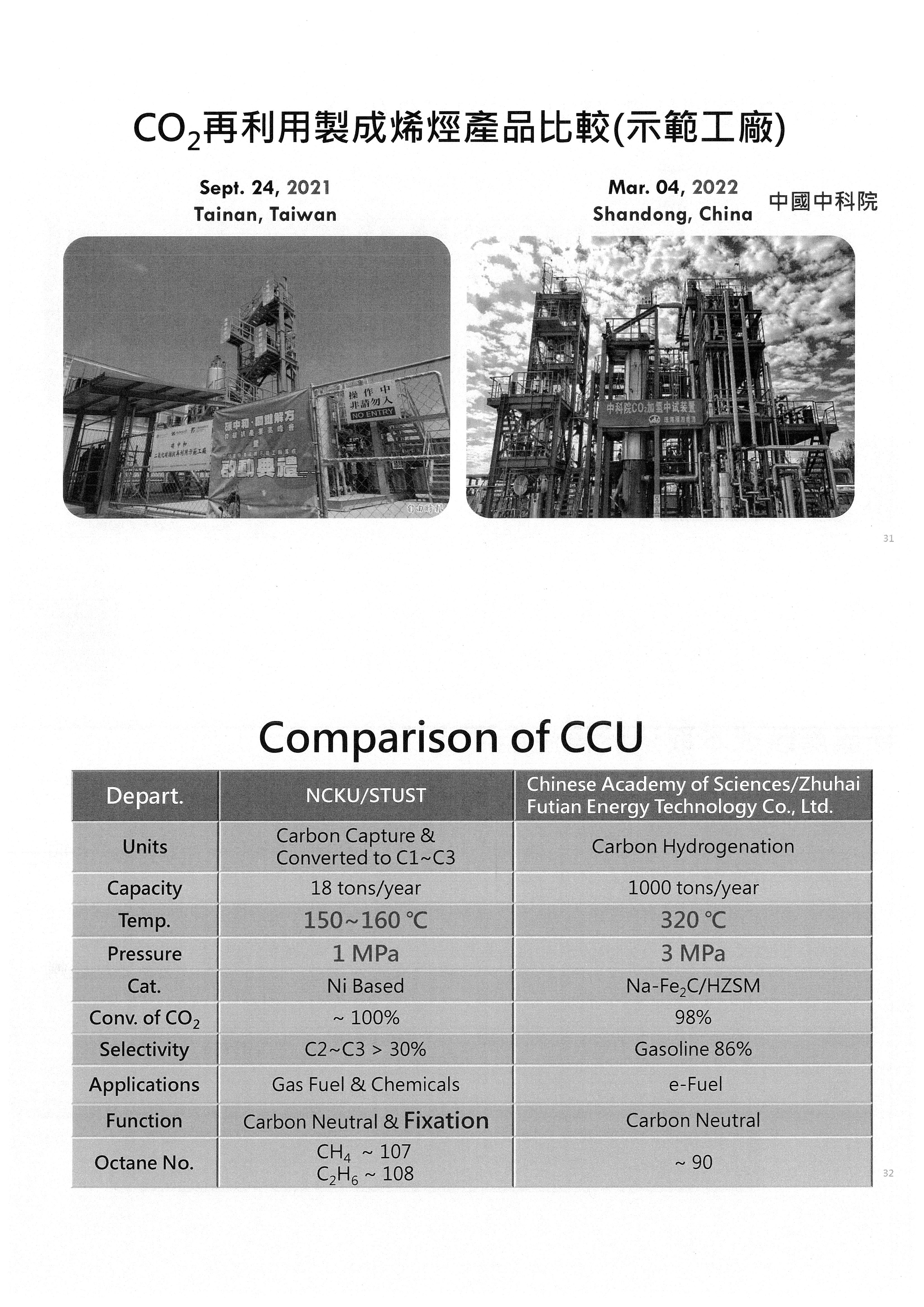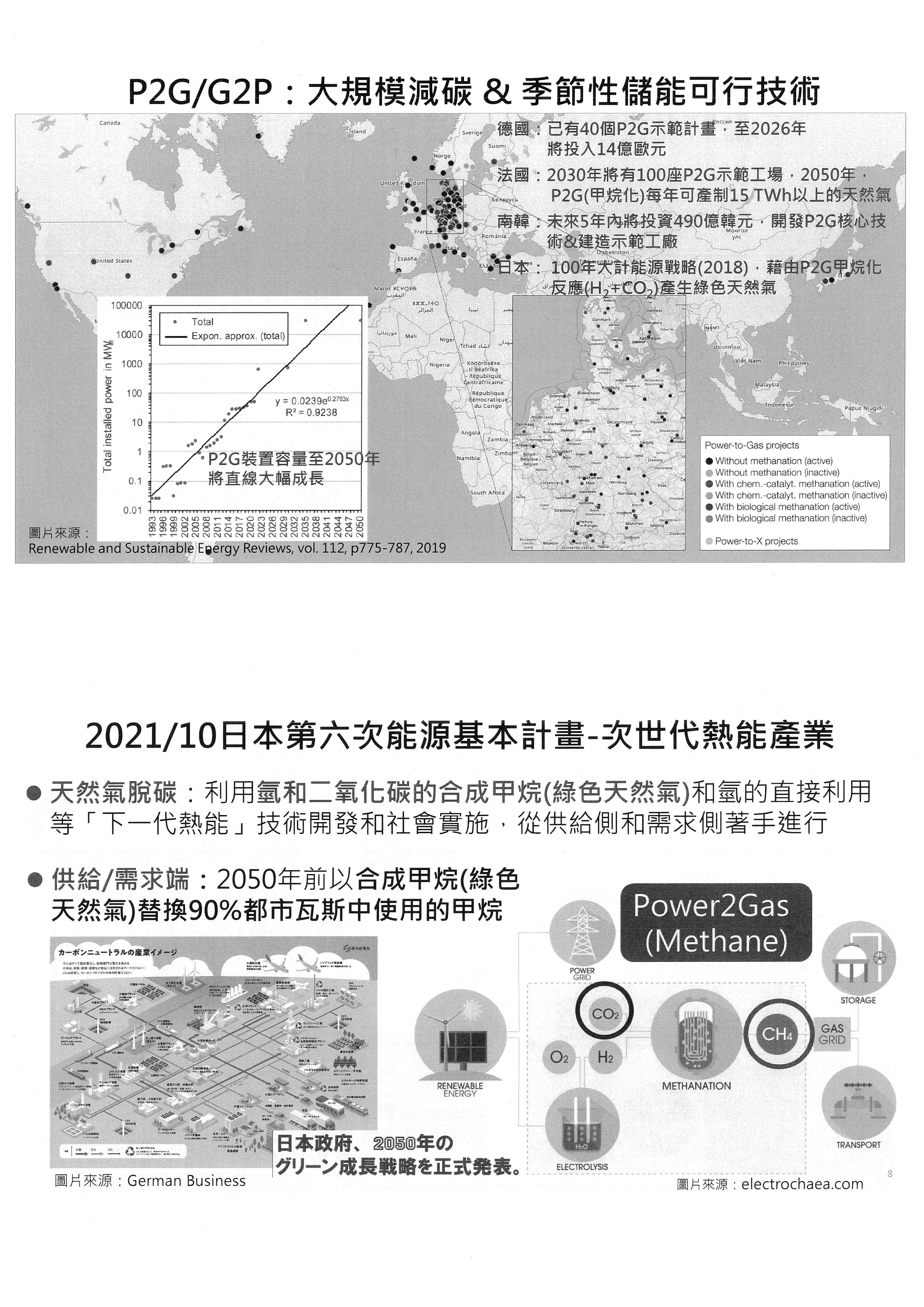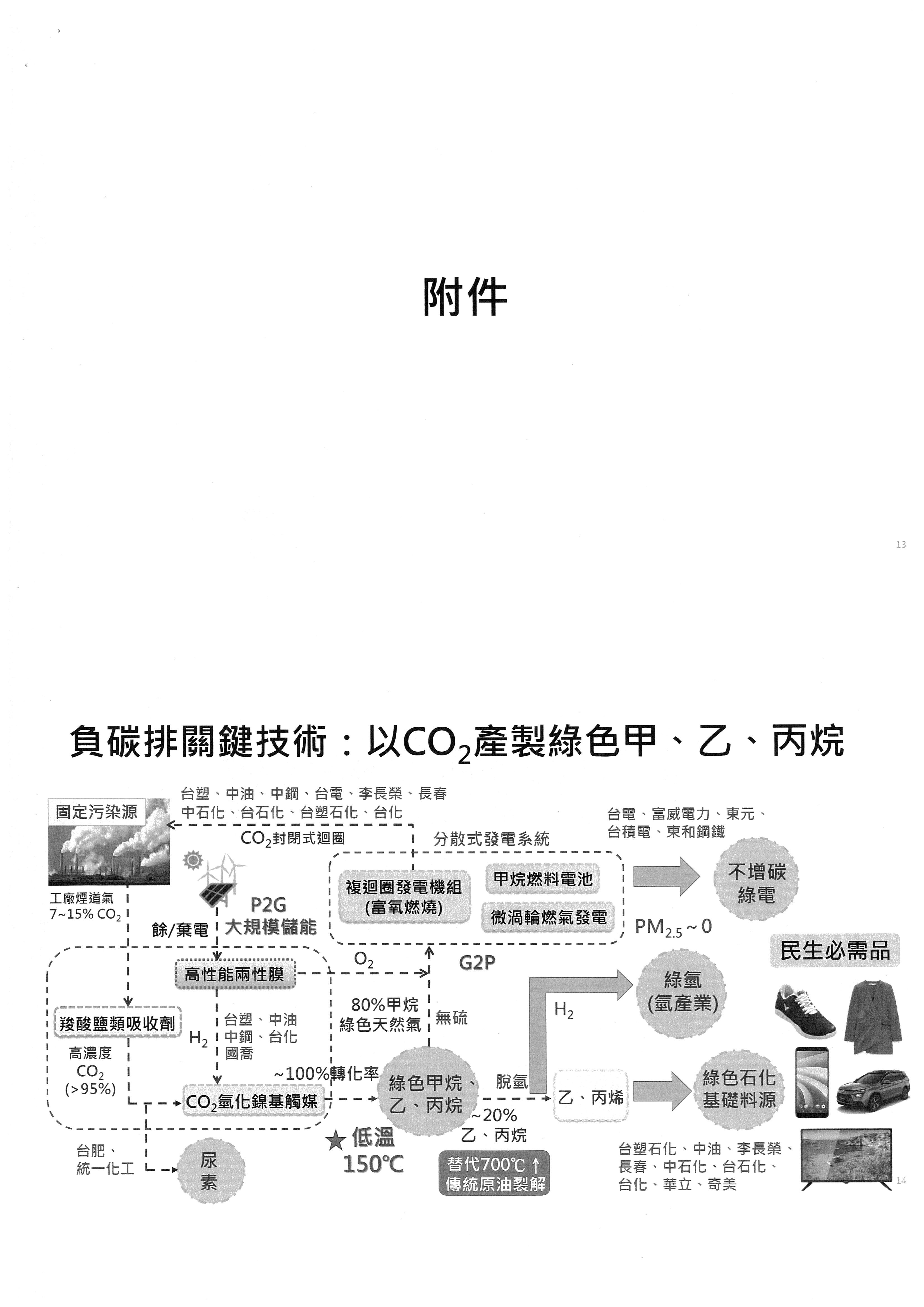 在日本的能源政策裡面,有很多先進提到日本、韓國、歐盟,在日本有規劃天然氣脫碳和供需,也就是利用氫氣和CO2結合起來合成甲烷,這個甲烷是所謂的綠色甲烷,幫助家庭用的。所以在日本的規劃裡面很清楚分為兩個部分,一個是自然界的光合作用,一個是人工光合作用。基於這個理念,我們成大已經蓋出來了,也就是科研計畫,由經濟部、科技部贊助的,這裡面總共有24項專利,我在此鄭重宣布,我願意無償提供出來,不會拿半毛錢,因為很多先進認為我要賺錢,我沒有要賺錢,因為我要退休了,我人生的最後一站要把這個技術奉獻給國家,現在已經蓋一個工廠了,我在此鄭重宣布。所以這個是最重要的,我們要轉型,尤其是剛剛所提到的,除了甲烷以外,還有乙、丙烷,乙、丙烷是石化原料,石化是民生必需品的供應,但是我們這個製程很重要的是溫度是150度,不需要到7、800度,大家都知道溫度越高,排碳量越大,所以我們今天把它降到150度,排碳量就減少了,可以讓臺灣的石化業利用這個機會來轉型。當然大家還會講到氫氣,以後等到有技術的時候再講。