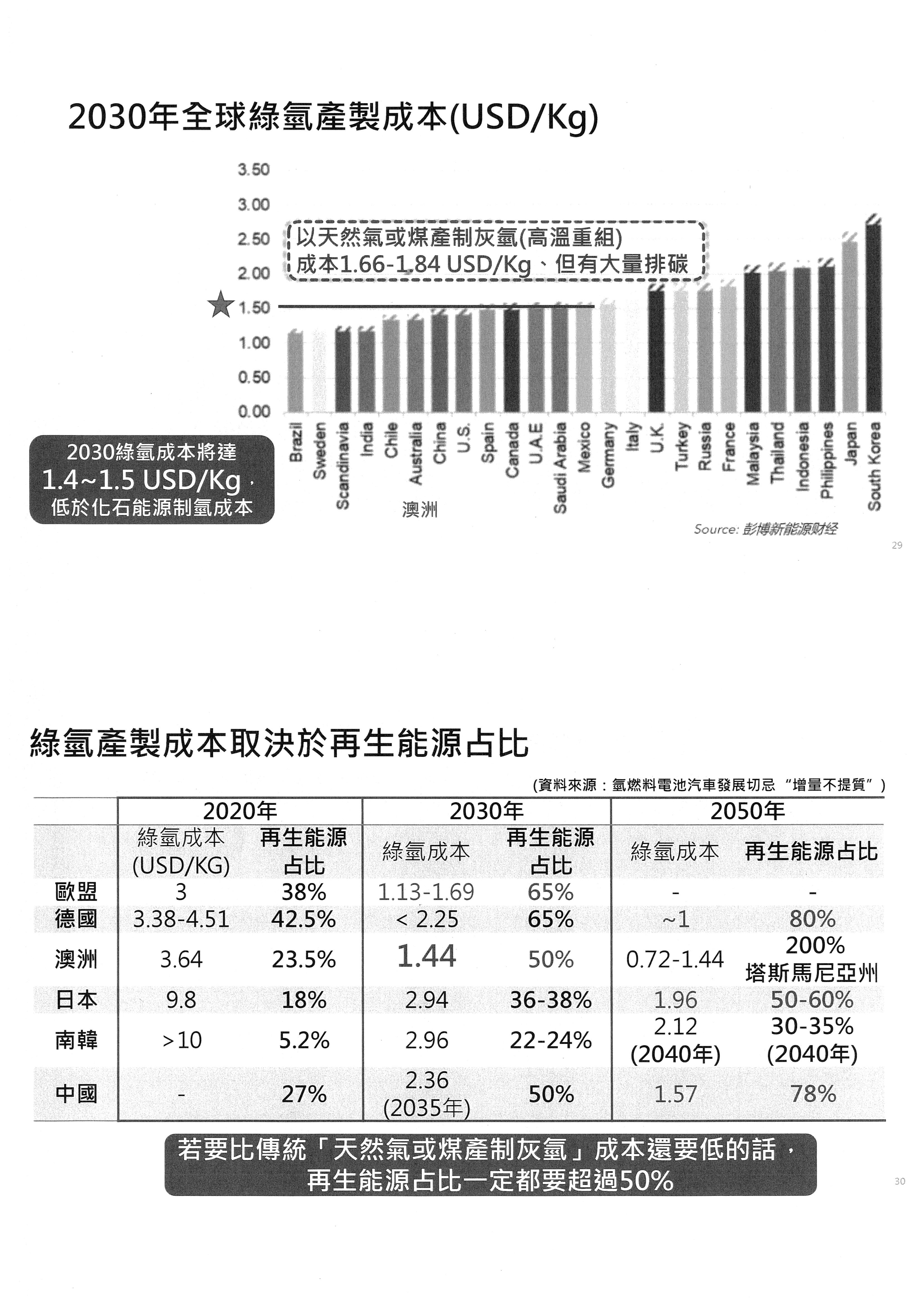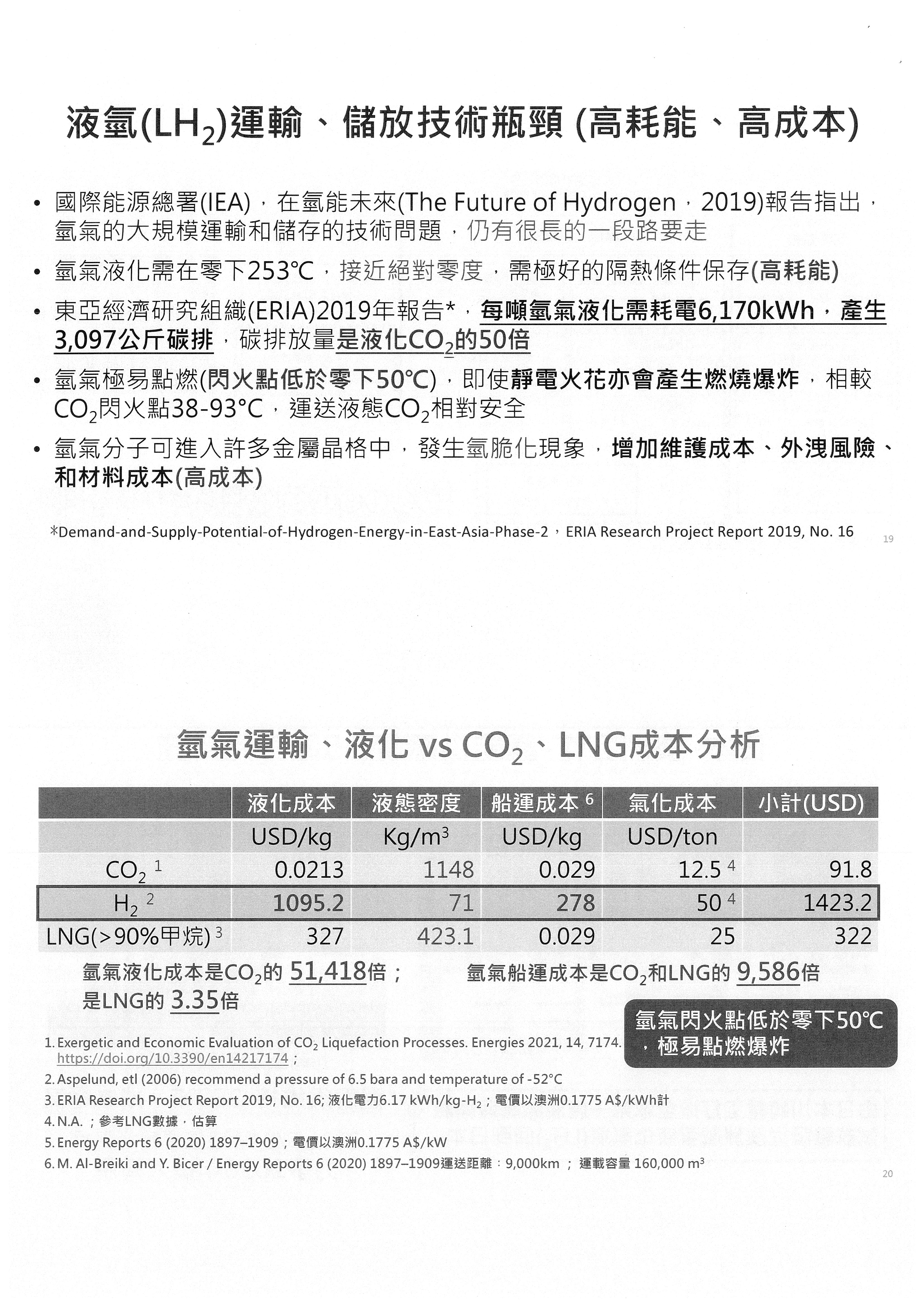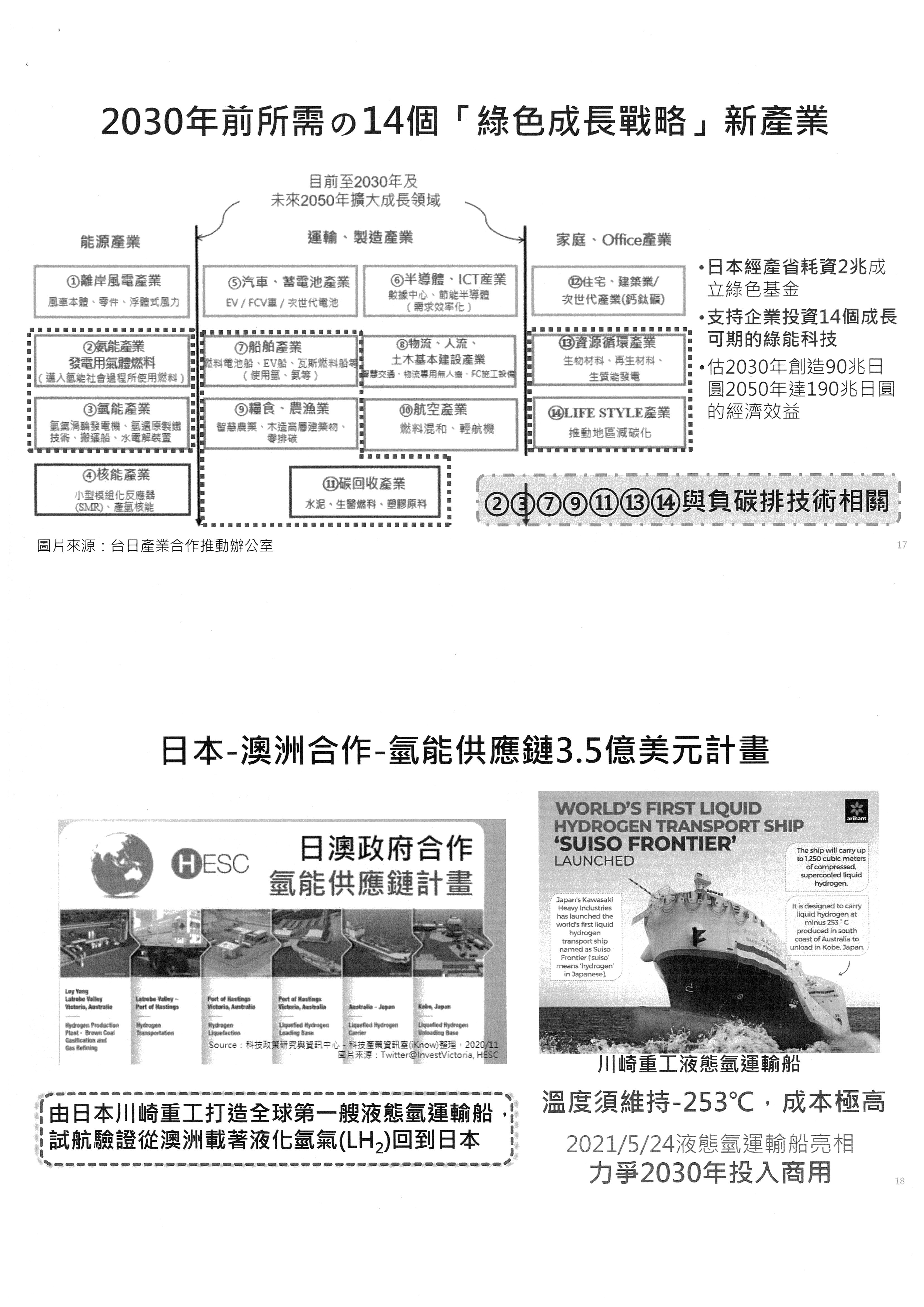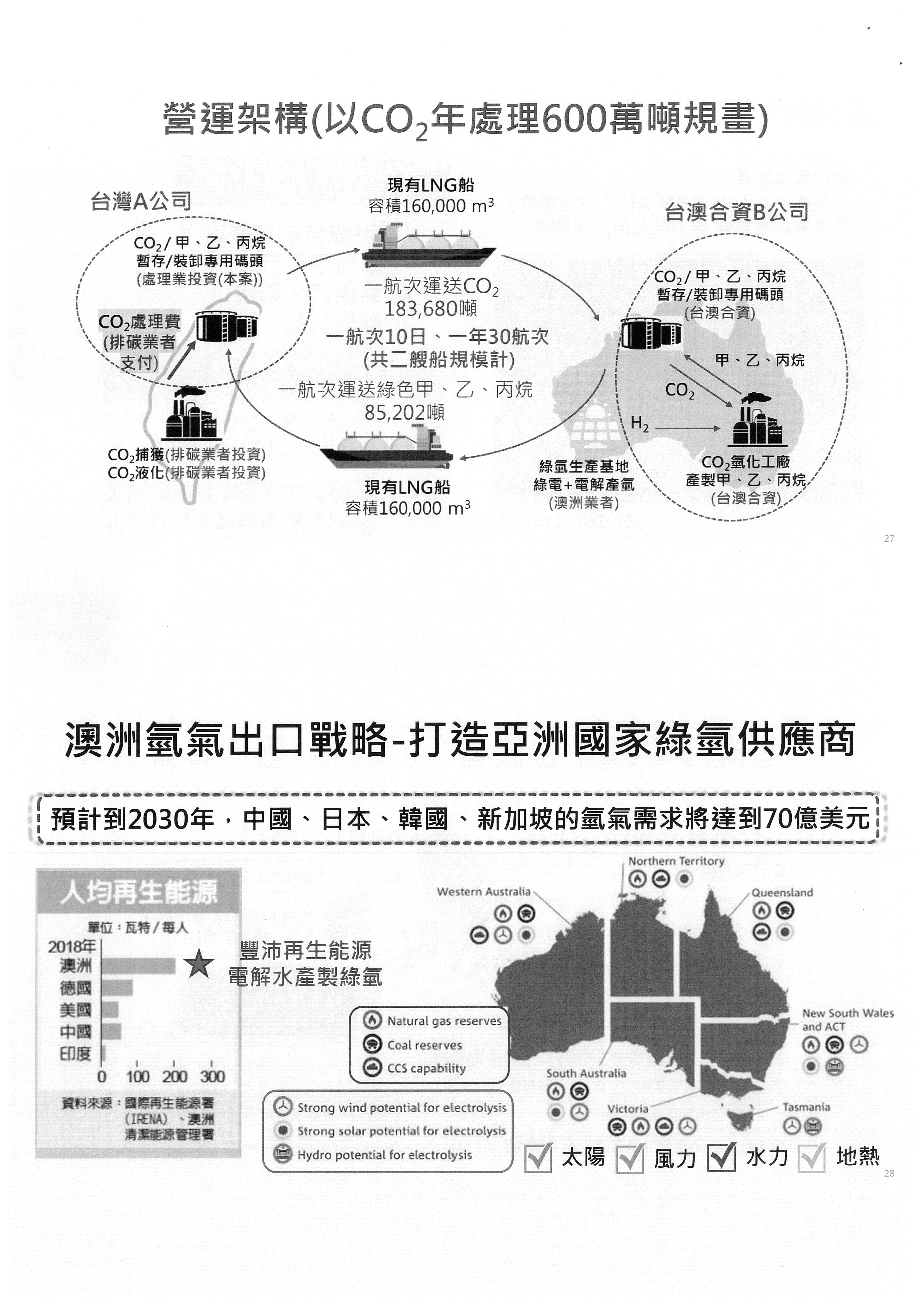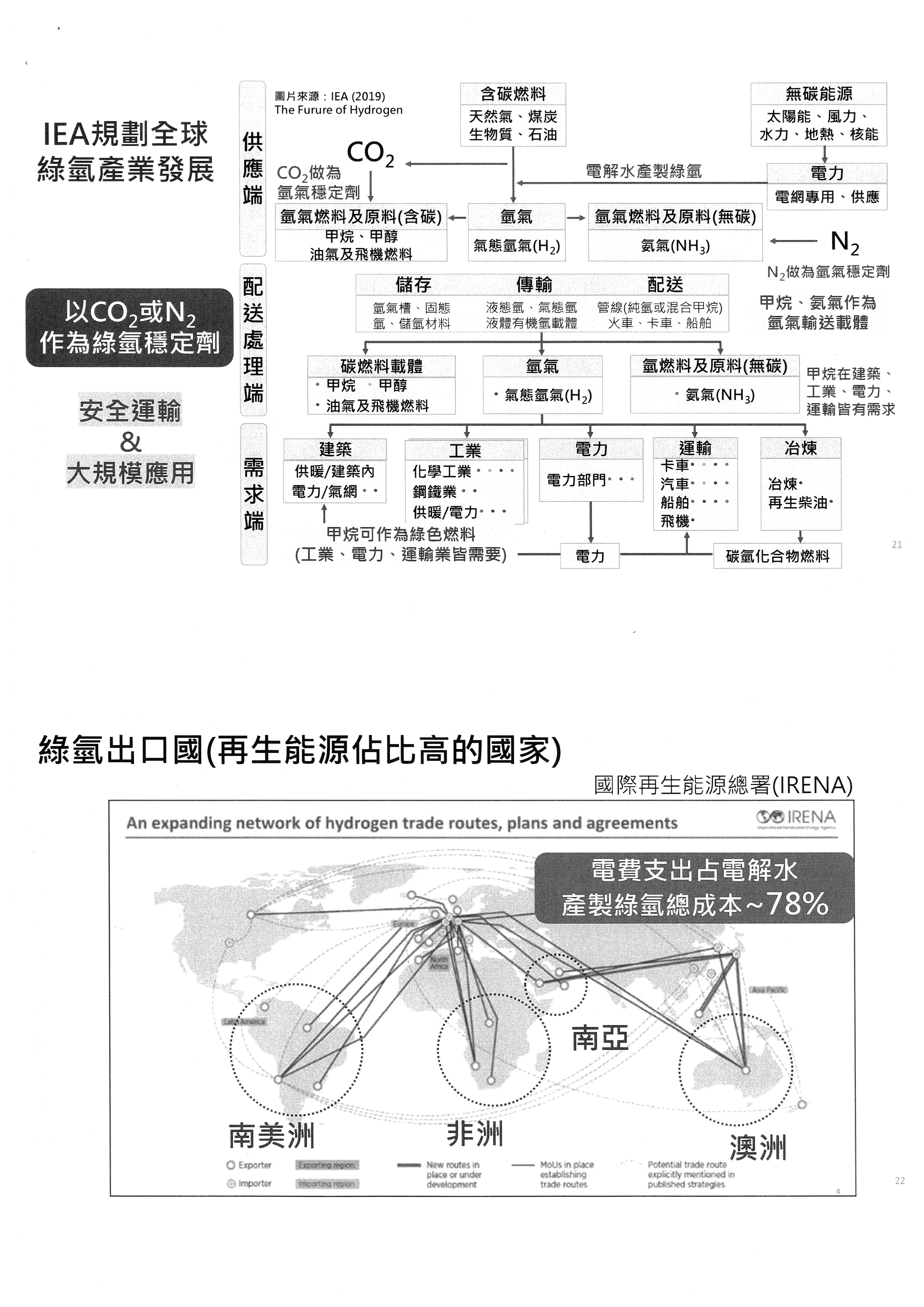 在日本的能源政策裡面,有很多先進提到日本、韓國、歐盟,在日本有規劃天然氣脫碳和供需,也就是利用氫氣和CO2結合起來合成甲烷,這個甲烷是所謂的綠色甲烷,幫助家庭用的。所以在日本的規劃裡面很清楚分為兩個部分,一個是自然界的光合作用,一個是人工光合作用。基於這個理念,我們成大已經蓋出來了,也就是科研計畫,由經濟部、科技部贊助的,這裡面總共有24項專利,我在此鄭重宣布,我願意無償提供出來,不會拿半毛錢,因為很多先進認為我要賺錢,我沒有要賺錢,因為我要退休了,我人生的最後一站要把這個技術奉獻給國家,現在已經蓋一個工廠了,我在此鄭重宣布。所以這個是最重要的,我們要轉型,尤其是剛剛所提到的,除了甲烷以外,還有乙、丙烷,乙、丙烷是石化原料,石化是民生必需品的供應,但是我們這個製程很重要的是溫度是150度,不需要到7、800度,大家都知道溫度越高,排碳量越大,所以我們今天把它降到150度,排碳量就減少了,可以讓臺灣的石化業利用這個機會來轉型。當然大家還會講到氫氣,以後等到有技術的時候再講。