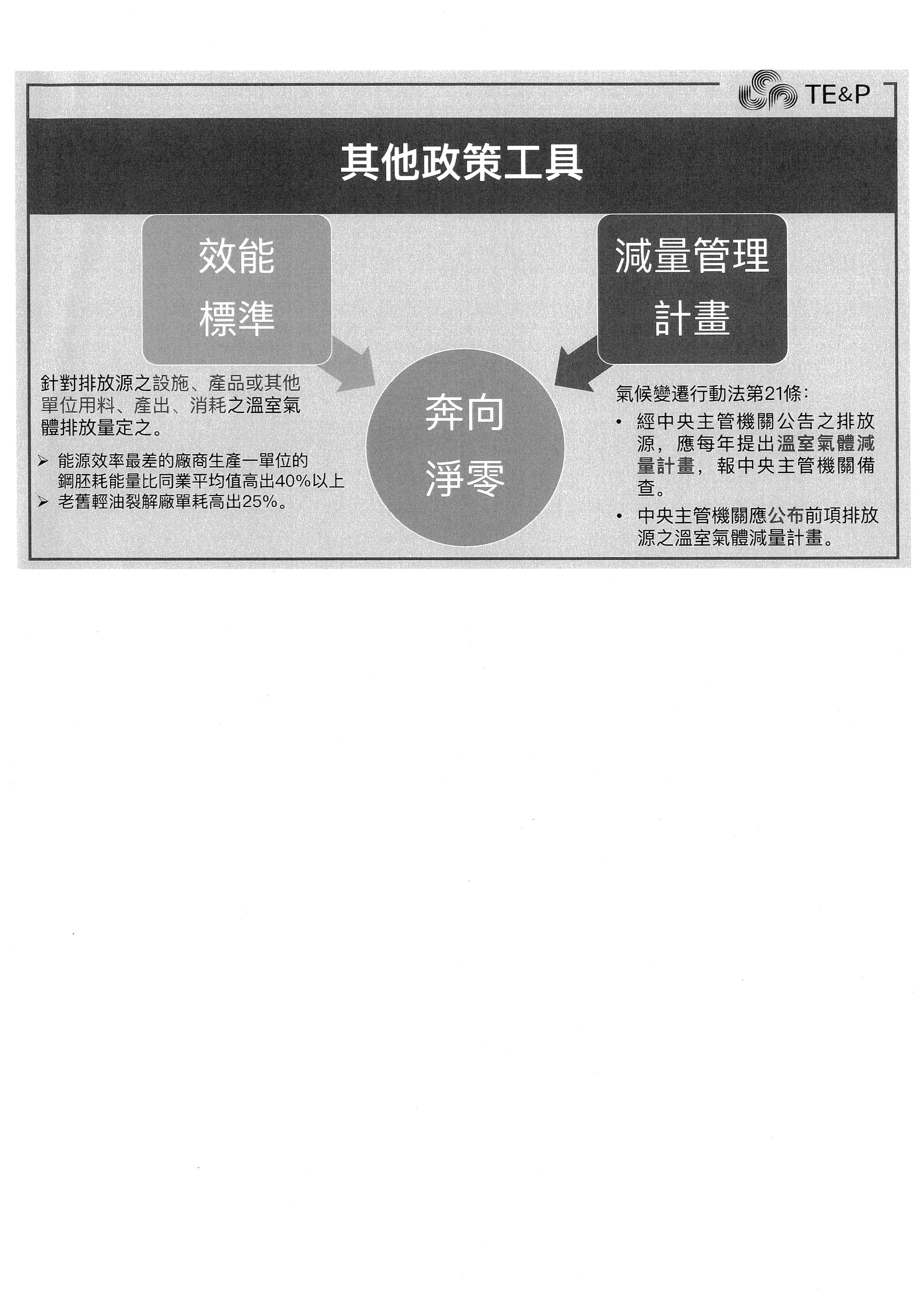 只靠碳定價無法達到充分減碳的效果,所以我們還要搭配其他的政策工具。目前明定在這部法裡的是效能標準這個政策工具,我知道在座很多企業對這一塊其實有諸多疑慮,連經建主管機關也有很多疑慮。但我們要說的是,效能標準在減量上是一個非常重要的工具,在後續的設計上可以仿效美國的作法,也就是有一個可交易性的效能標準移轉工具,讓它比較有彈性,所以我們還是認為應該要訂定效能標準,並且一定要將它明確入法。目前以鋼鐵業來講,效能最差的產業,生產一噸鋼鐵的耗電量其實比平均耗電量多出了四成以上,所以這些都要藉由效能標準加以矯正。