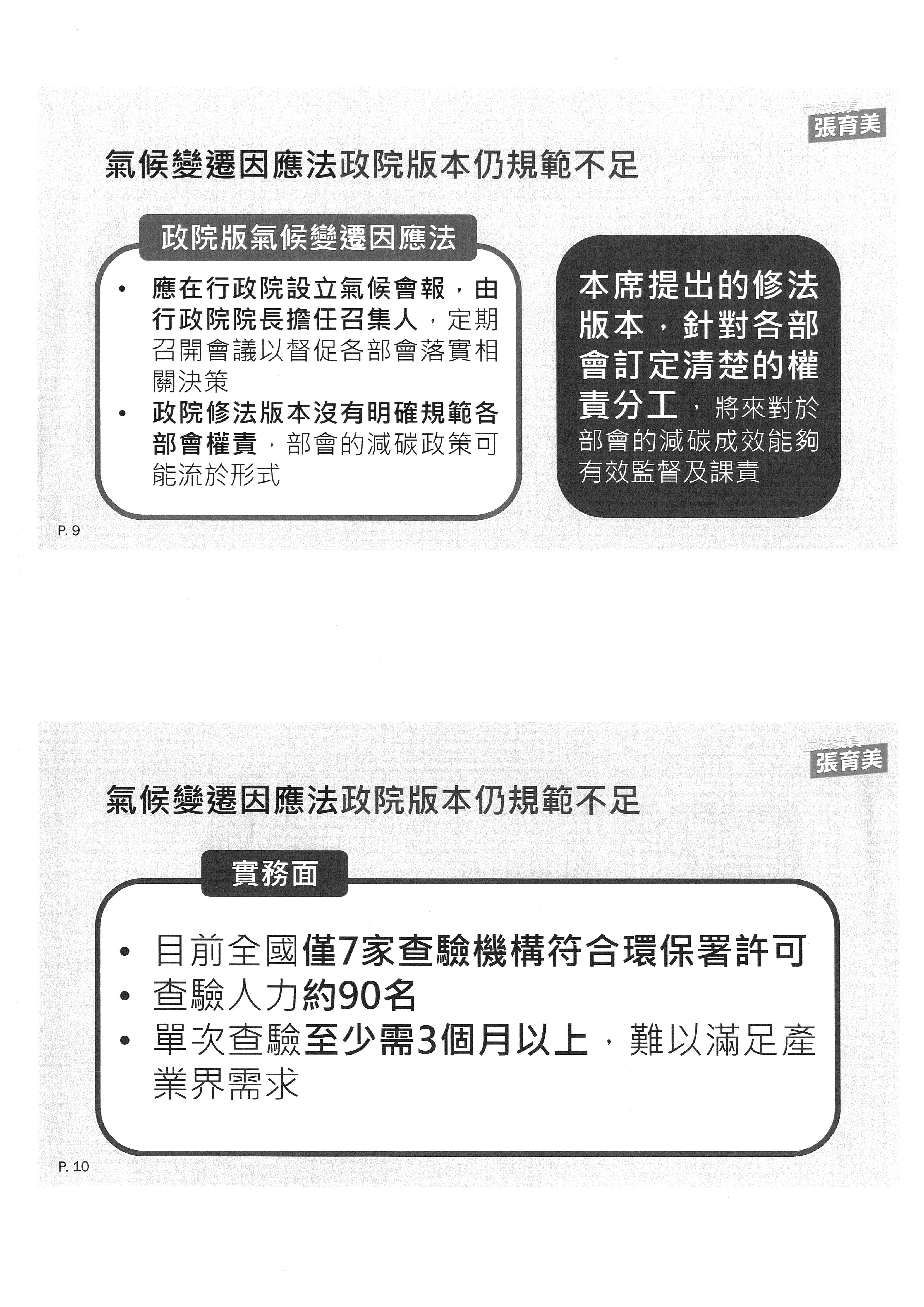 我自己會覺得努力這麼多年,這個國家在關於減碳的努力,坦白講做得非常、非常不好,因為一直要開發工業區,現在農地違章工廠那麼多,就是很多違法的工業還在農地,農地的破壞也越來越多,但是政府也沒辦法好好管理,所以環境資源部的成立是很重要的,但是政府不做、執政黨不做。在應付世界的趨勢,有必要去立氣候變遷因應法的當前,我們也感謝大家一起來監督,但追根究底還是請政府一定要努力產業轉型及總量管制,不能一直用一個算不準的量,然後一直不願意負責;要做好健康風險評估,訂真正的總量風險評估、流行病學調查,這樣中南部很多重工業區的鄰近區民就不會是目前政府錯誤產業下的犧牲者。