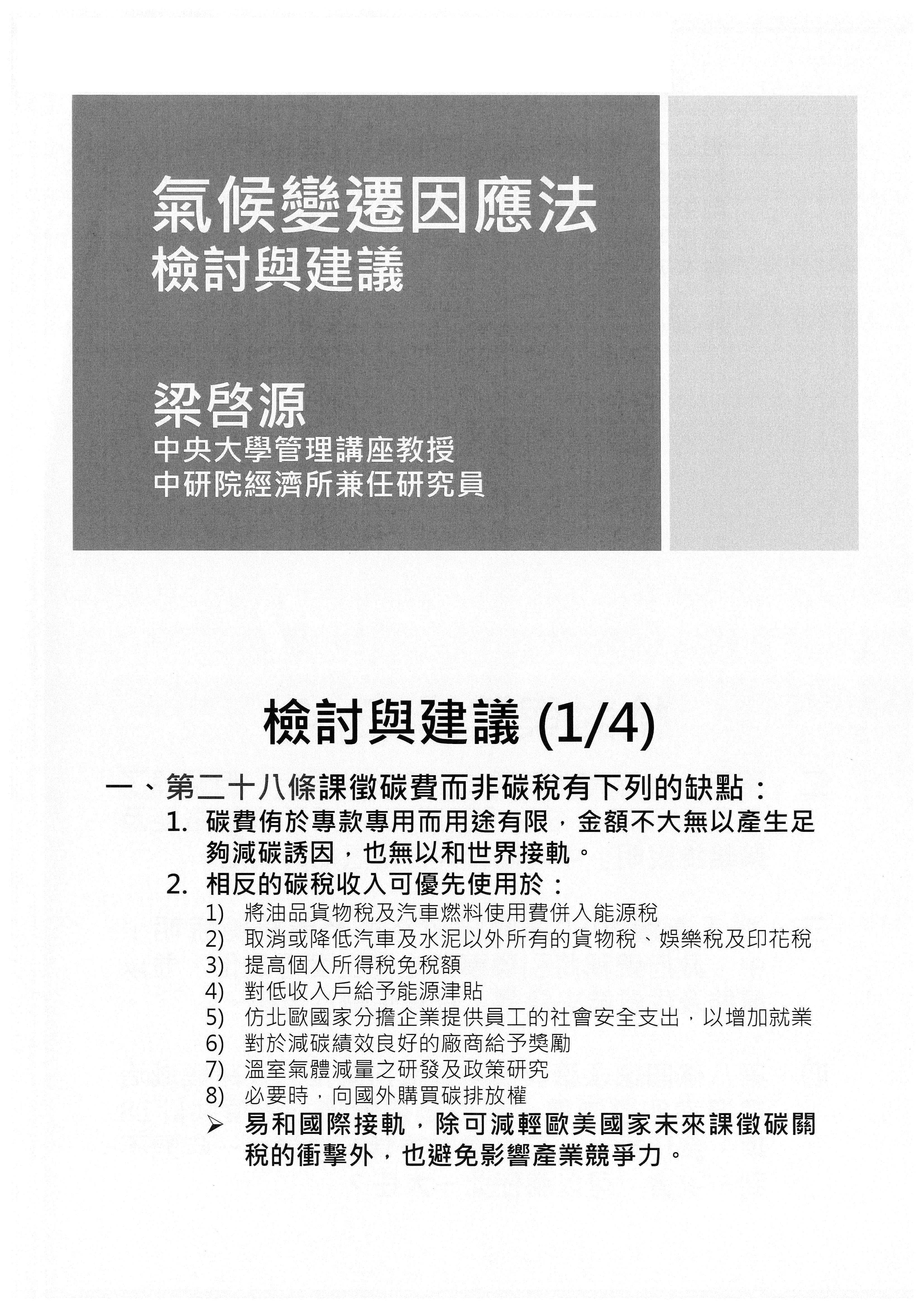 梁啟源管理講座教授:各位政府代表、委員、各位專家,今天我就簡單地針對氣候變遷因應法提出一些建議。首先有關碳費的課徵,2015年召開了兩次全國能源會議,其共識就是要課徵碳稅,但我認為碳稅的課徵會比繳交碳費好,因為大家都認為碳費的金額不大,金額不大的原因與預算有關,而預算要專款專用,其使用還有一些限制,就像空污費也有專款專用的限制。如果金額很大,卻又沒有辦法花用的話,這就是個問題;如果金額太小,對減碳的誘因就不大,所以金額本身就是一個問題,因為碳費就有這樣的限制,至於碳稅跟碳交易基本上則比較容易與世界接軌。