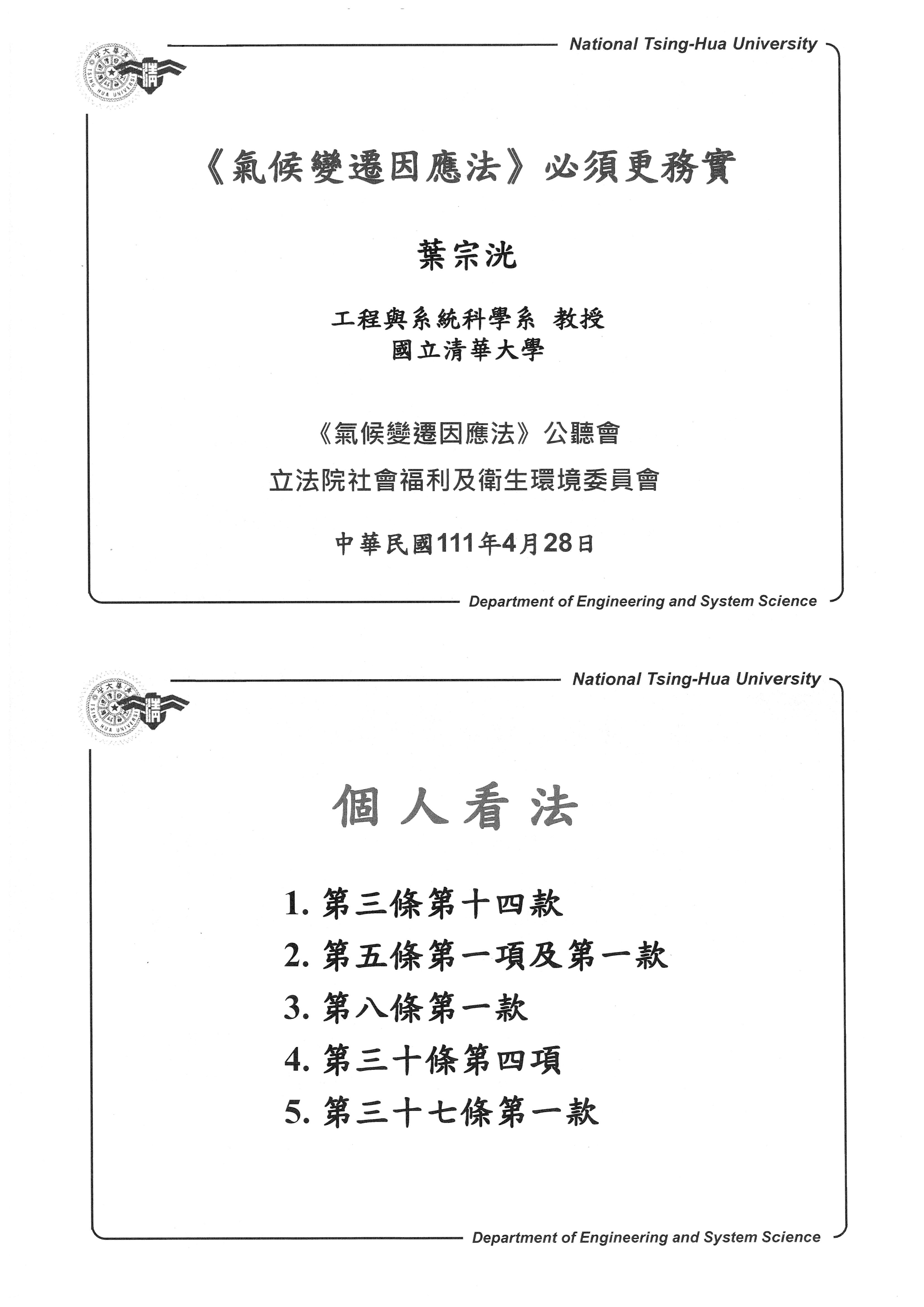 陳志勇特聘教授:主席、與會先進。我想很多委員都提到所謂淨零排碳相關問題,淨零排碳不是國內法,是聯合國的,很清楚地,今天如果臺灣不做,不只來自人民的壓力,聯合國也會來干涉。所以我今天想跟大家分享一下,淨零排放關係到全球的未來發展,因為人類所造成的浩劫,氣候異常已經是進行式,不是未來式,因此現在很重要的是我們要立即行動,不是嘴巴喊一喊而已。