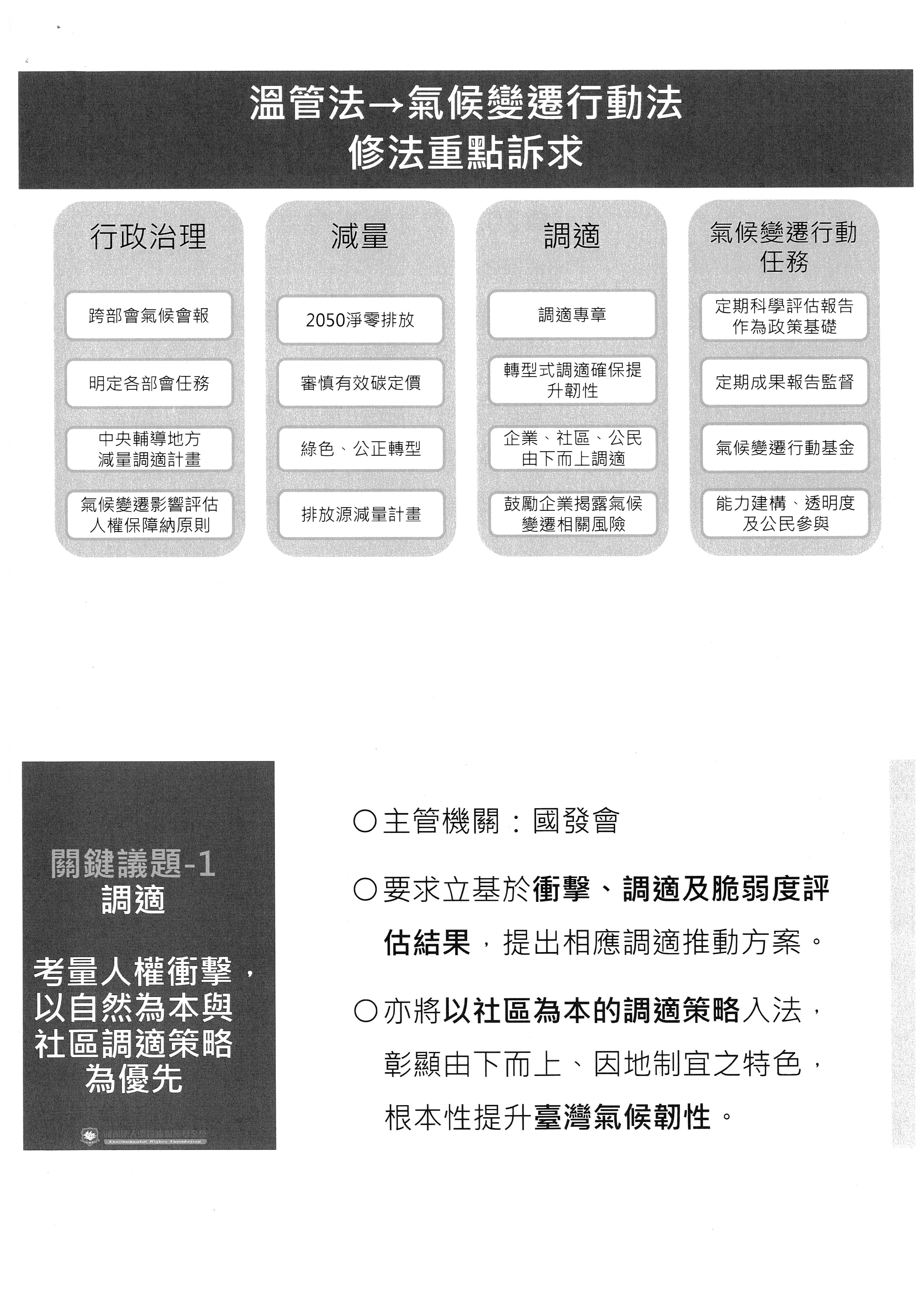 (一)「氣候變遷因應法」增訂氣候變遷調適專章,由基礎能力建構、科研推估接軌、確定推動架構等3重點著手,滾動調整調適作為,降低我國氣候衝擊。未來因應氣候變遷政策將減量與調適並重,且重視減量行動與調適行動間的協同效益。