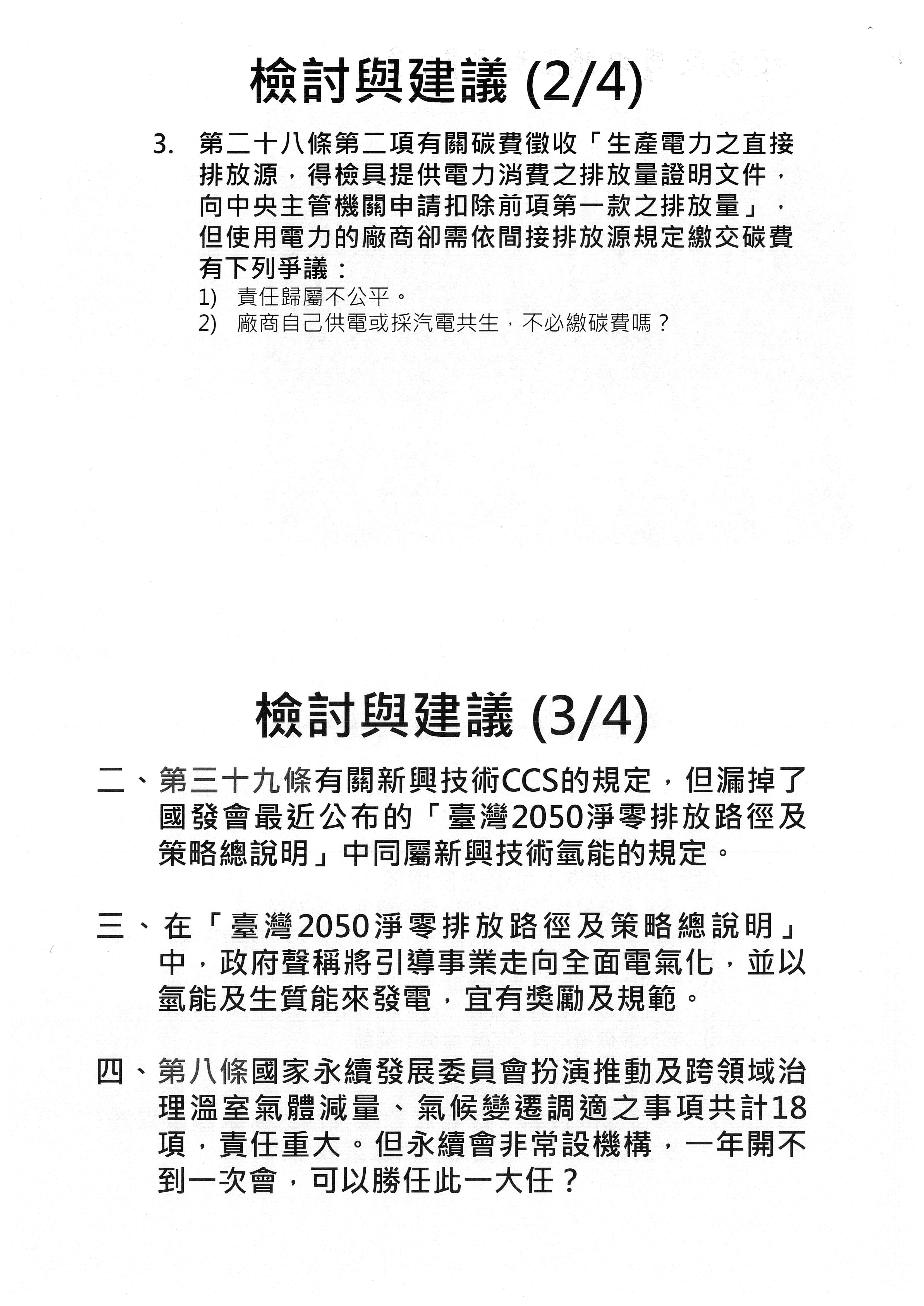 第三十九條規定的是CCS的問題。有些新興科技包括CCS的問題,剛剛的陳教授就提到,CCS的碳捕捉既貴又耗電、耗能,且封存的部分也是一個環境上的大問題,臺灣並沒有那樣的地質條件,要做也相當困難。如果要規範的話,CCS就已經有規範了,但現在不是要發展氫能嗎?氫能為什麼沒有規範?如果要和國發會一致的話,氫能就要規範,雖然我認為可能要等2040年以後技術上能以氫能燃燒鍋爐時才有辦法develop,只是如果真的要推氫能,在辦法裡頭就要有所規定。另外,政府說要引導事業走向全面電氣化,並以氫能及生質能來發電。假定要認真去推的話,就應該要有獎勵和規範才對,但這裡又沒有。