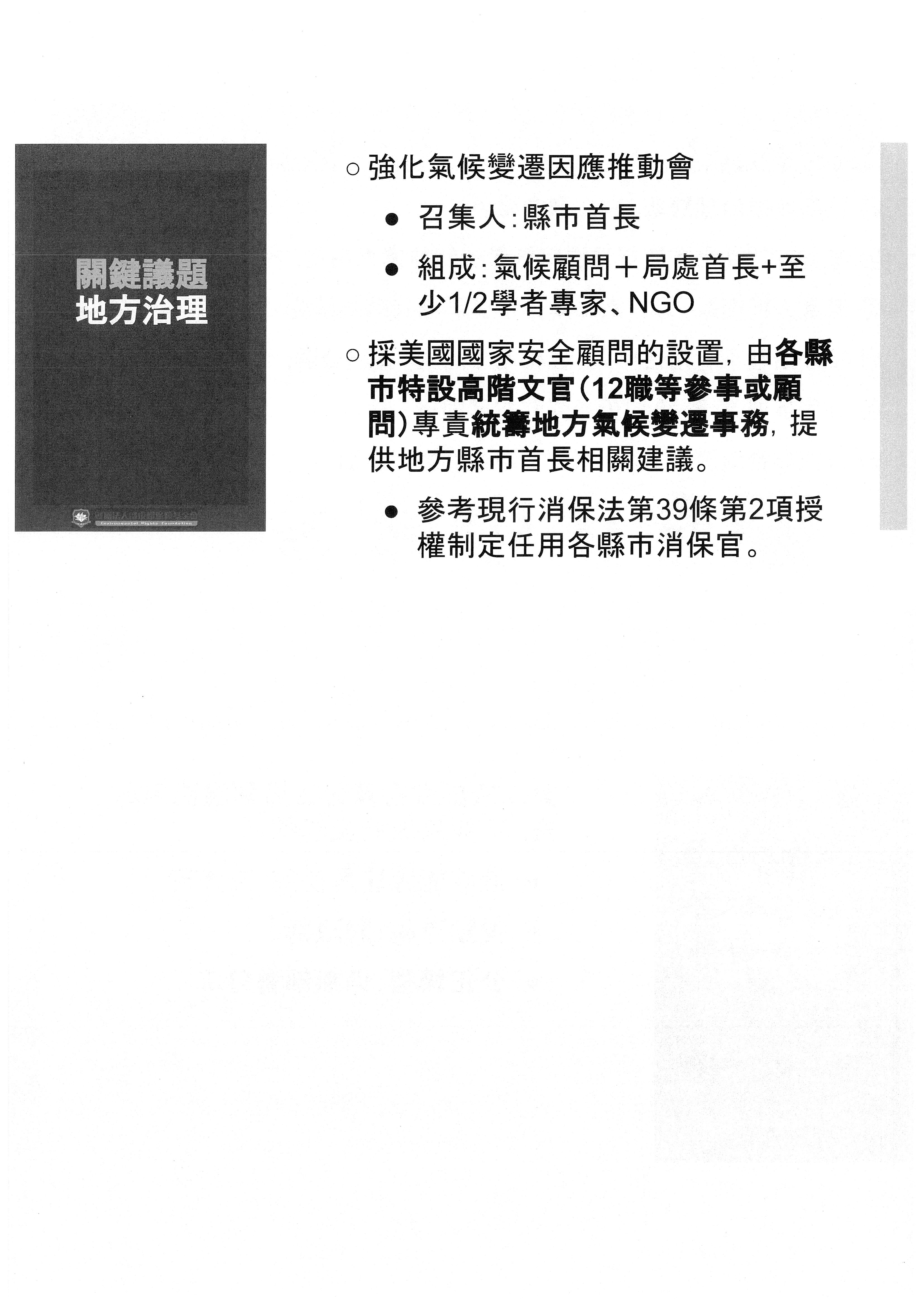 我今天針對三個部分做比較完整的說明,第一個部分是針對治理體制,第二個部分針對碳費,以及第三個部分會針對其他的政策工具。第一,在治理體制方面,在法裡面的治理體制修正,的確是要把目前治理體制上面不足的部分加以修正和補足,特別是在中央與各部會跨部會的協調,地方上氣候因應推動會的明確單位,但比較不足的部分是,一方面中央如果還是以永續會在協調的話,在職權上剛剛很多先進也批評指出,永續會在運作上確有其限制,所以我們還是主張應該成立氣候行動會報,如此將有幾點不錯的效益: