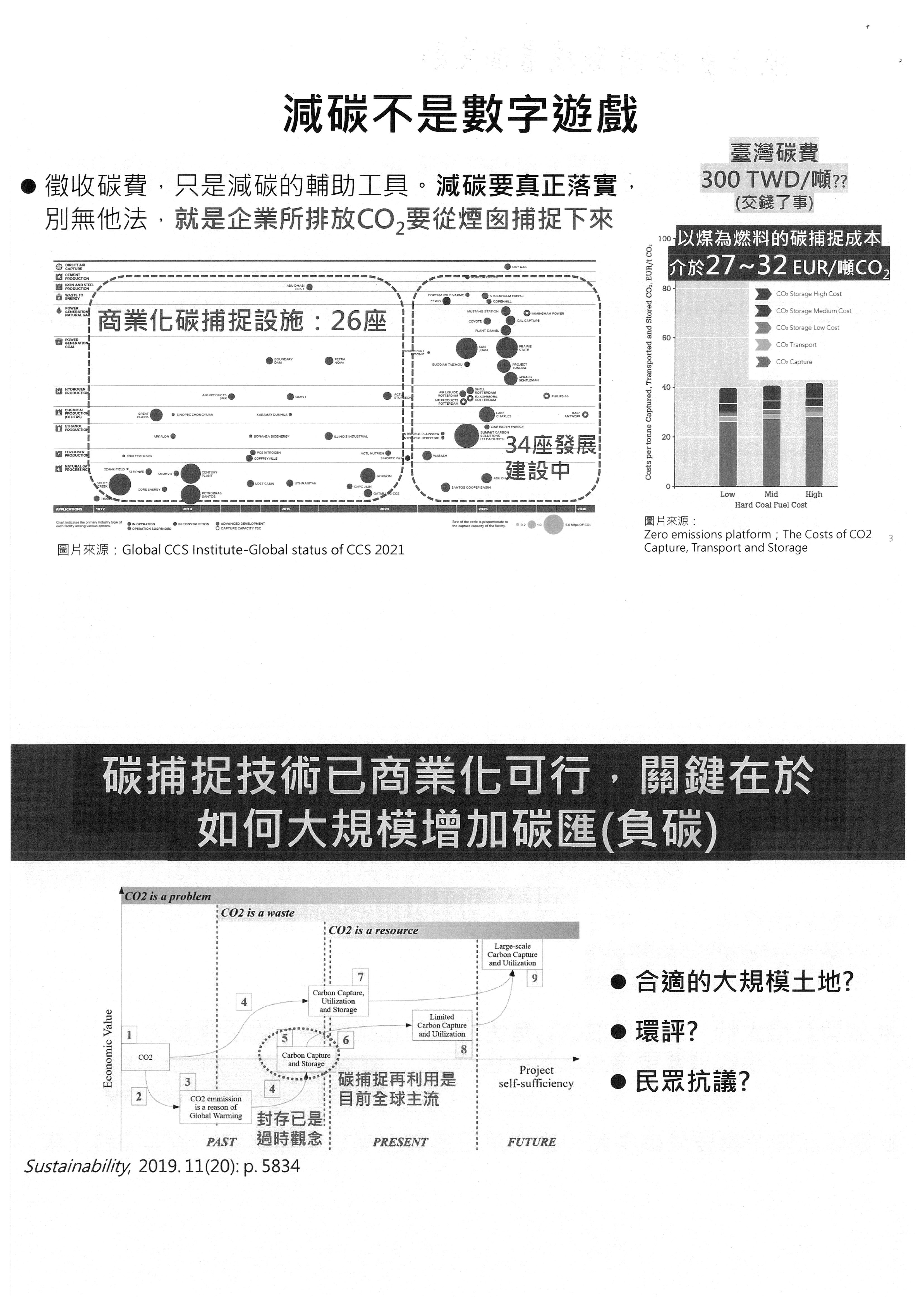 今天很多委員都提到碳費,我們知道臺灣實行跟碳費類似的是空污費,大家有感覺這幾年空污改善了嗎?空氣有沒有比較好?有沒有看到藍天白雲?沒有啊!都把它歸為是中國的空氣污染到臺灣來,所以可以預期到的,如果你現在還用這種思維來收碳費的話,很簡單啊,就把錢繳給你,不然要怎樣!誰來減碳?政府有能力減碳嗎?所以今天要減碳是要企業自動自發來做,沒有自動自發是行不通的,所以碳費當然可以訂高一點,逼你不得不做,但是因為臺灣是民主國家,靠選票當選的,所以碳費敢不敢訂高?不可能的,因此常常會造成繳錢了事的現象。而且大家也知道,現在國際品牌要求供應鏈都要碳中和,能不能繳錢抵減說已經減碳了?不行。接下來要提到,減碳不是數字遊戲,常常看到蔡總統說利用科研來解決,但是大家知道,其實這種技術不是沒有,已經有了,商業化碳捕捉設施有26座,有34座在發展建設中,所以技術上是很簡單的。但是問題在哪?也就是我今天的著重點,就是產業排碳的問題,往往從煙囪出來要經過一些洗滌塔、要scrubber,所以scrubber在捕碳的工廠裡面一定有,只要把這個功能再擴充到減碳、抓碳下來就可以了。這邊可以看得出來,臺灣現在爭議碳稅300元太貴了,大家有沒有看到歐盟是27-32歐元,所以捕碳技術其實已經商業化,並不是沒有,也就是我要講的,業界一定要付諸行動,不然你的訂單就沒有了。大家都很清楚臺灣的經濟成長是靠製造業,以外銷為導向,如果不做,訂單就沒有了,這是很清楚的!舉一個簡單的例子,樂高玩具2022年要達到碳中和,就是今年喔!樂高玩具大家都玩過,臺灣的樂高玩具材料用ABS,奇美是全世界最大的,如果不做,訂單就沒有了。換句話說,這是可行的,一定要做,關鍵在於如何大規模實行,就是剛才委員講的森林碳匯,但是現在的規劃只著重在封存,二氧化碳在臺灣有可能封存嗎?要封存在哪裡?沒有錯,臺灣海峽很大,但問題是能封存在臺灣海峽嗎?第一個,土地在哪裡?環評的話,民眾會不會抗議?把我們這一代的廢棄物丟到海裡面、丟在土地裡面,留給下一代來解決,這是不負責任的,像核能廢料一樣,就變成像是二氧化碳掩埋場一樣。