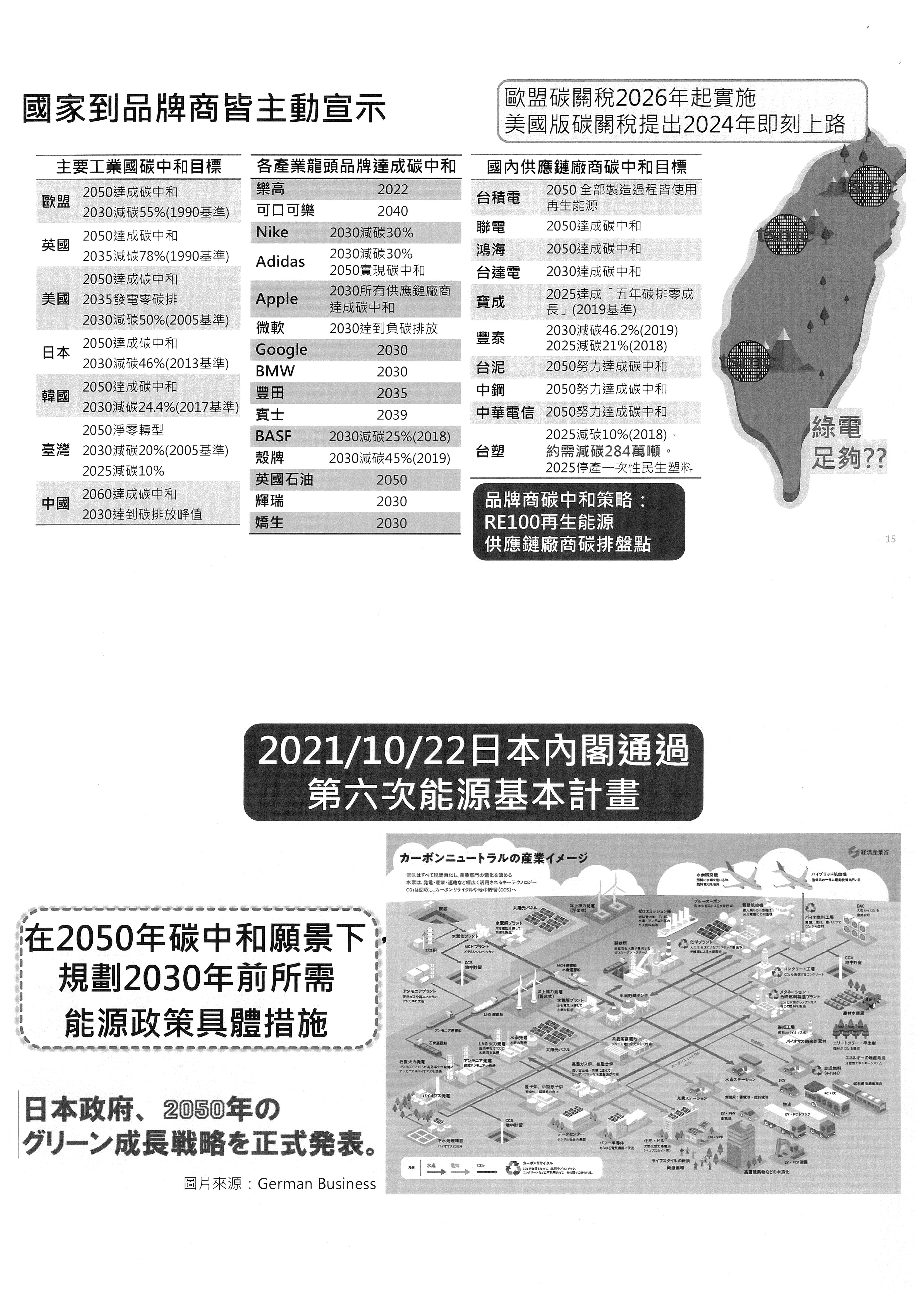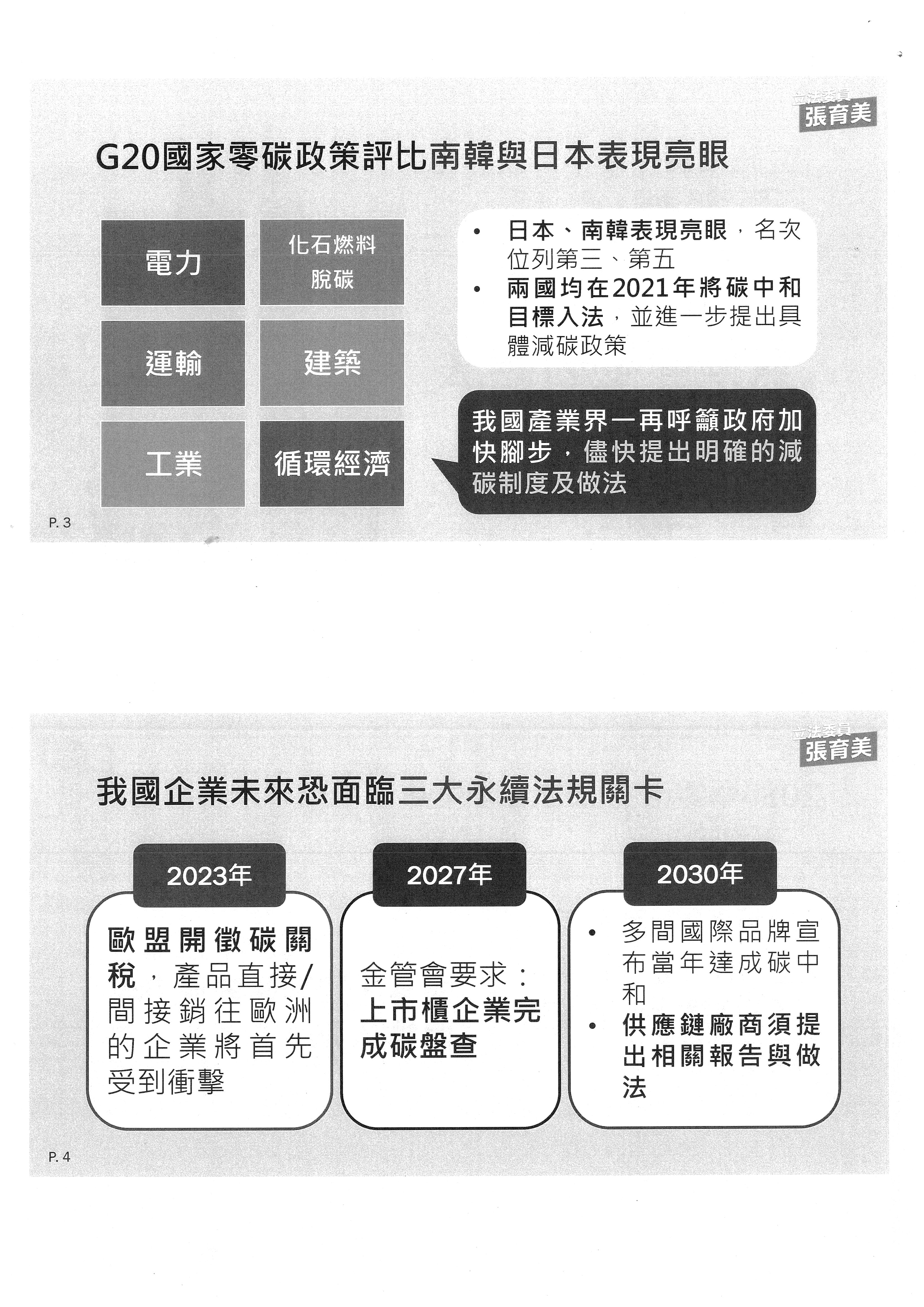 因應全球氣候變遷,目前全球已有三分之二國家宣示淨零排放的政策目標,且歐盟規劃對進口產品採行碳邊境調整機制,在國際企業減碳協議對綠色供應鏈使用綠能及宣示減碳目標等要求下,推動減碳邁向淨零已是攸關我國國際競爭力,一定要努力去做的事情。