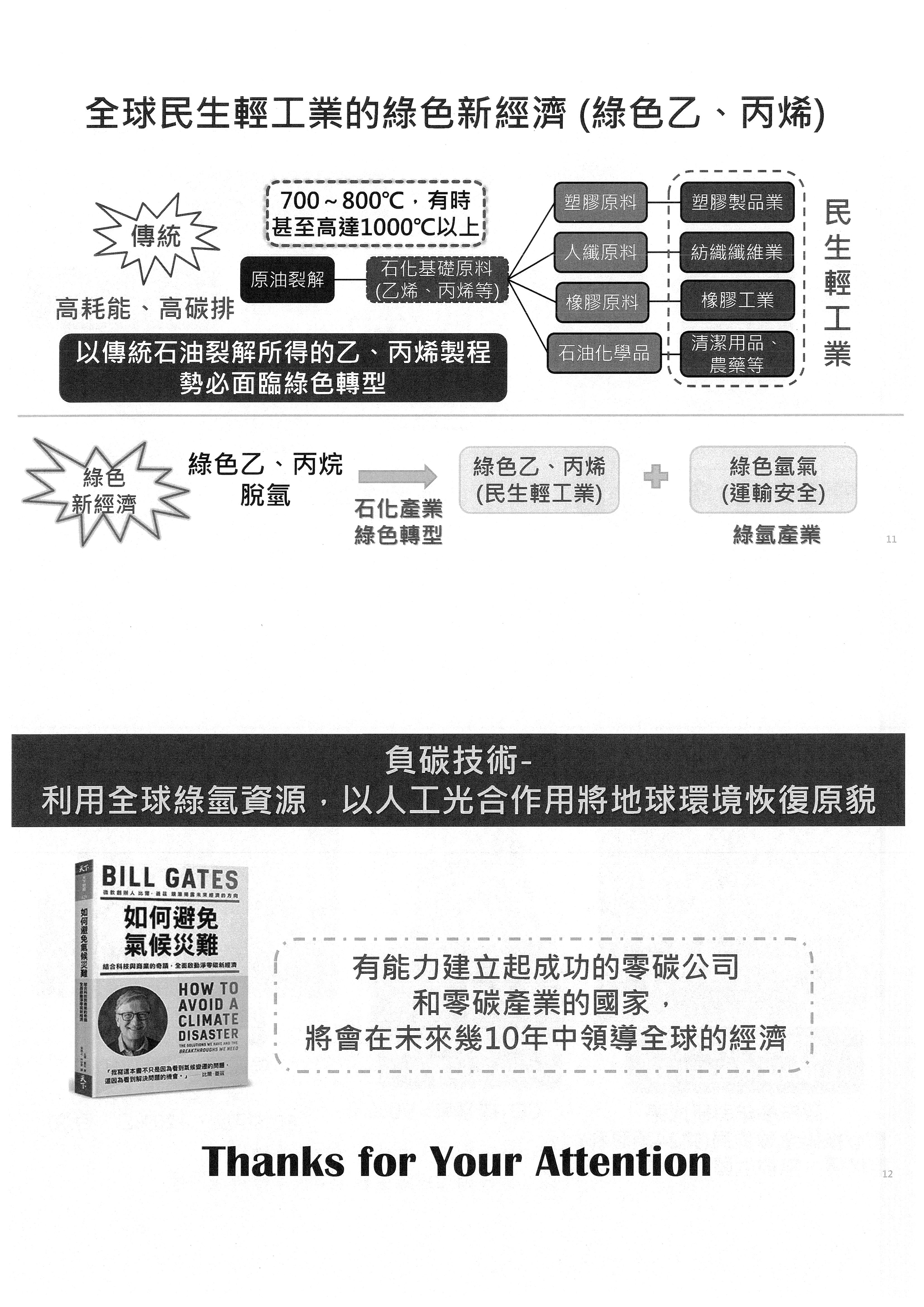 最後講一句話,比爾‧蓋茲講的:有能力建立起成功的零碳公司和零碳產業的國家,將會在未來幾十年內領導全球經濟。這是一個很重要的目標,只是我們臺灣要不要做的問題。因為時間的關係,很多詳細的資料在附件,大家有興趣可以參考。謝謝大家。
