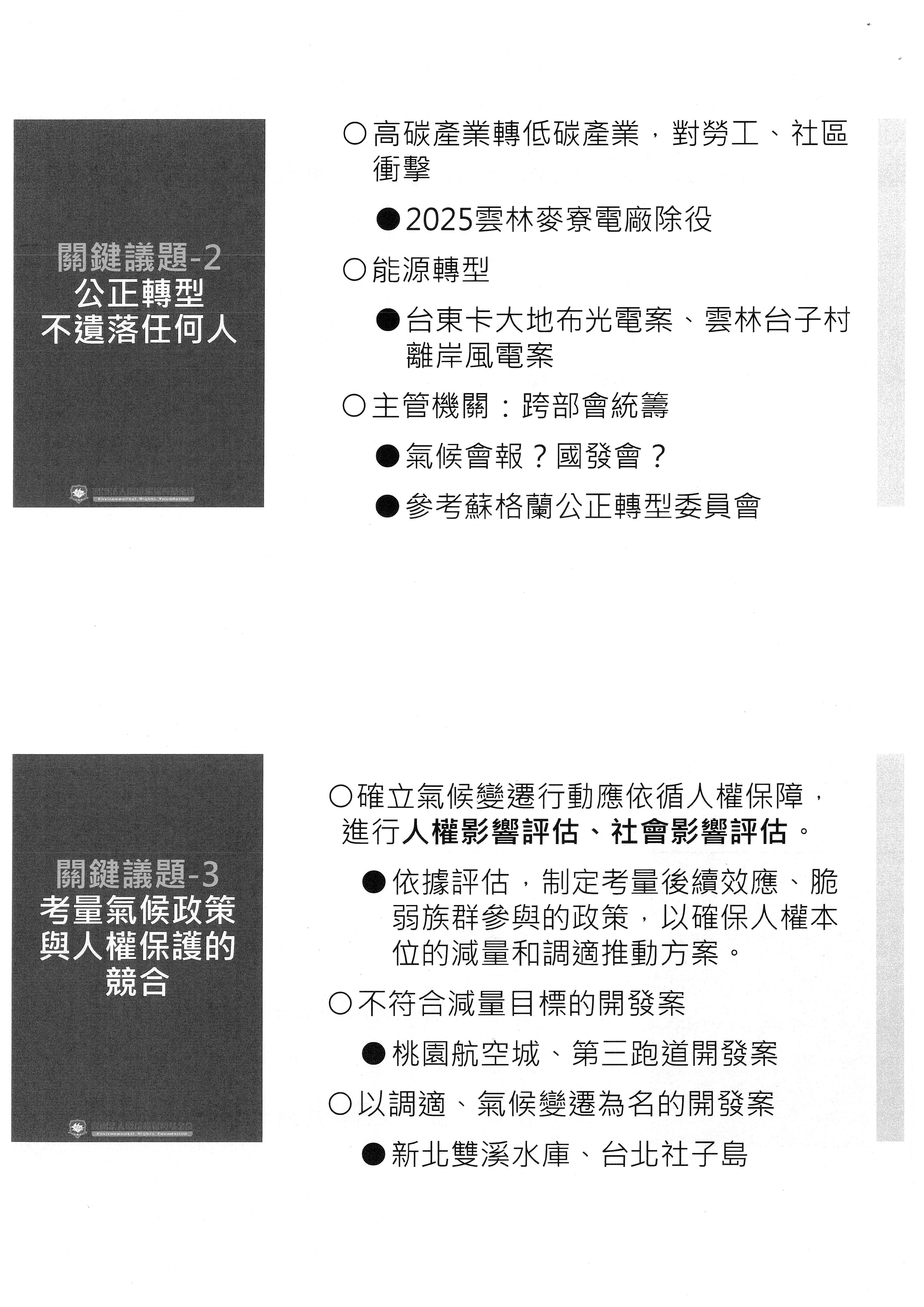 第三個,我還是要提醒的是氣候政策一定要有人權保護的競合,要有相關的人權影響評估和社會影響評估,不然有一些不符合減量目標標準的開發案,像桃園航空城和第三跑道開發案,還有調適和氣候變遷為名的開發案,像新北的雙溪水庫和臺北的社子島,這些都是以氣候變遷為名的開發案,但是對當地的衝擊都非常嚴重,以社子島來說,人權的議題其實非常多。