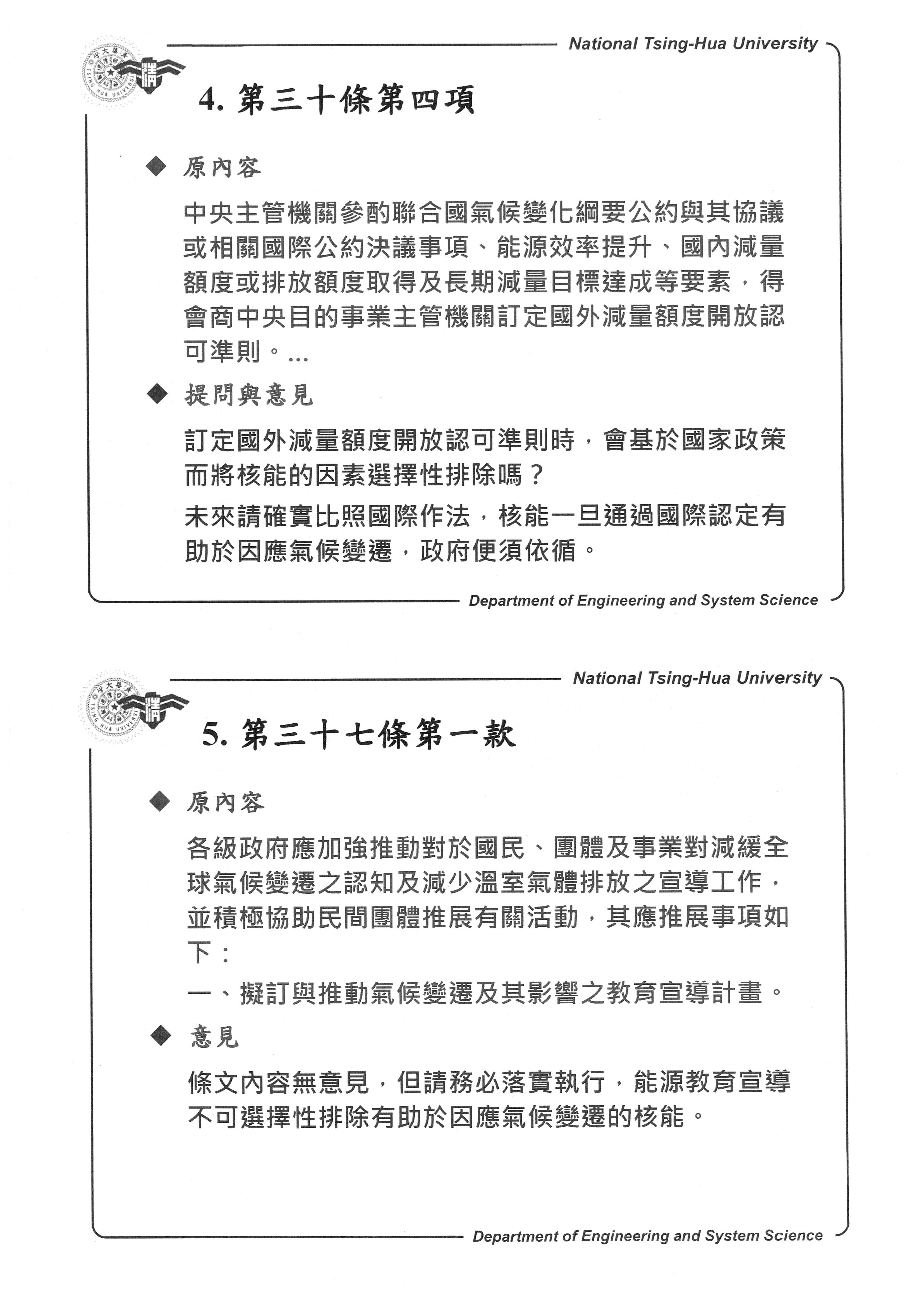 關於第二十八條,剛剛幾位先進提到,生產電力的直接排放源可以不必繳交碳費,所以剛剛幾位也提到責任歸屬就會有不公平的問題。因為臺灣60%以上的碳排,是來自於發電業,結果發電業卻不必交碳稅,要交碳稅的反而是間接的、要使用電力的廠商,你說這些廠商會服氣嗎?責任公平嗎?我是用電者,但供電者為何不排碳呢?供電者的碳排放得愈多,用電者要交的稅就愈多,所以這樣的責任歸屬並不公平。另外還有六成的排放源是不必交碳稅的,在這種情況之下,我們說要淨零排碳時,那六成就是不被規範的,要達標的機率就接近於零了,所以這也是個很大的問題。