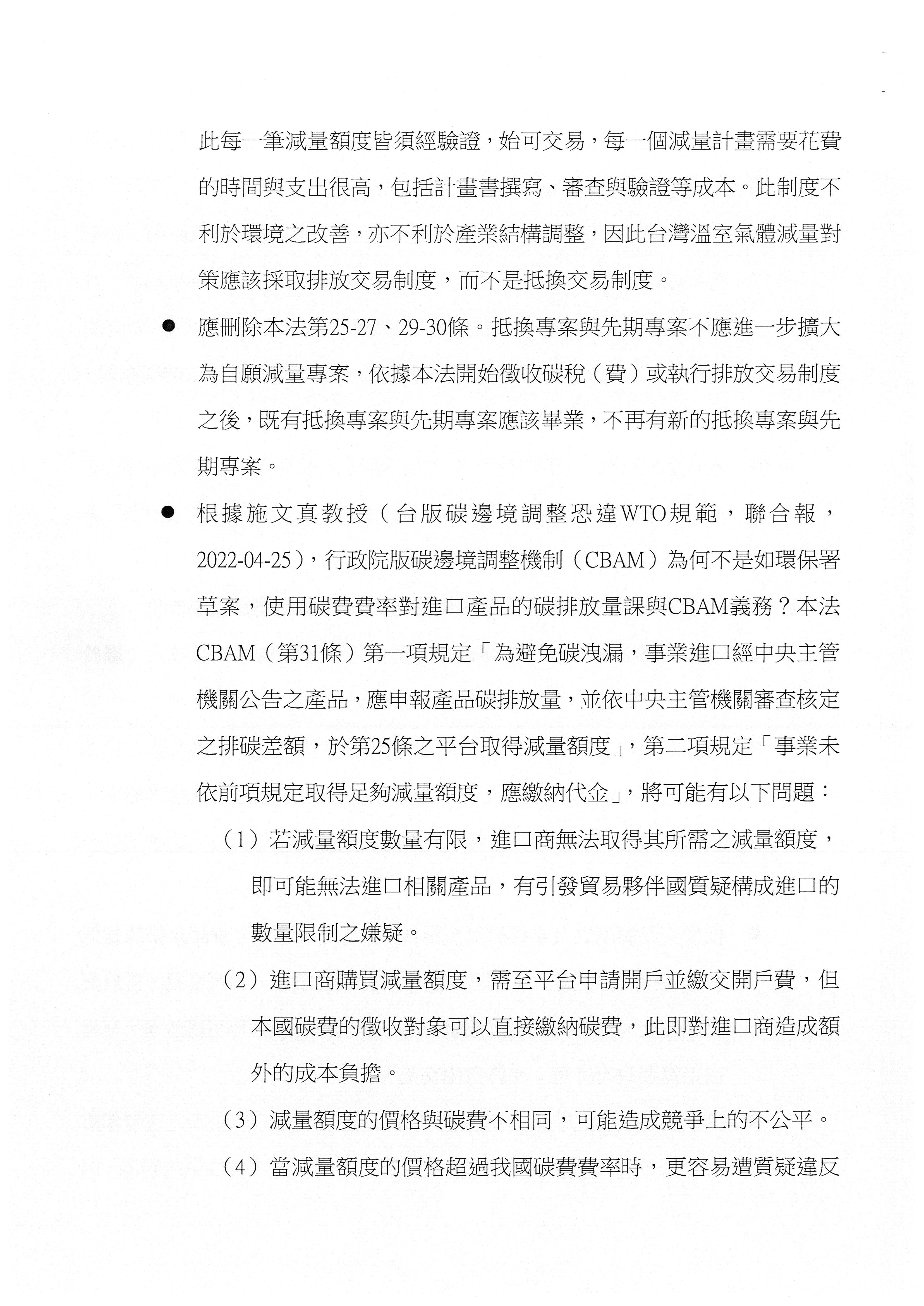 最後,對於自願減量方案擴大了補貼污染源,因為在第二十九條加上了自主減量可以抵減,可以有優惠費率,減量的額度又可以抵減碳費,其實按照排放量課費就好了,排多少就課多少,為什麼減量的部分又可以抵減?這實在非常奇怪,代表它原本就有權利排這麼多,所以減量的部分可以抵減,這完全是不正確、不符合原則的作法,這一點是越改越退步。這裡就是施文真所講的臺版CBAM這一段,他說我們應該按照原版,原本環保署的版本是說外國的產品就繳納我國的碳費費率就好了,現在改成跟自願減量方案接軌,反而製造很多貿易障礙。