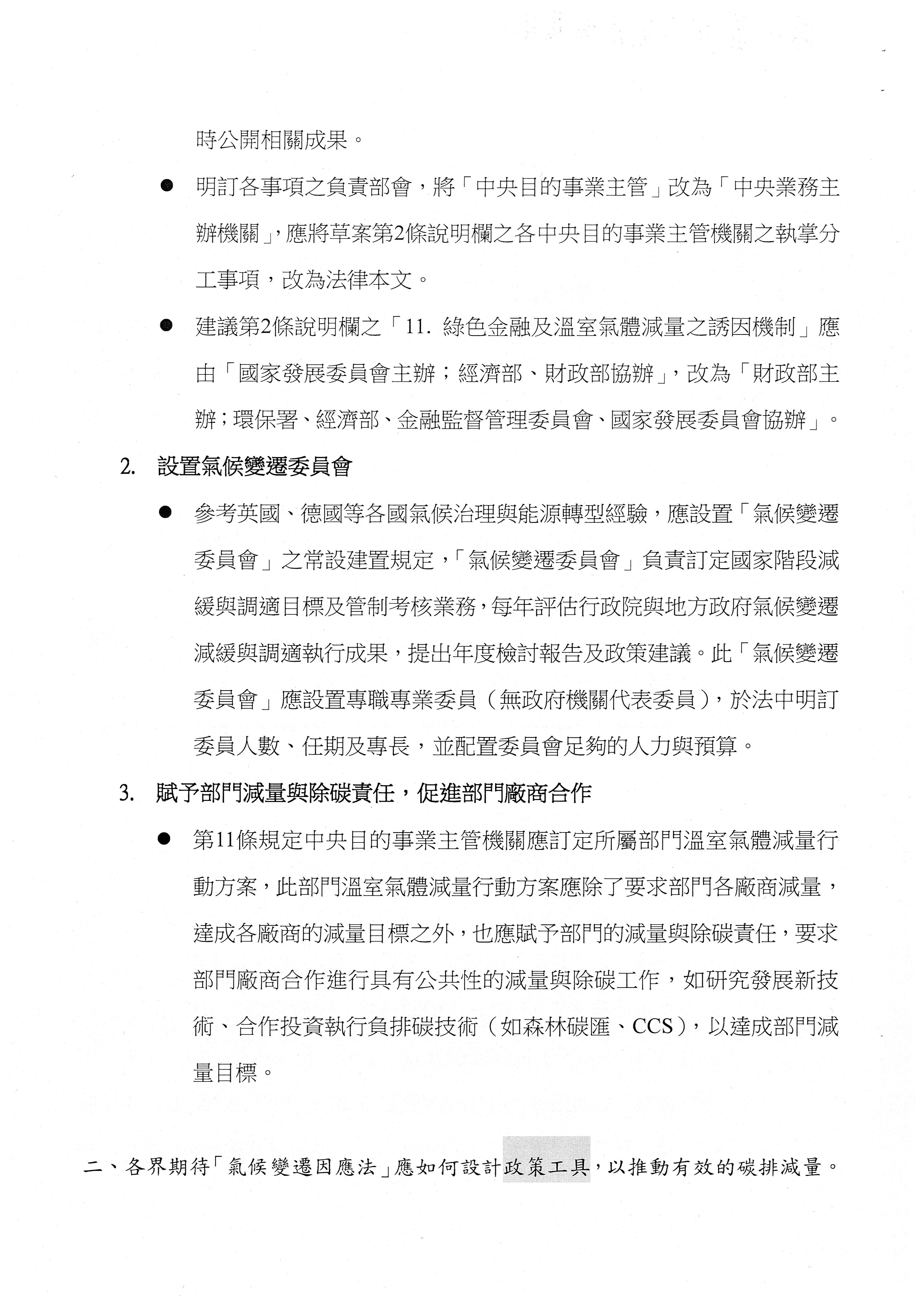 一、此次「氣候變遷因應法」應如何修法,以完善氣候治理的組織設計及權責分工。
