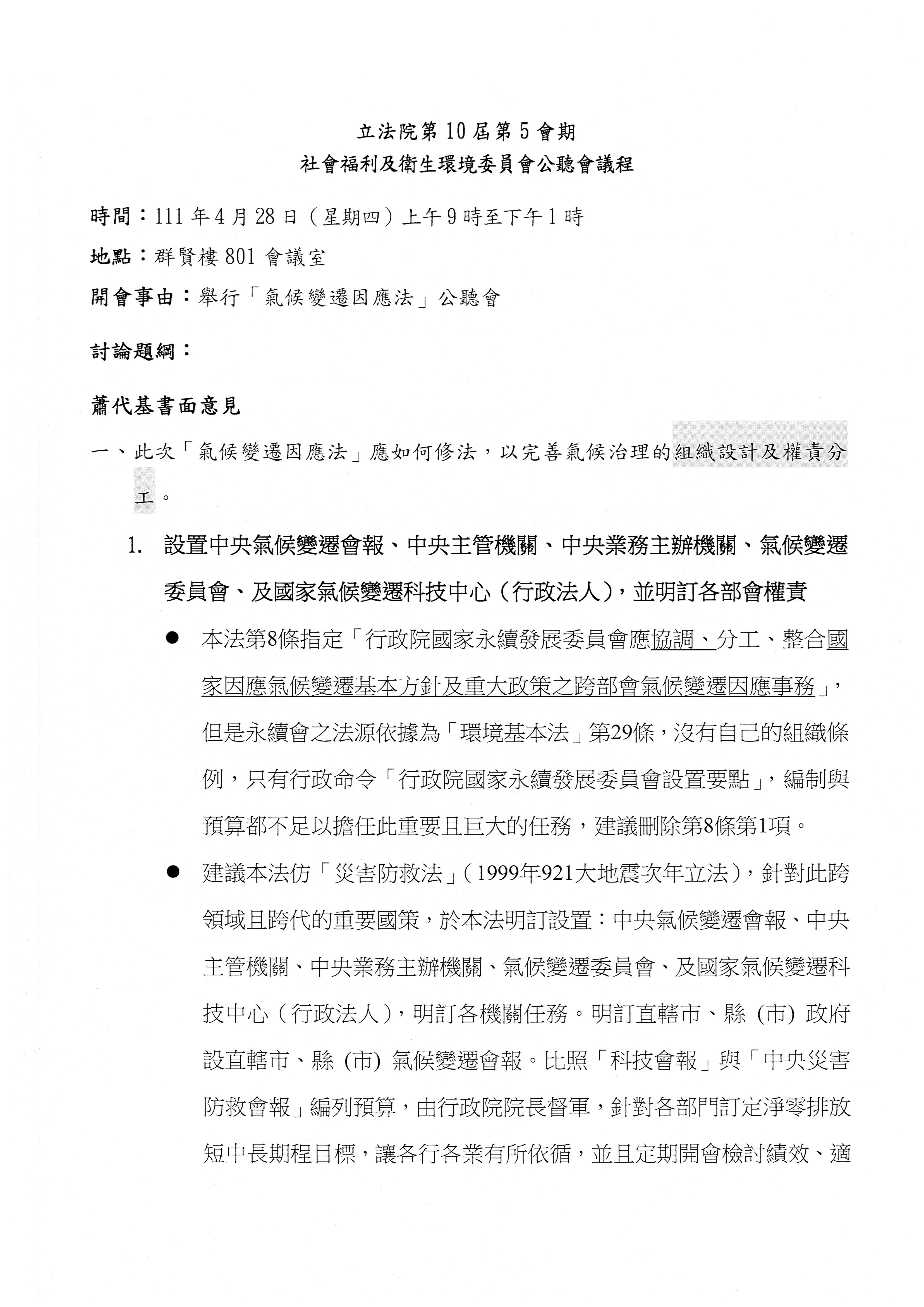 蕭代基研究員:主席、各位委員、各位先進午安。討論提綱有五點,我就針對這五點分別提出我的建議。第一,在組織設計及權責分工方面,我建議要設置中央氣候變遷會報、中央主管機關及中央業務主管機關,不要叫做中央目的事業主管機關,另外要成立國家氣候變遷科技中心,要明定各部會的權責,要放在法中,不要放在說明欄,也要設置氣候變遷委員會。