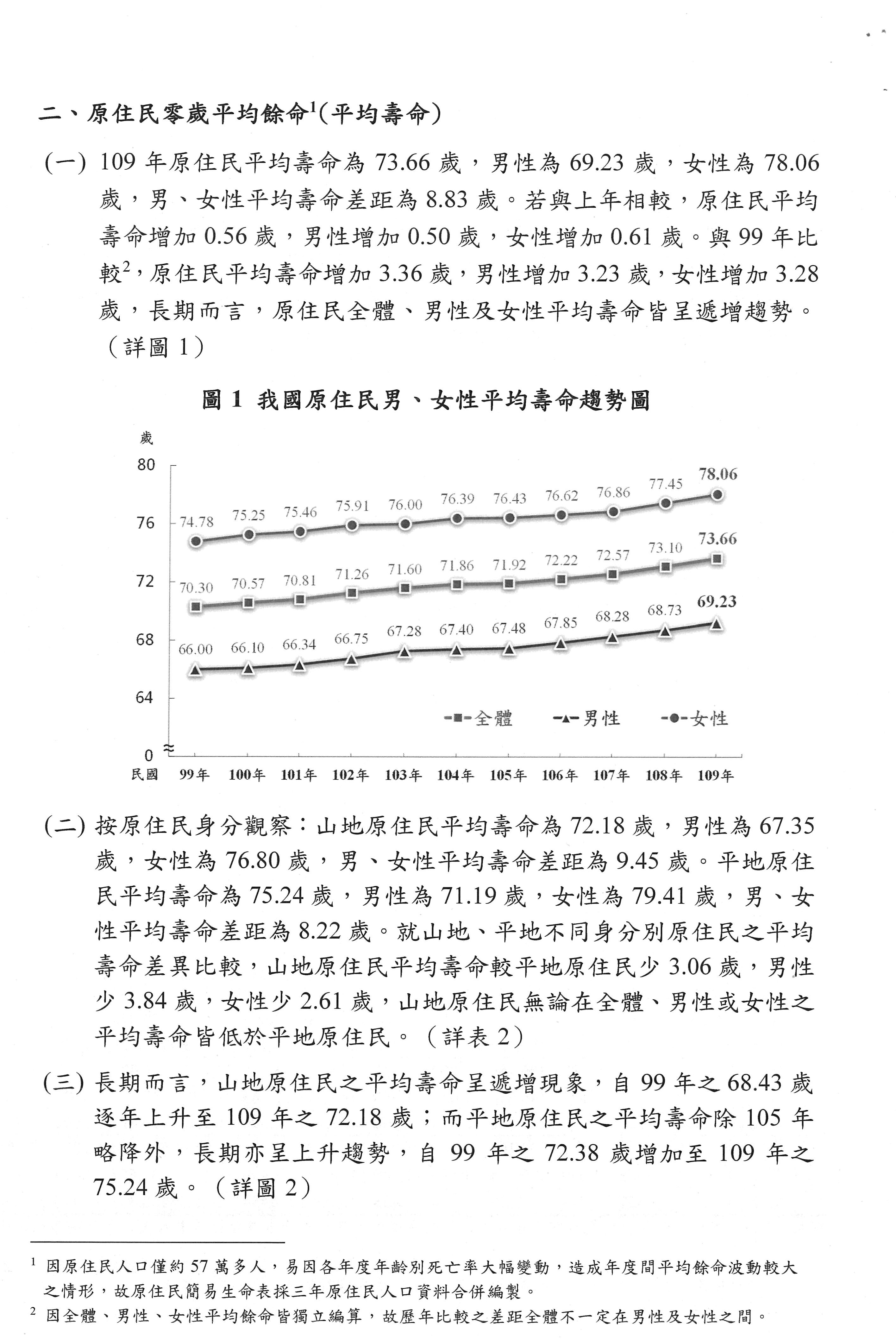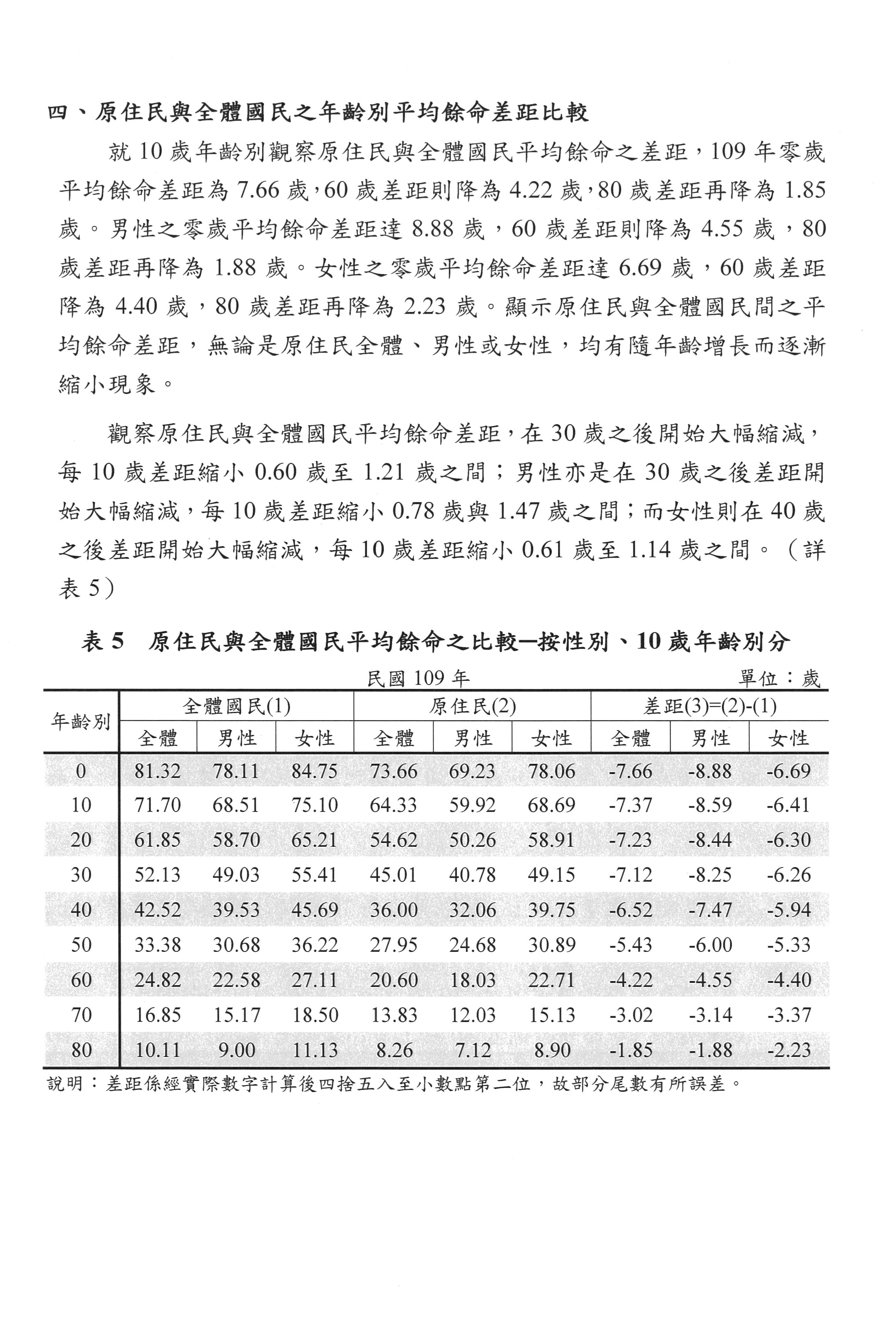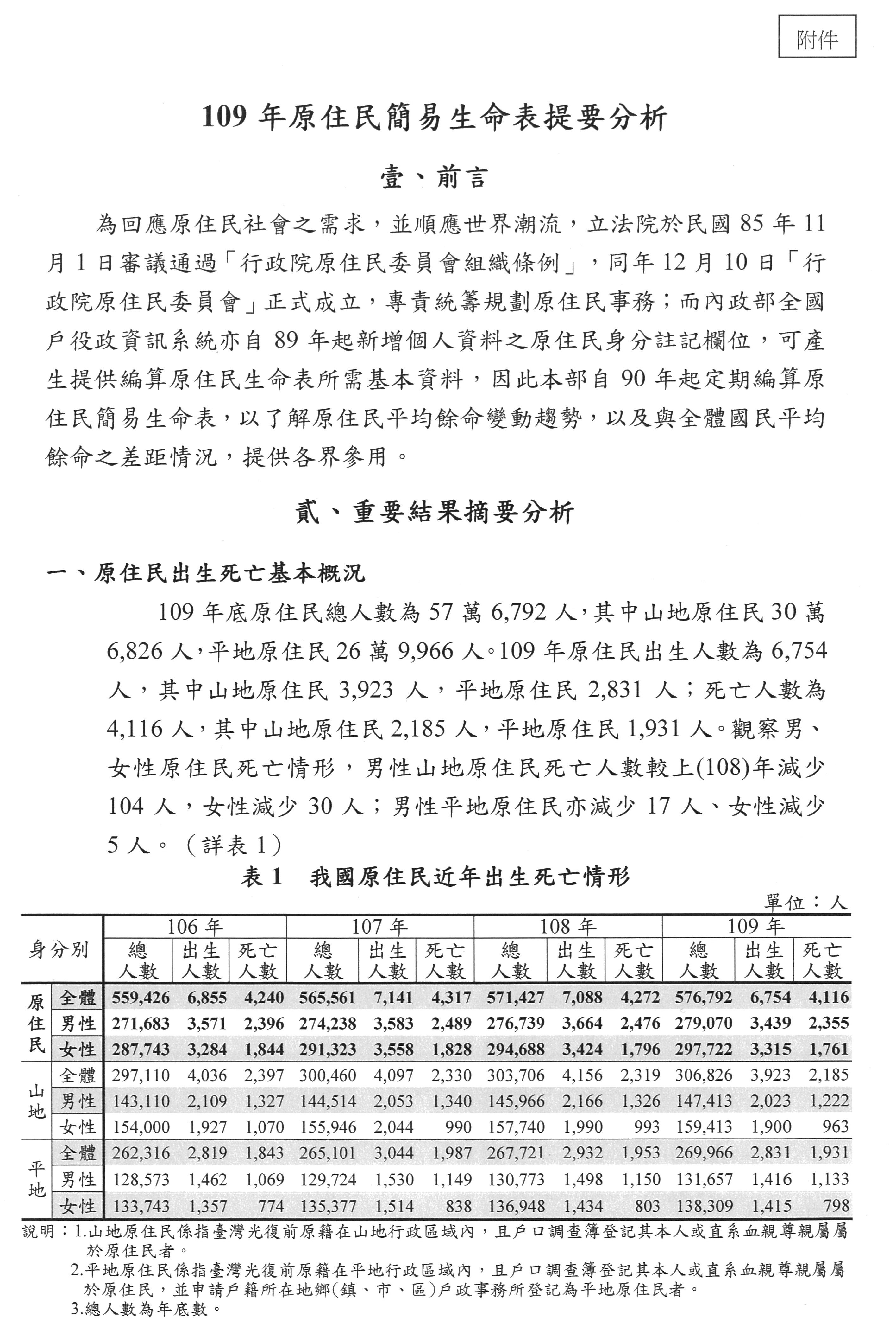 而自89年起,本部全國戶役政資訊系統之個人資料,新增原住民身分註記欄位,可產生提供編算原住民生命表所需基本資料,爰自90年起本部定期編算原住民簡易生命表,以了解原住民平均餘命變動趨勢,並公布於本部網站「統計主題專區」之「我國生命表」(https://www.moi.gov.tw/cl.aspx?n=2906),提供各界參用。109年原住民簡易生命表提要分析詳附件。