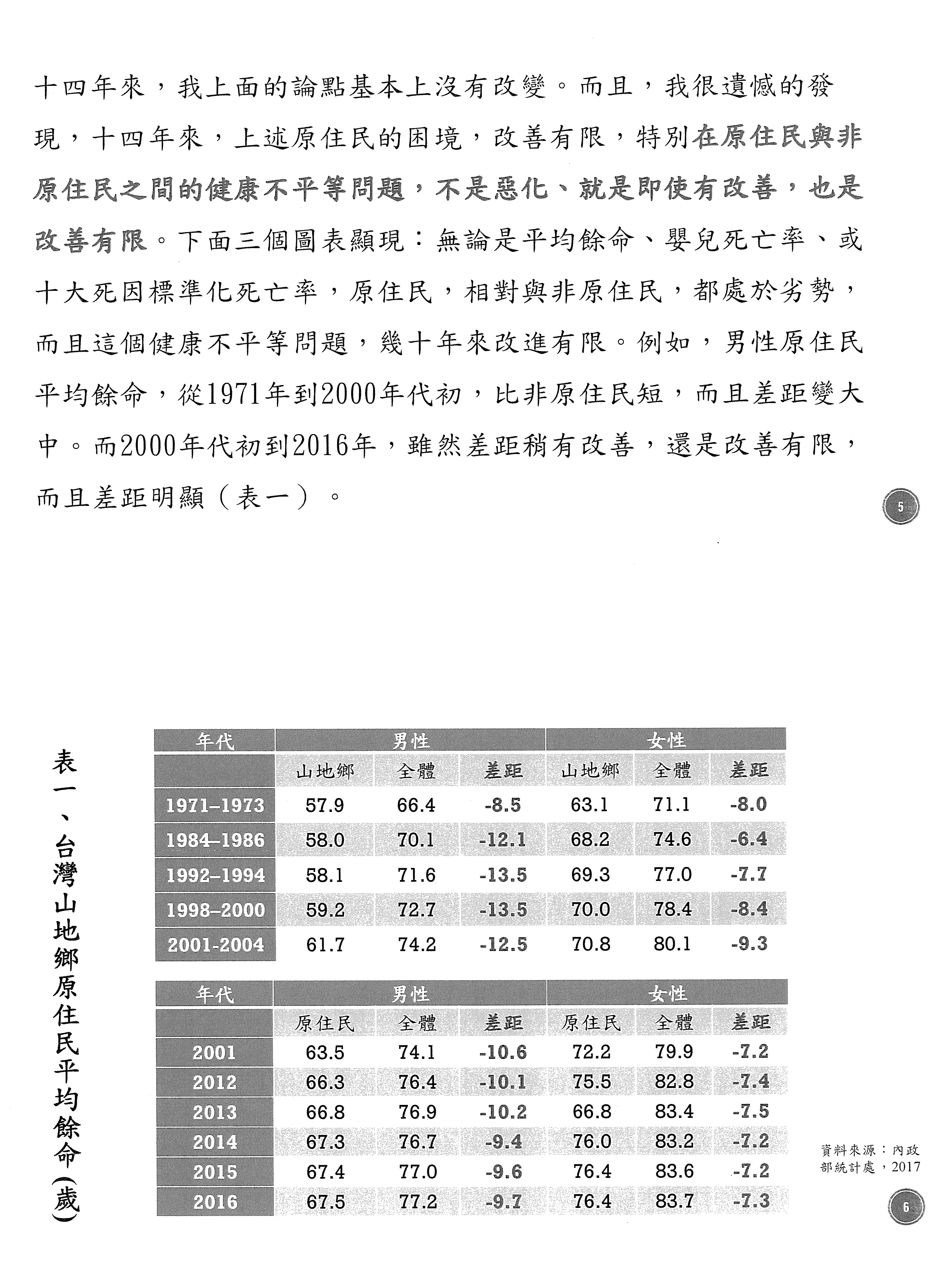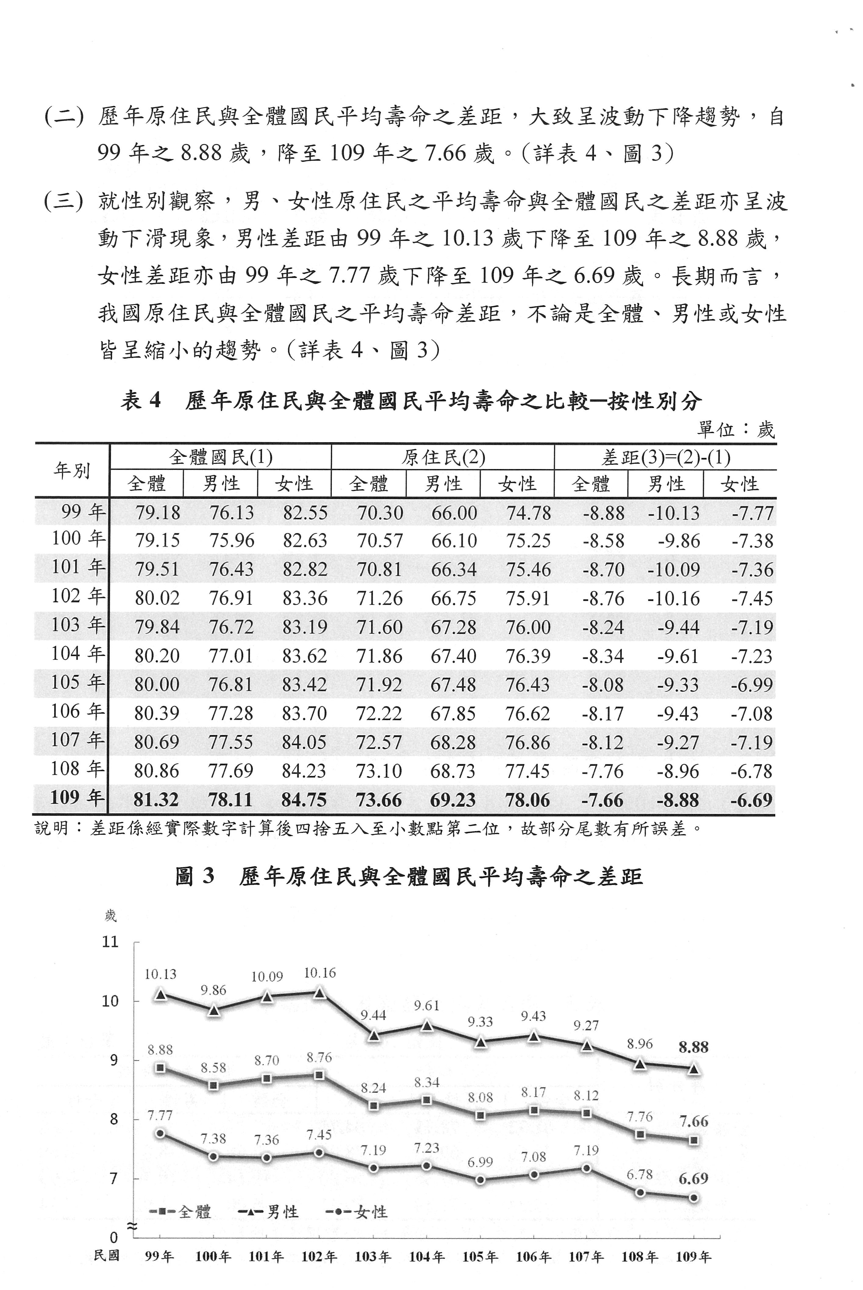 惟回顧原住民族最為根本的生命健康權益,根據內政部的統計資料顯示,原住民90年到106年平均餘命的變化,從90年的67.7歲提升到72.22歲,比全國國民0歲平均餘命低了8.16歲,可見原住民族健康以及福利服務跟實際需求的落差,也反映健康跟福利政策的成效低落。即便政府投入大量的公衛資源,在原鄉大興土木,設立照顧據點,獎勵人才進入原鄉,開設十大計畫,推動公費醫學生保障名額、部落健康營造、關注高風險孕產婦健康等等的相關政策,但是從數據上來看,從90年到106年間,原漢間的平均餘命變化僅僅縮短1歲,就平均餘命的差距來看,16年來縮短幅度有限,時至今日原民仍然沒有追平15年前全國人口的平均餘命,顯見原住民族的健康狀況仍有大幅改善的空間。