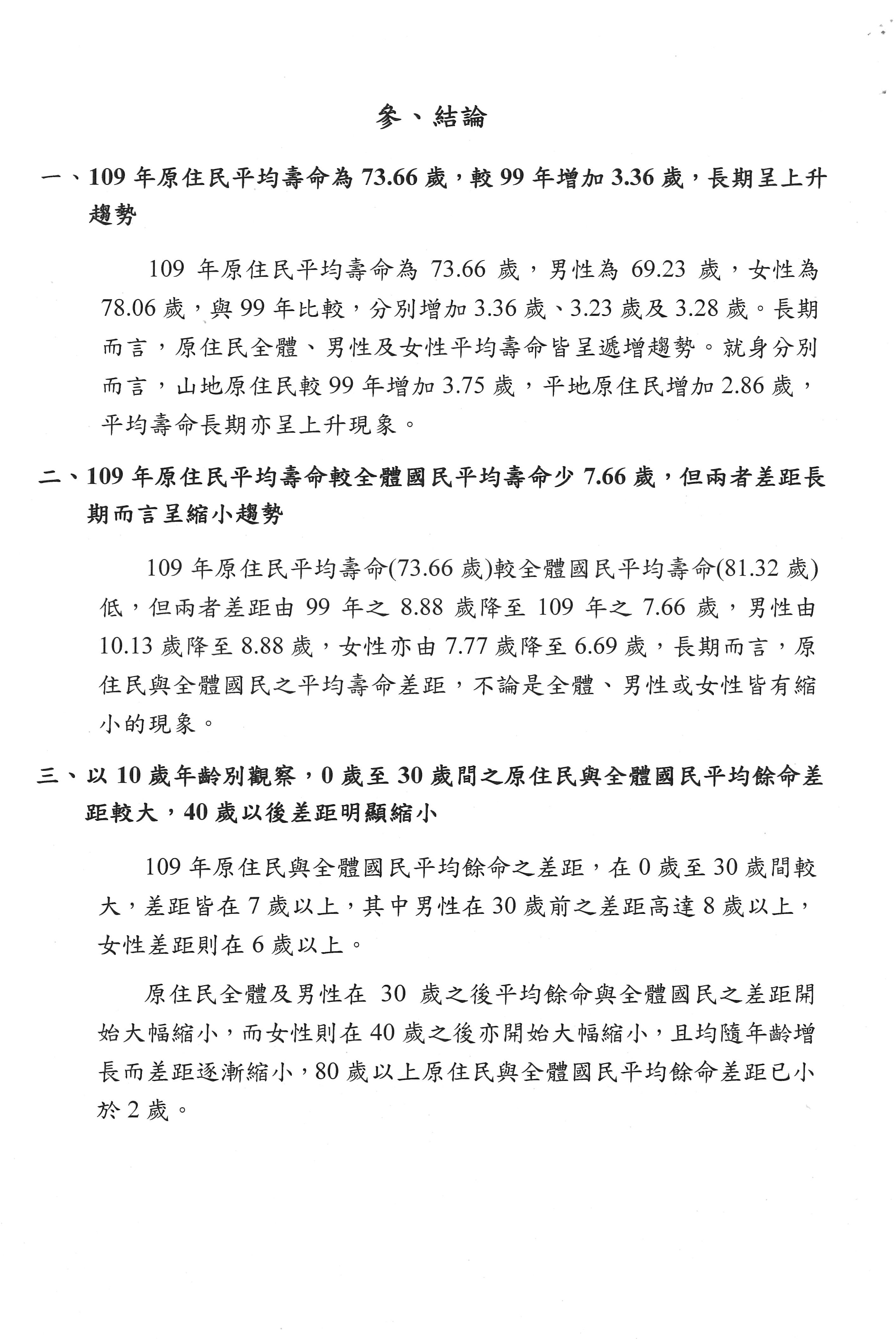 (二)已完成91年至108年之原住民族健康相關統計數據,定期更新公告於本會網站,作為原住民族健康政策參考依據。預計111年底完成109年度原住民族人口及健康統計年報。