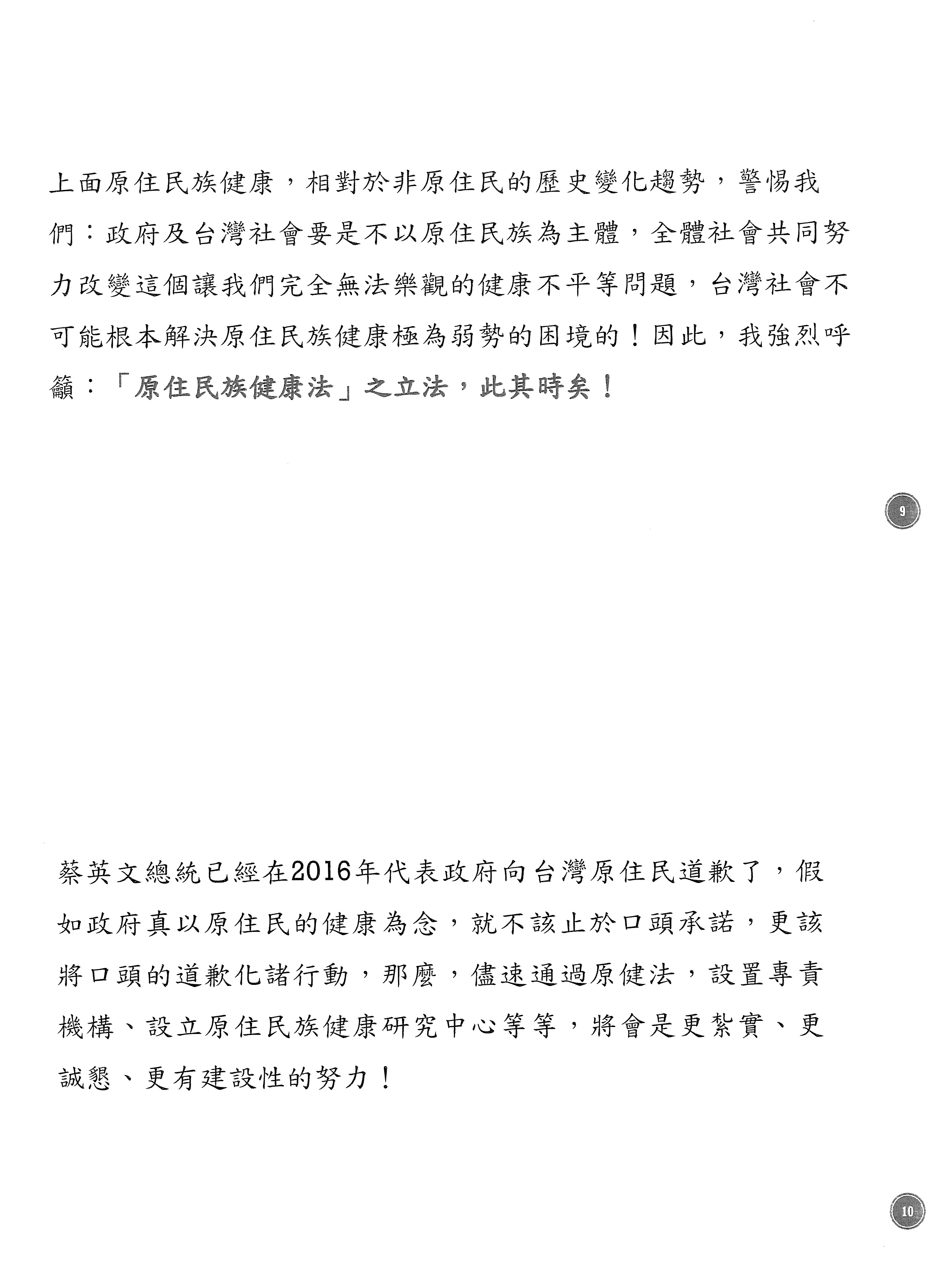 裡面有最大的四個訴求:第一,中央和地方要有健康政策會,原住民代表不是只有背書的性質,我們要有實質參與和決策權;第二,發展基金的部分,我們的來源、我們的整合也是要去思考的;第三,原住民族應該要有一個自己的健康研究中心;第四,中央單位應該要設置一個原住民的單位。昨天很高興、很恭喜心口司分開了,什麼時候會有原住民健康司?我回應一下前面第二點提到希望在某個司下面設一個原住民健康科,大家覺得一個科夠處理這麼大範圍、這麼廣範圍、這麼跨部會的一個我們需要去改善的非常重要的議題嗎?請各位決策者、執行者、執政者閉上眼睛10秒鐘,回想你們當初的初心,今天原健法如果可以成就,我們真的把最後這一哩路走下去,我們一起共同努力,實際地把這些預算用在真正的刀口上,這會是你執政期間最美善的事情,謝謝。