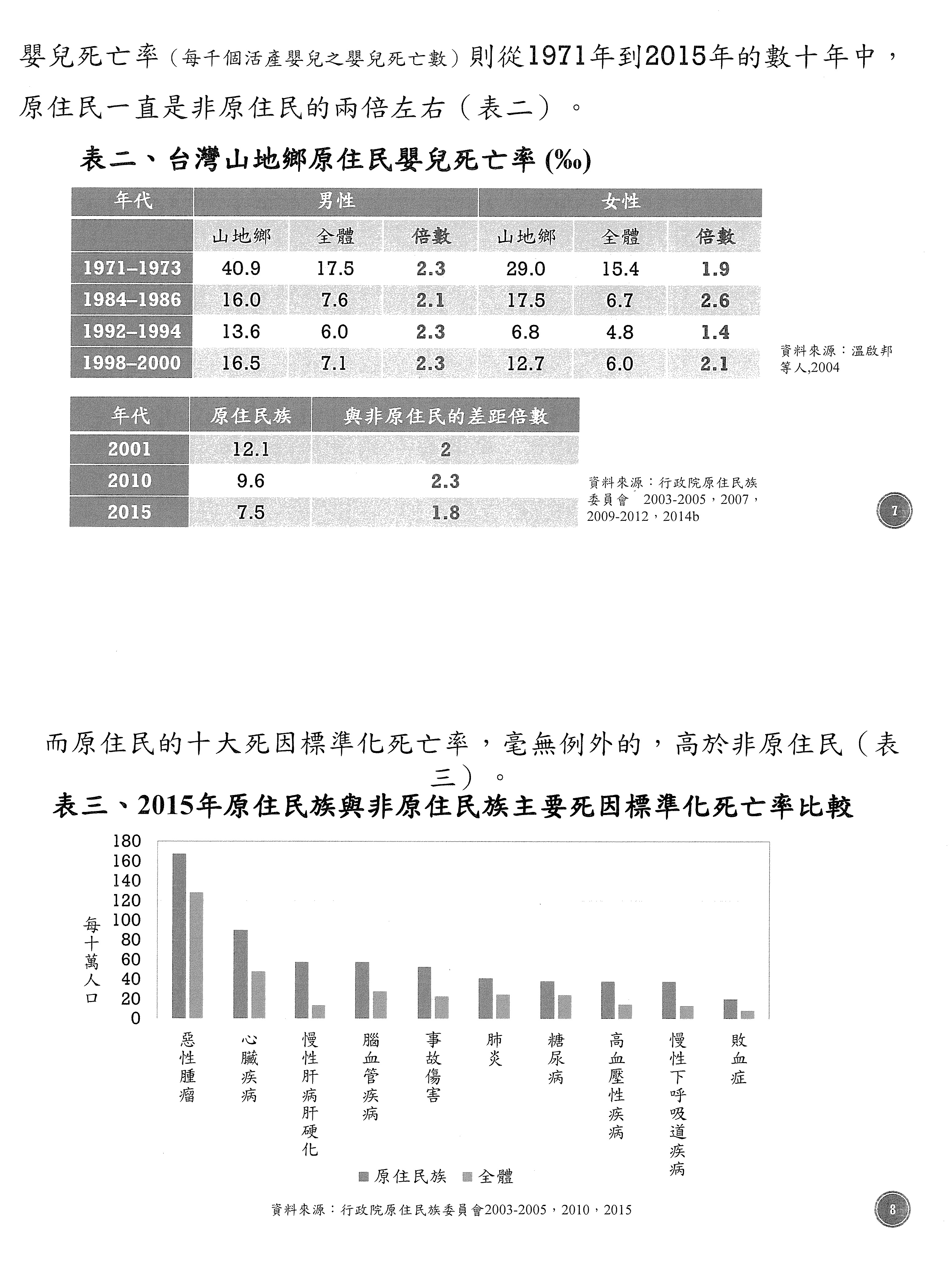 剛剛前面的專家學者都已提到很多學理的部分,我就不再特別贅述,但我要再強調兩個重點以說明為什麼我們急需原健法的立法:第一個要談的是原住民族健康不平等。我們常常聽到原鄉健康改善計畫,以現在原民會對原住民人口的統計來看,大概有一半的原住民是生活在非原鄉地區的,所以原鄉改善計畫沒辦法完整地涵蓋到原住民族健康不平等,這就是原健法的第一個重要性。