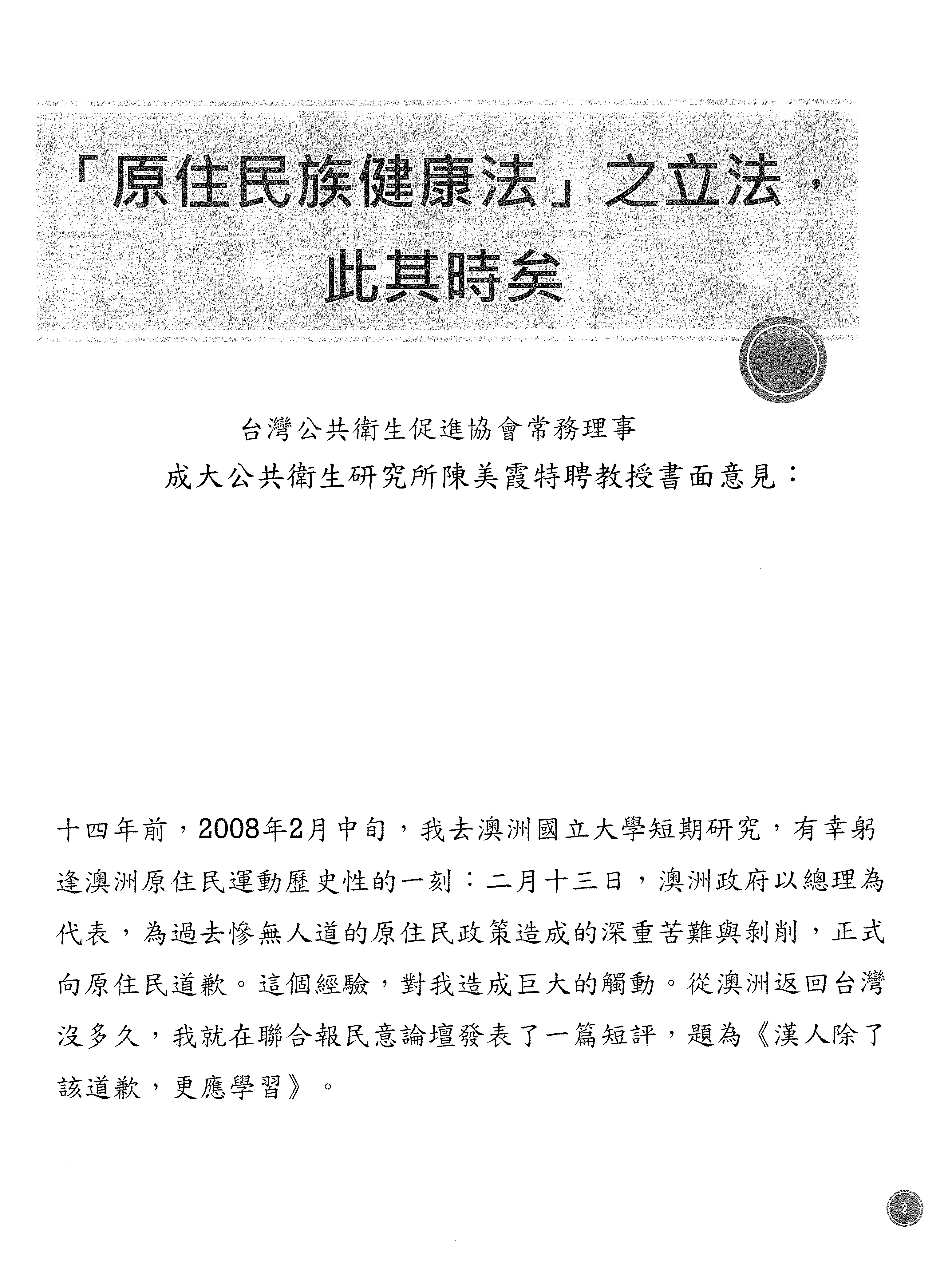 本會應貴委員會邀請參加「原住民族健康法」立法公聽會深感榮幸,承蒙貴委員會對原住民族健康相關事務,以及原住民族健康法立法進度的關心,特別向貴委員會表達最誠摯敬意。