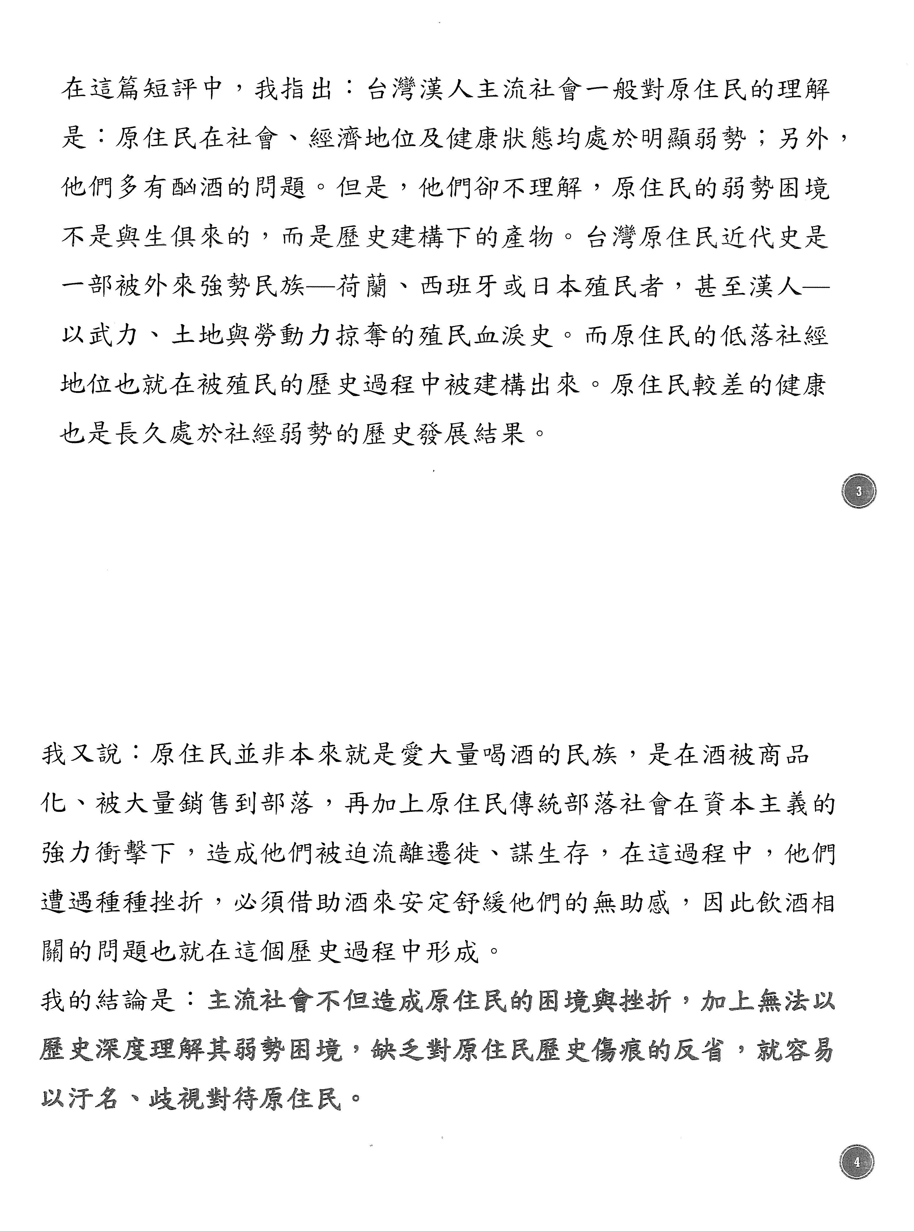 我接著會指出指導原則,這些原則是以反種族主義和解殖民主義方法為依據,授以臺灣定居者殖民主義。這一篇原住民族健康法立法公聽會講稿,也專門針對制訂法案政策的官員們和立法委員們,最重要的是,你們具備了這樣解殖的意識形態嗎?其意識形態清楚的說明,除了妥善的醫療照顧以及協助原住民個人生理上的需求之外,更重要的是應具備一一解殖、反殖民主義的意識。進一步闡述,對該法案的核心價值、歷史定位、立法精神就是反種族主義和解殖。