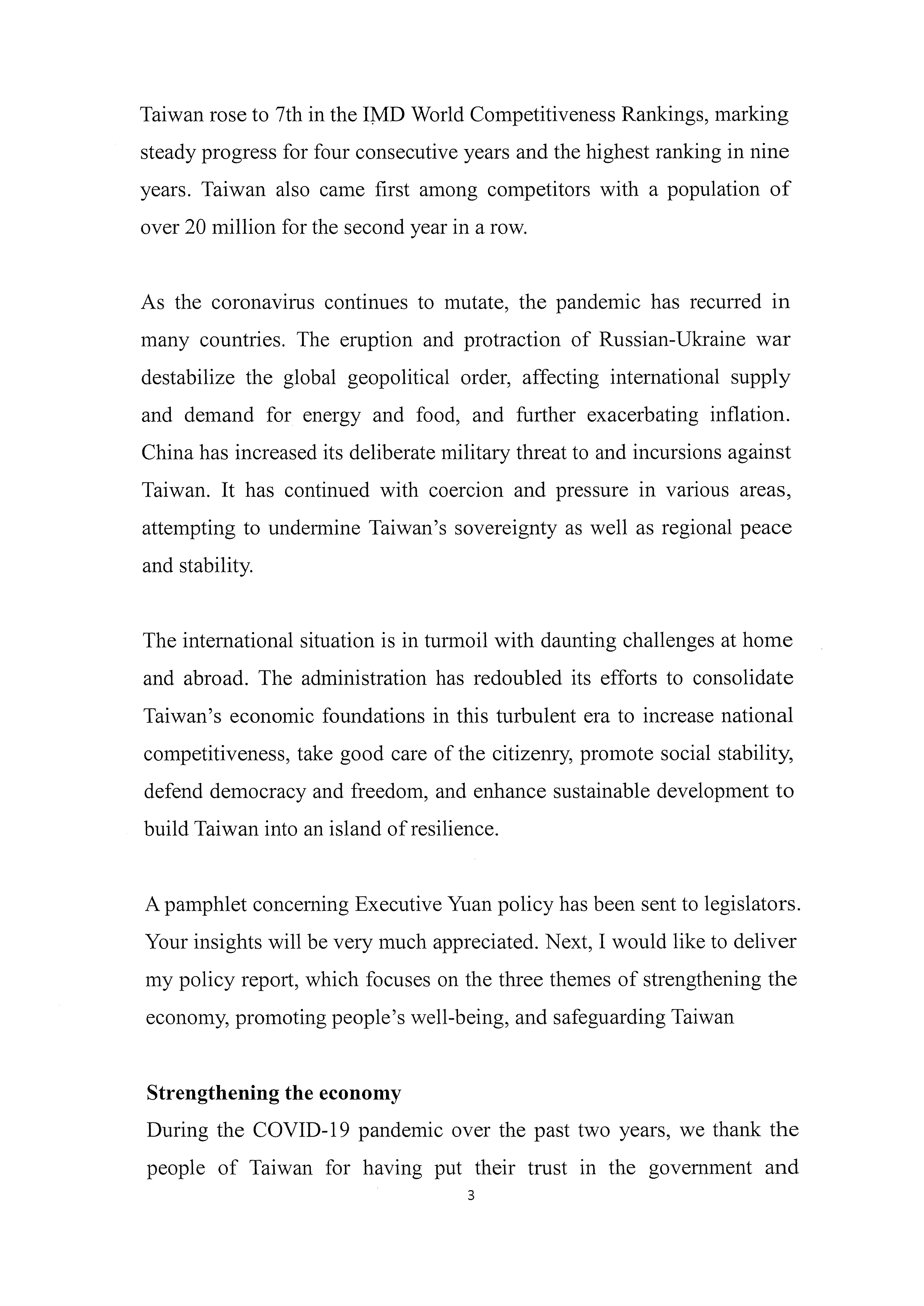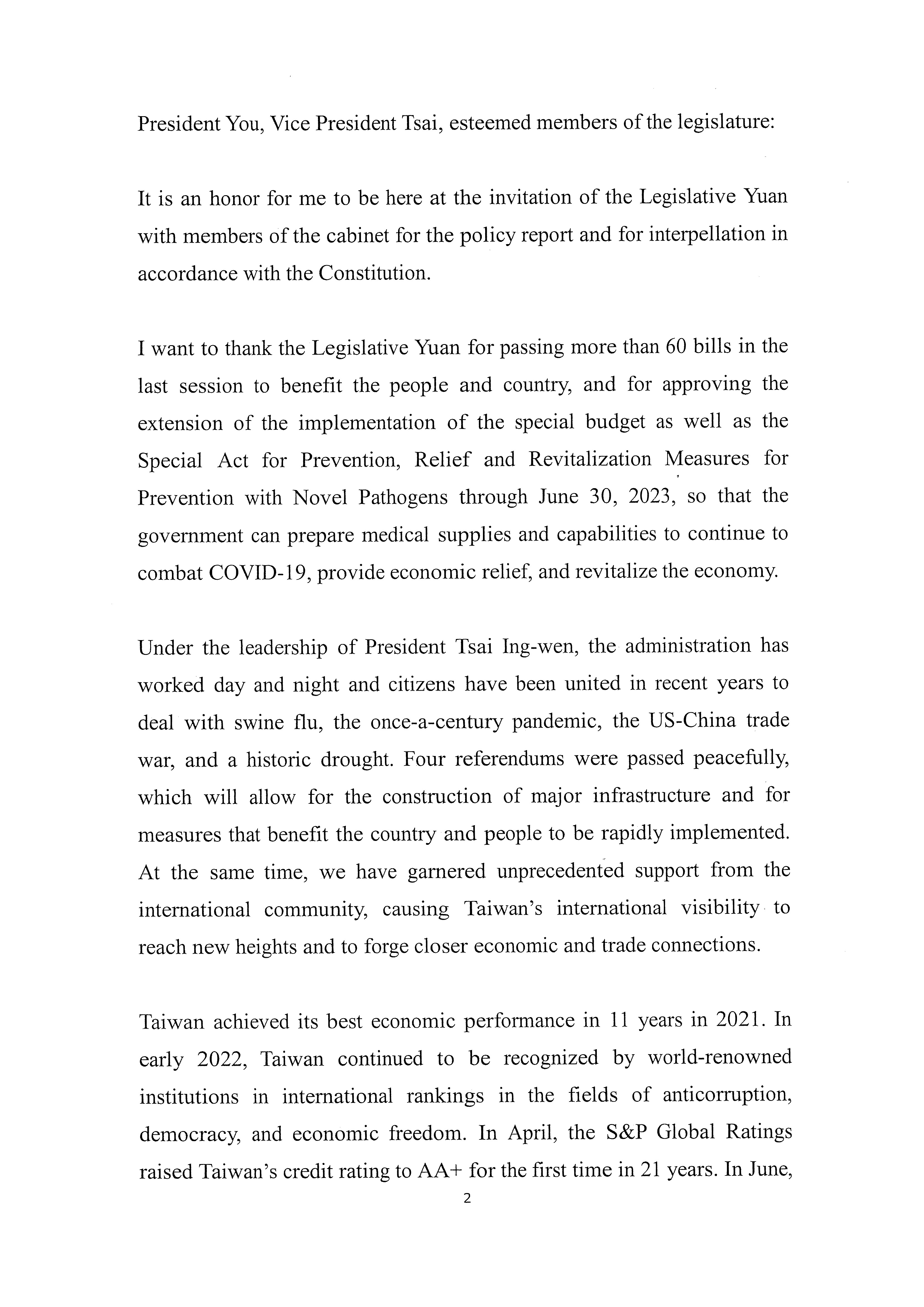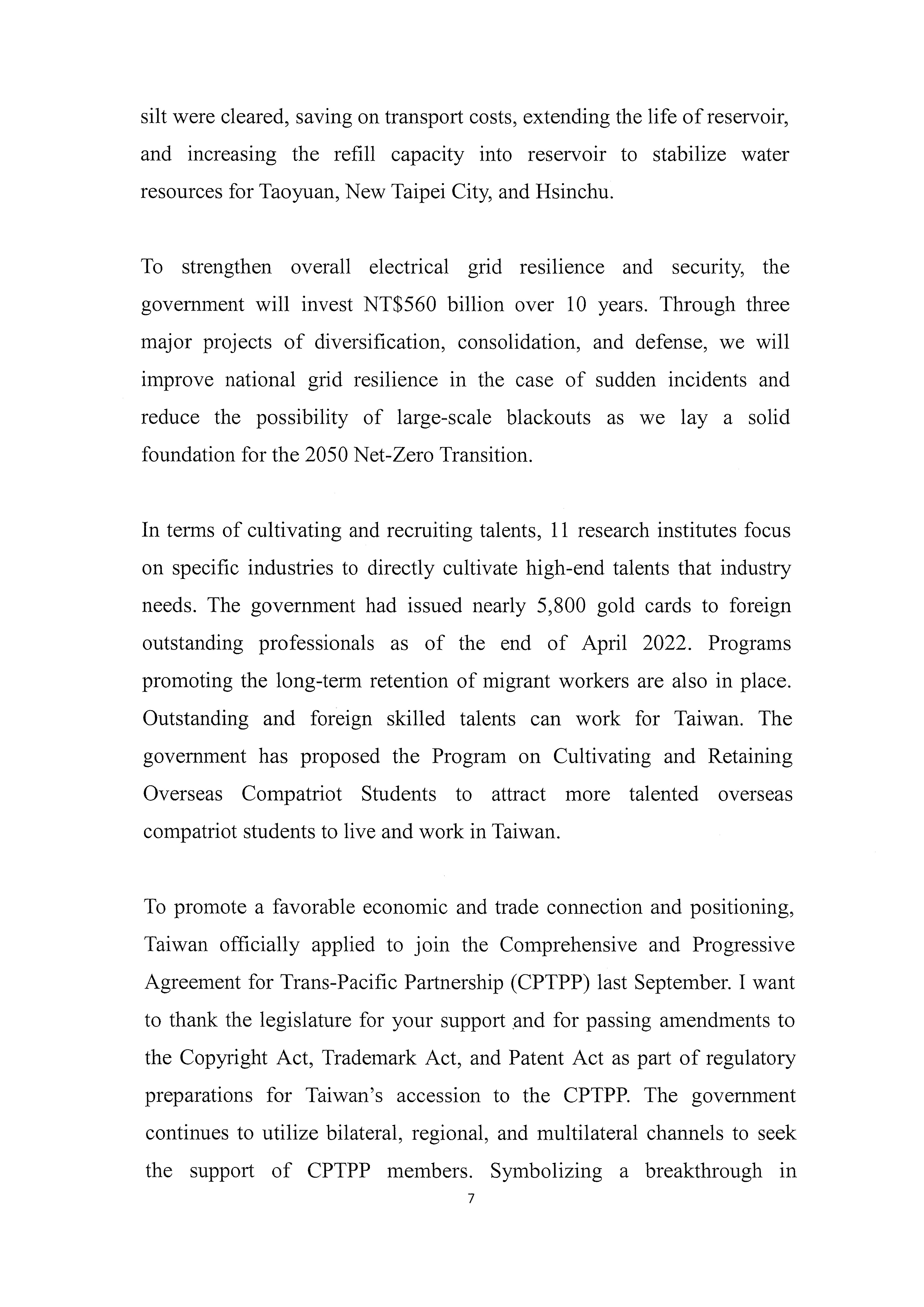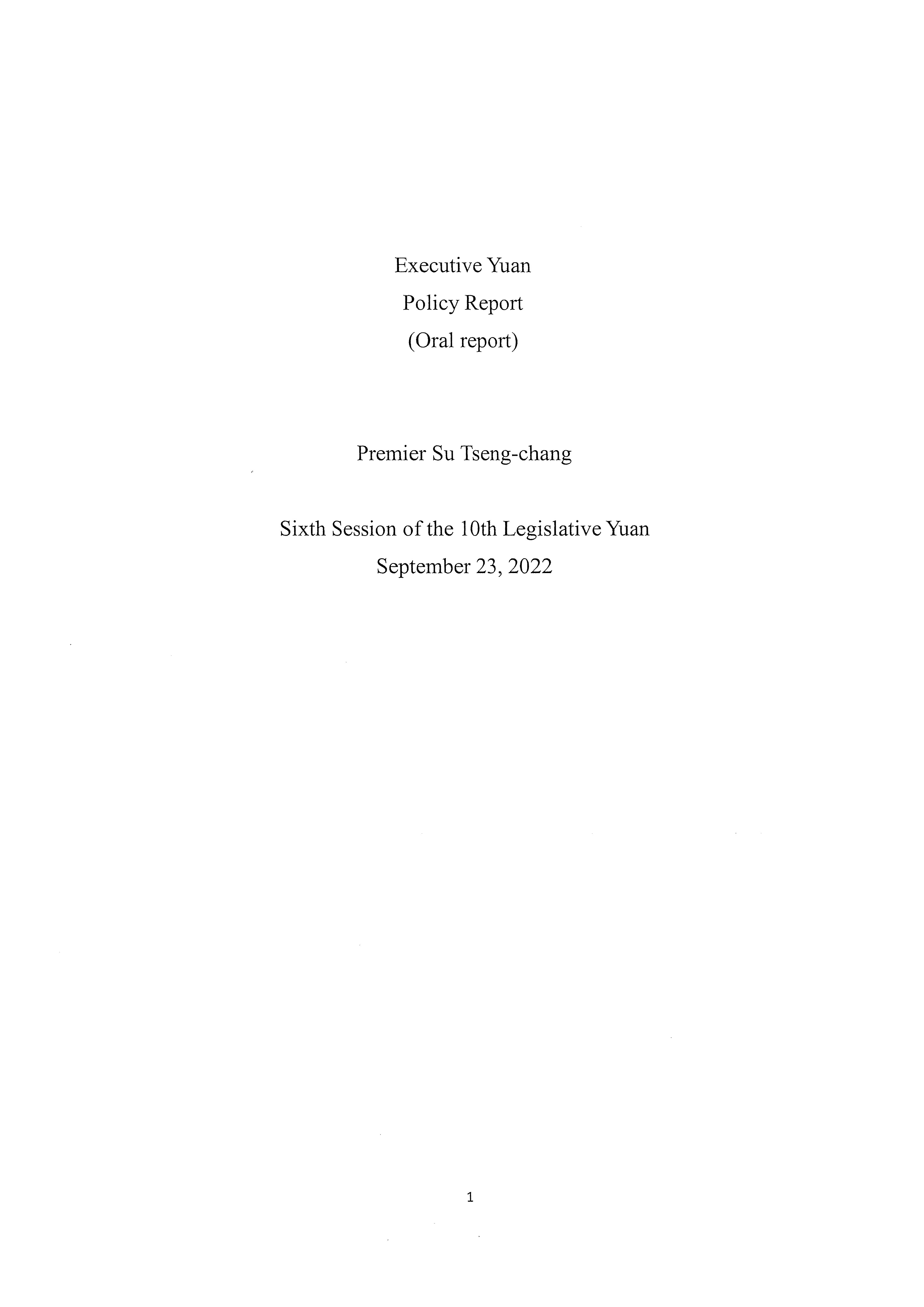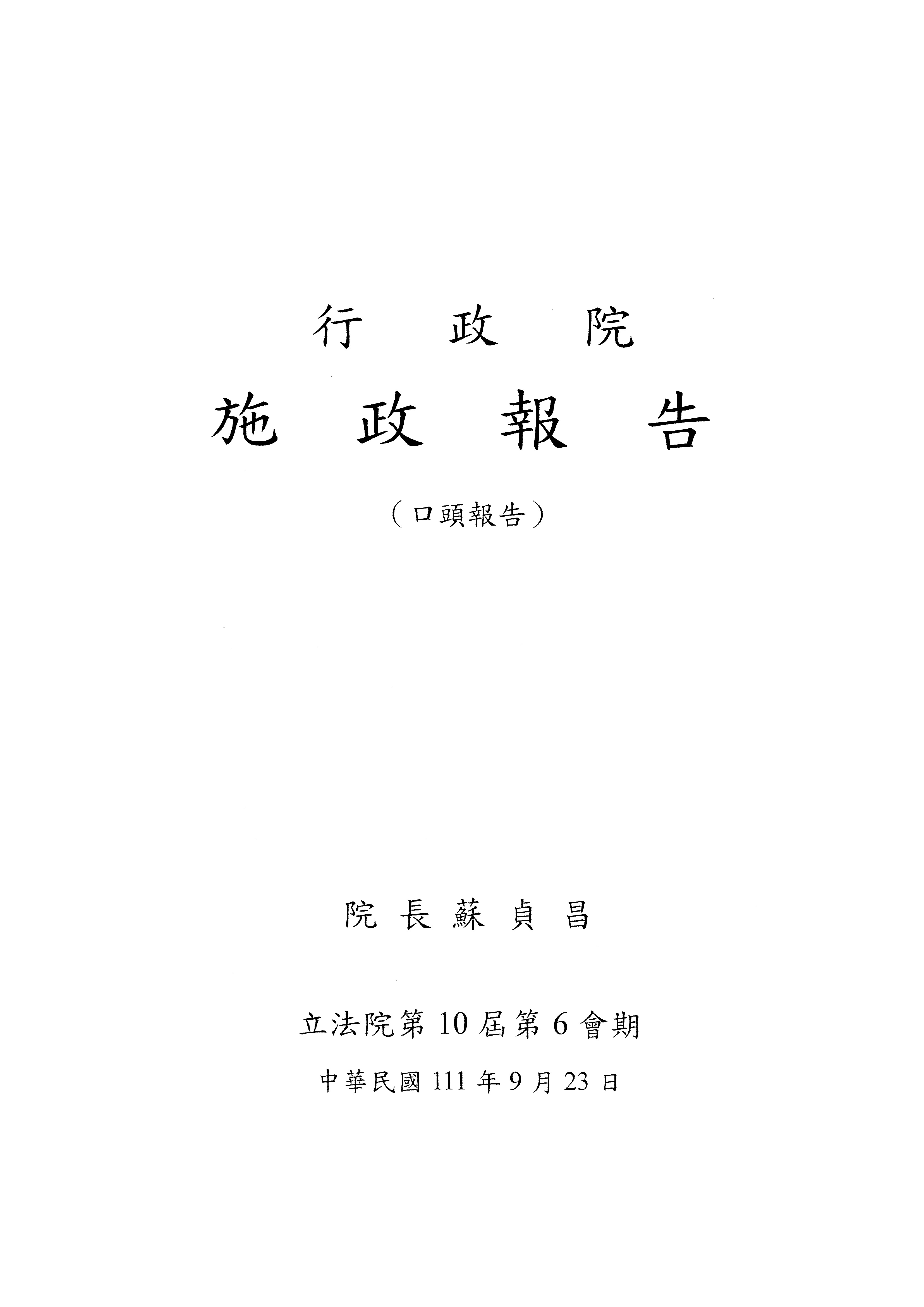 補刊:立法院公報第111卷第86期第10屆第6會期行政院院長口頭施政報告英譯對照版