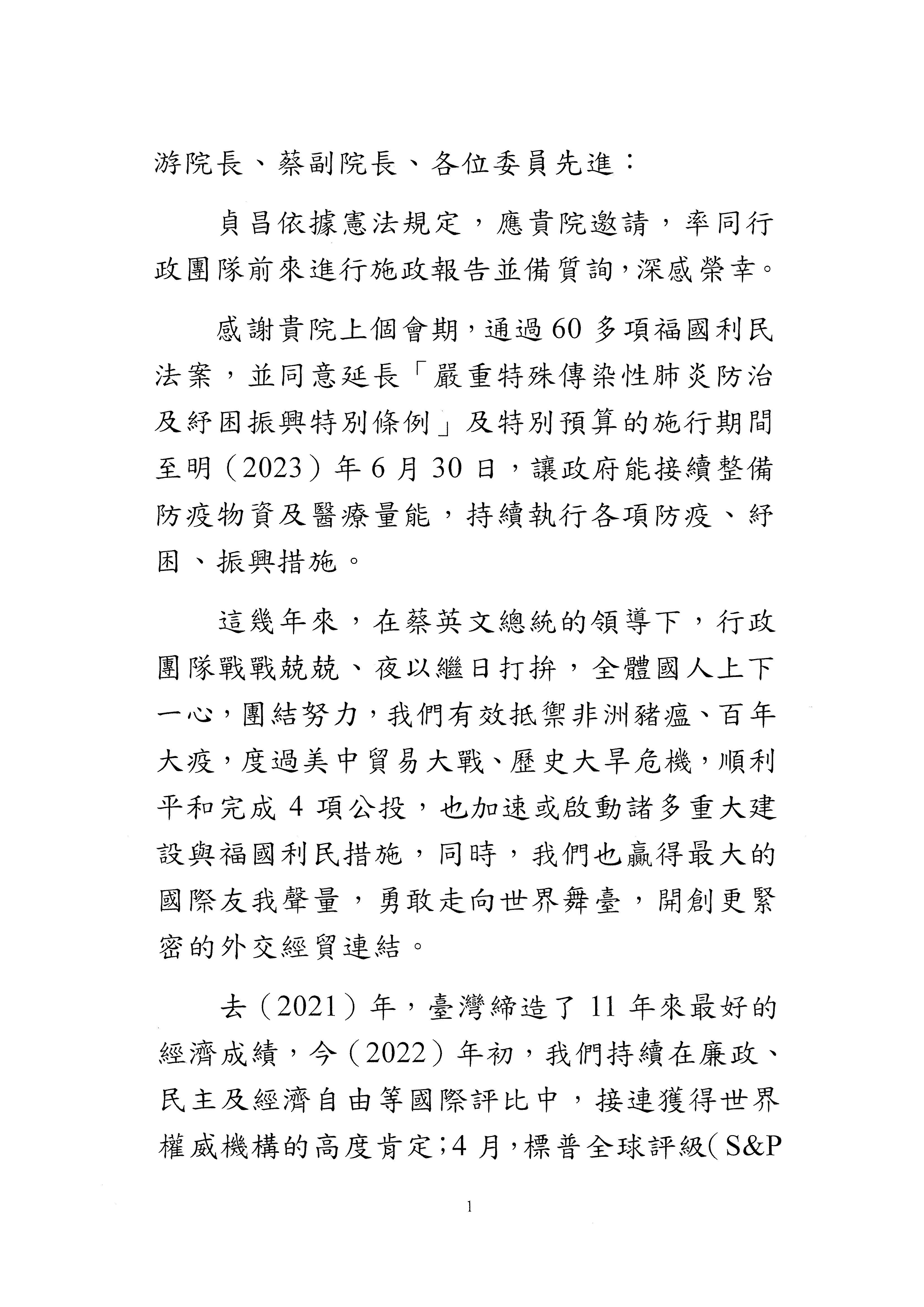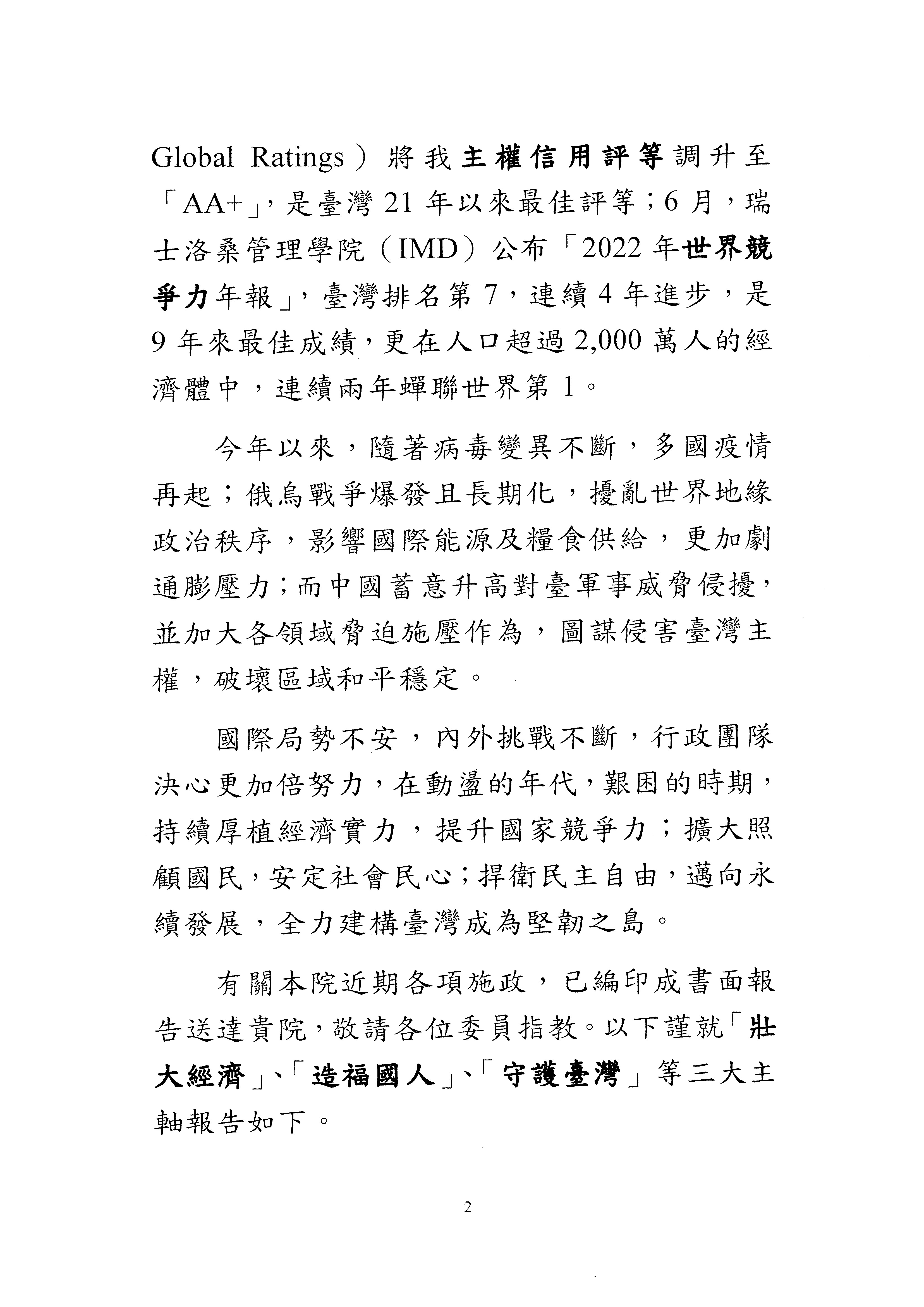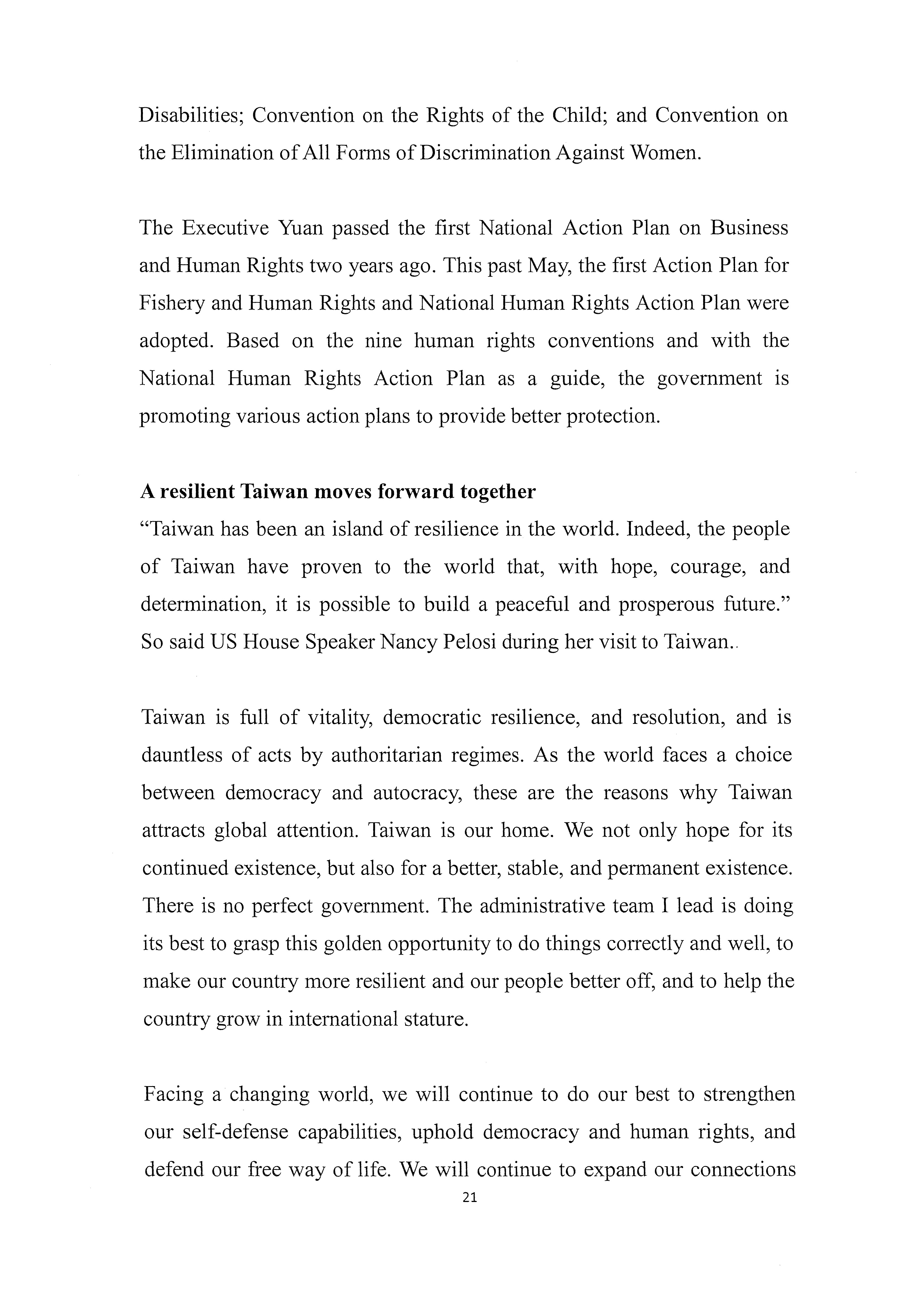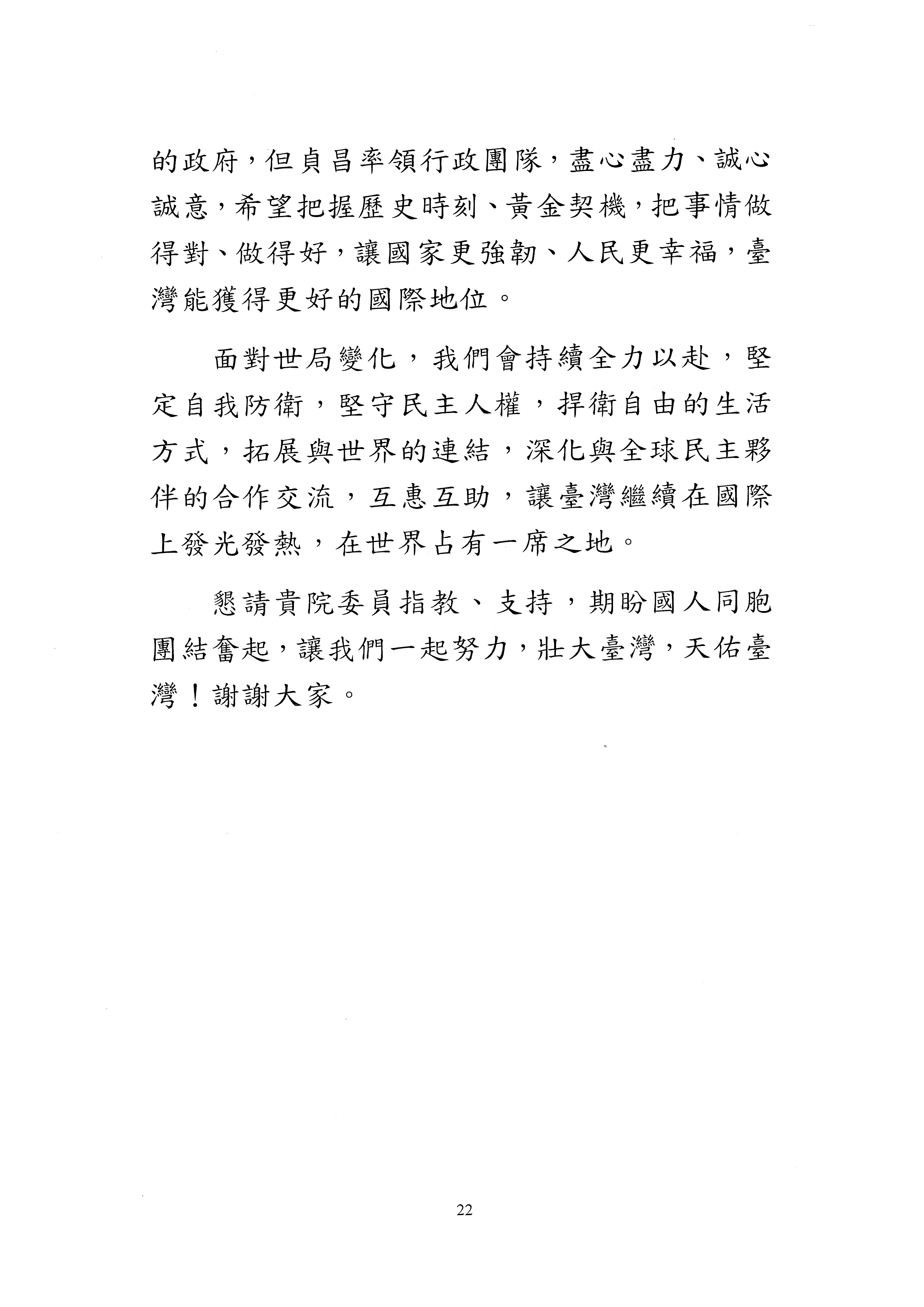 補刊:立法院公報第111卷第86期第10屆第6會期行政院院長口頭施政報告英譯對照版