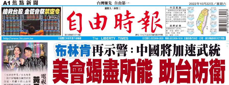 部長,美國國務卿布林肯本(10)月17日及20日接受美媒專訪時,接連兩次示警指出習近平邁入第三任期,北京當局將會動用包括武力在內的「任何必要手段」,以尋求兩岸快速統一。