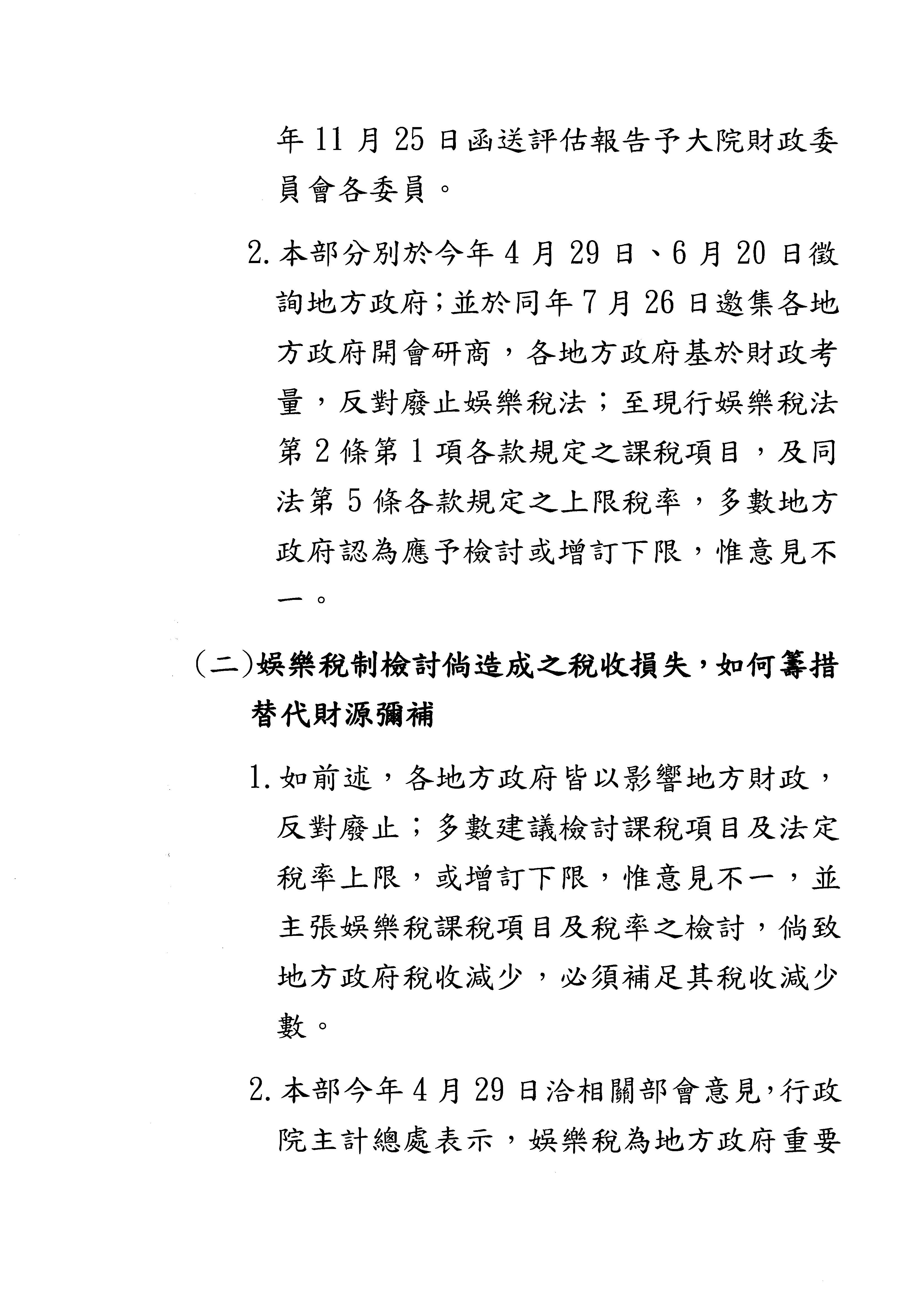 我們為了做相關的檢討和評估,其實從今年年初的4月29日,也就是在財委會作成相關臨時提案之前,包括4月29日、6月20日,我們就一直在徵詢地方政府的意見,7月26日也邀集各地方政府來開會研商,像臺中市政府、臺北市政府這兩個稅處的代表也有表示意見,當然,地方政府基於財政考量,原則上都反對廢止娛樂稅法。