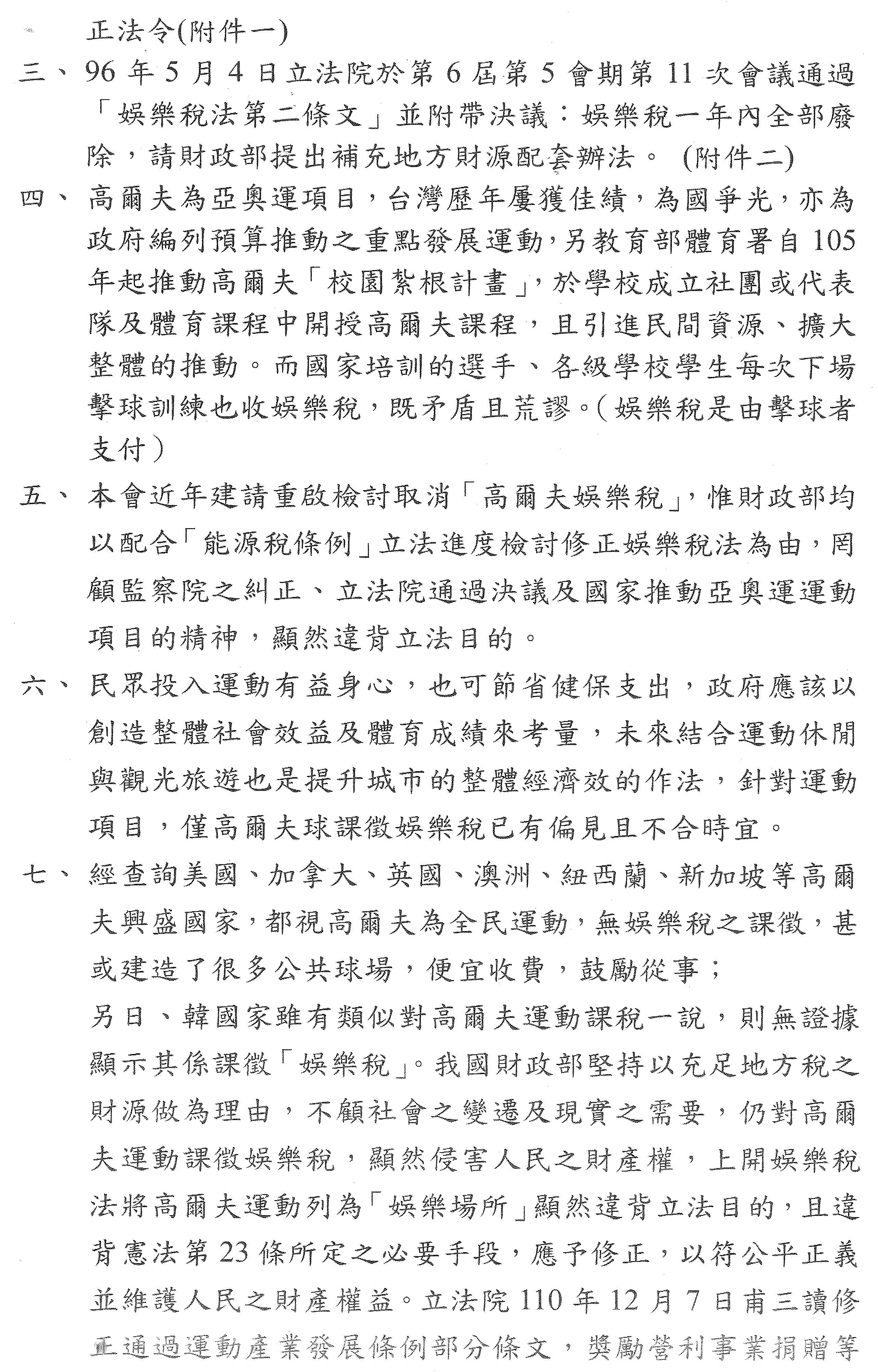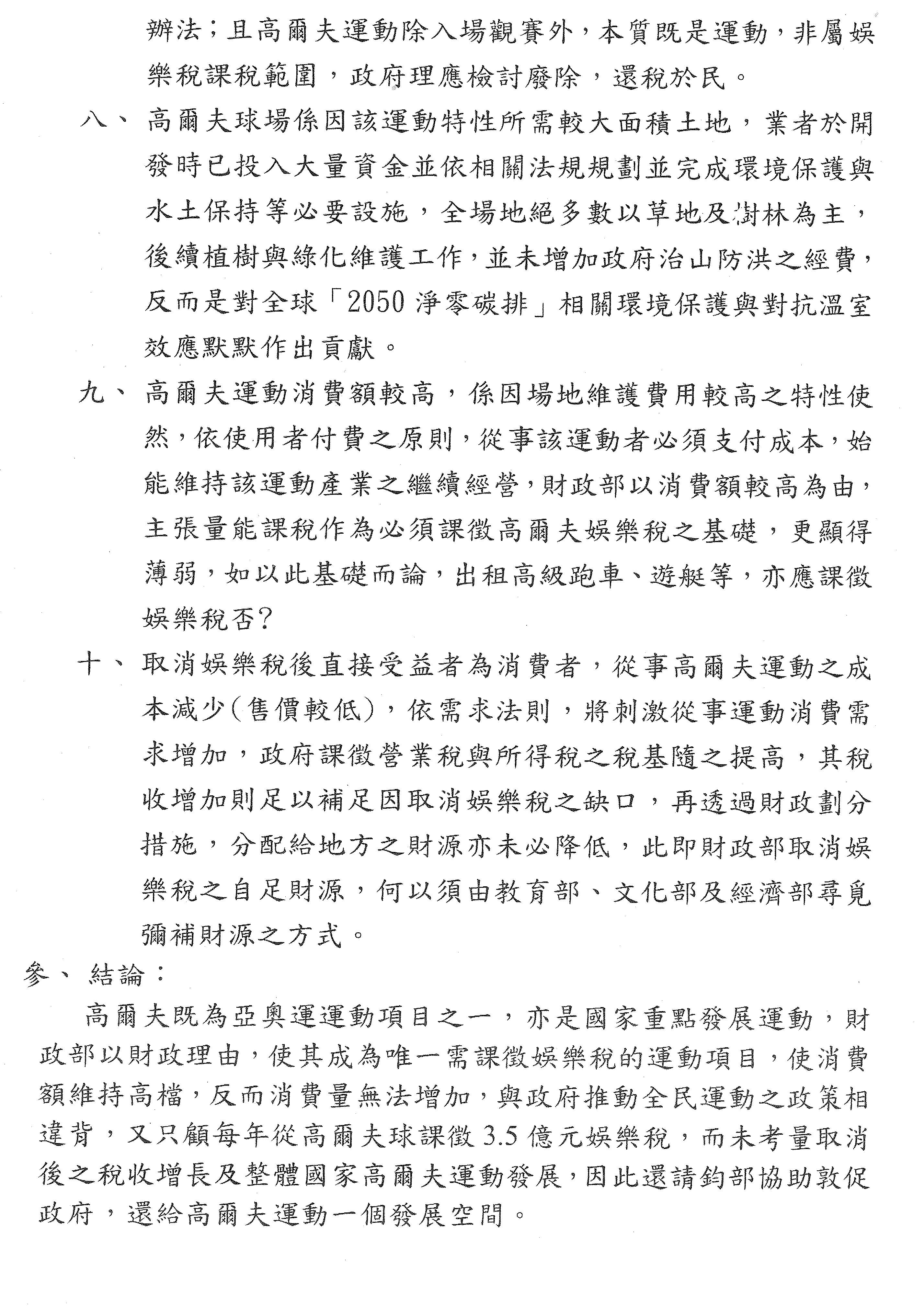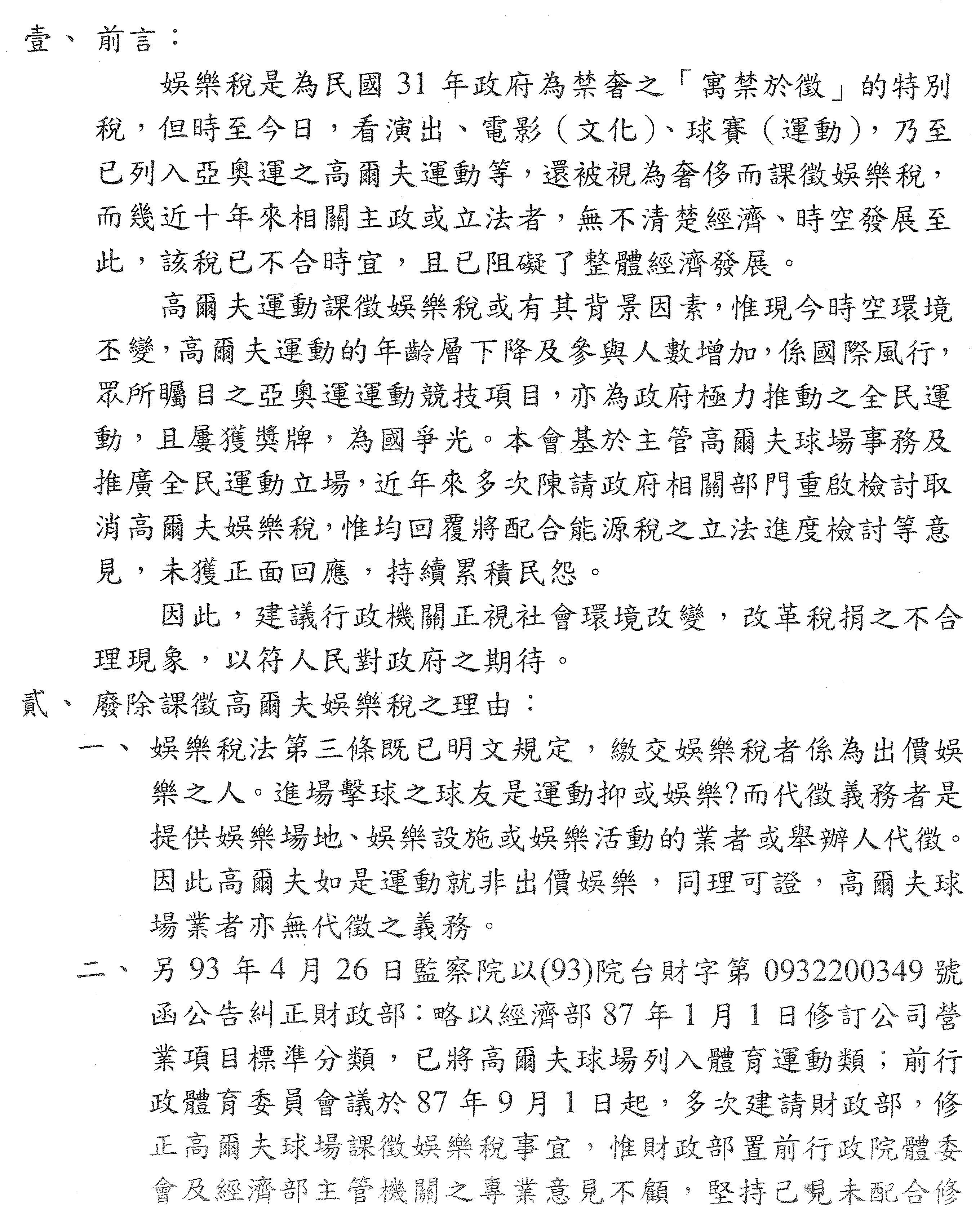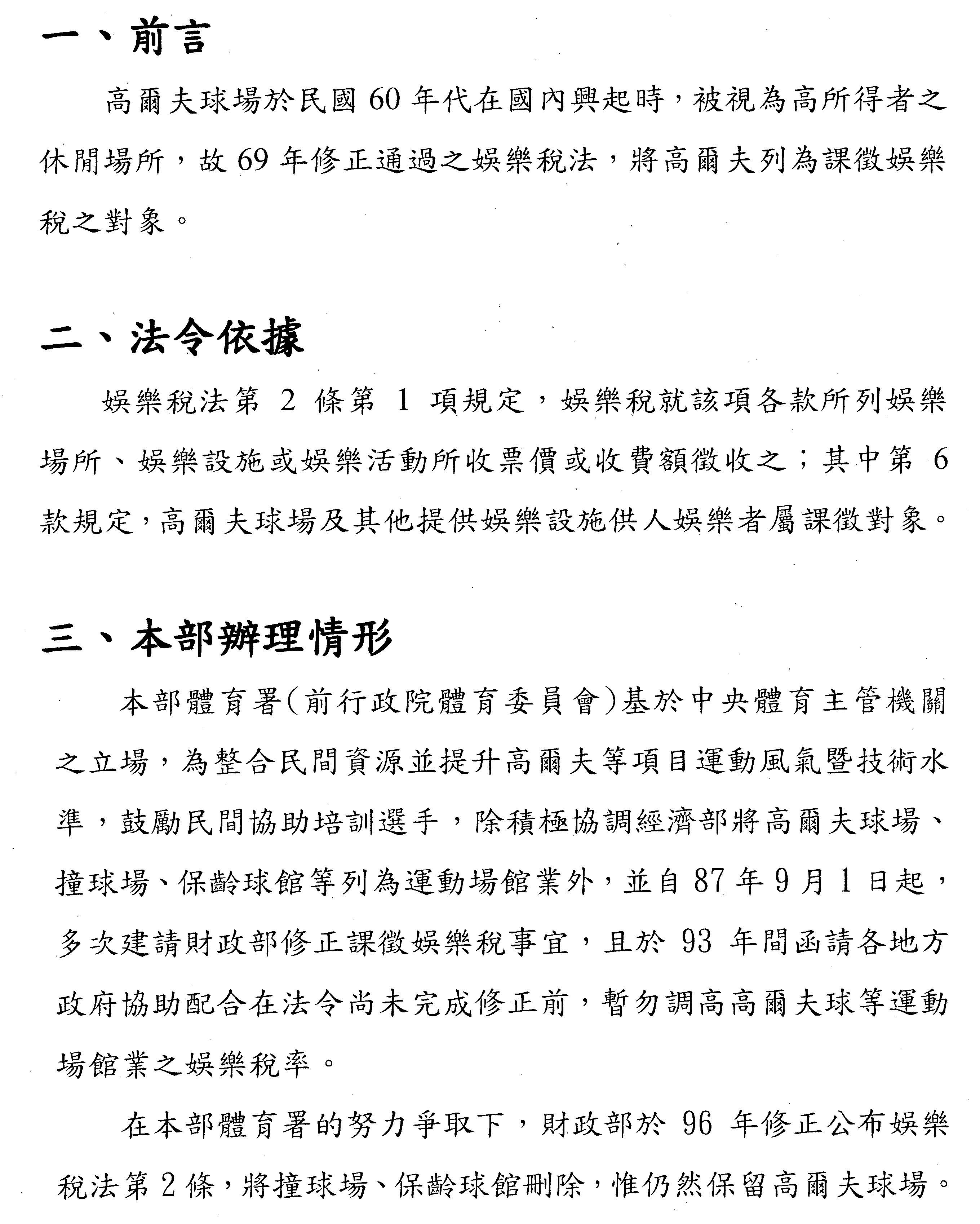 我想娛樂稅的繳交是出價娛樂的人,經常打球的人其實是運動,並不是娛樂,至於代徵的義務者,我們提供的是運動的場地,並不是娛樂的場地,所以高爾夫是運動,並不是娛樂,因此高爾夫球業者其實也並沒有代徵娛樂稅的義務。另外,我剛剛講我們爭取娛樂稅廢除的案子,已經努力超過20年了,在民國93年時,其實監察院也已經發出糾正函給財政部,但財政部總是認為各個體系還有主管機關的專業意見都不同,所以他們還是很堅持要徵收娛樂稅。另外,在96年立法院第六屆第五會期的會議裡面也通過娛樂稅法第二條條文,決議娛樂稅一年以內應該要全部廢除,同時也請財政部提出補充地方財源的配套措施。