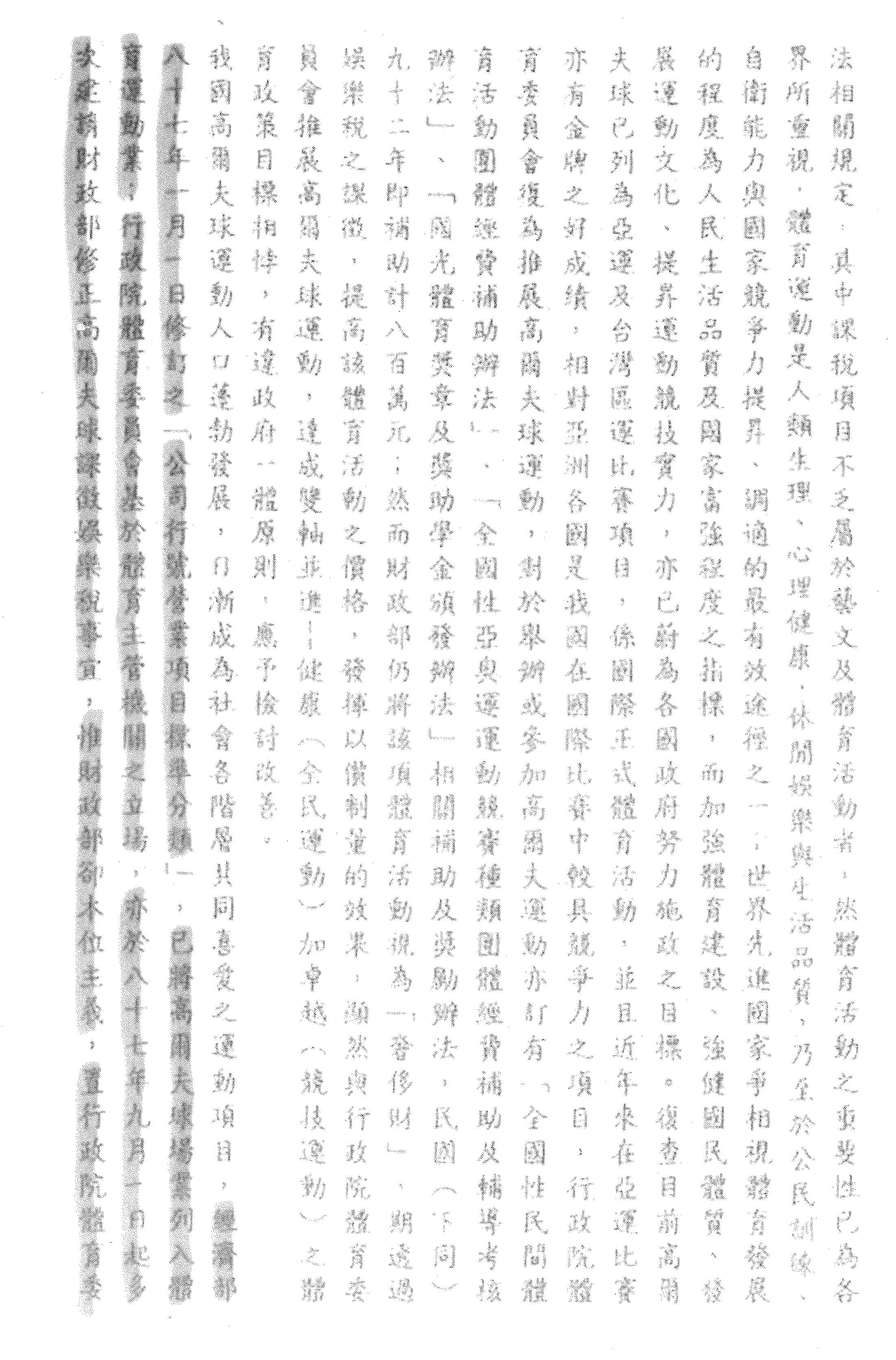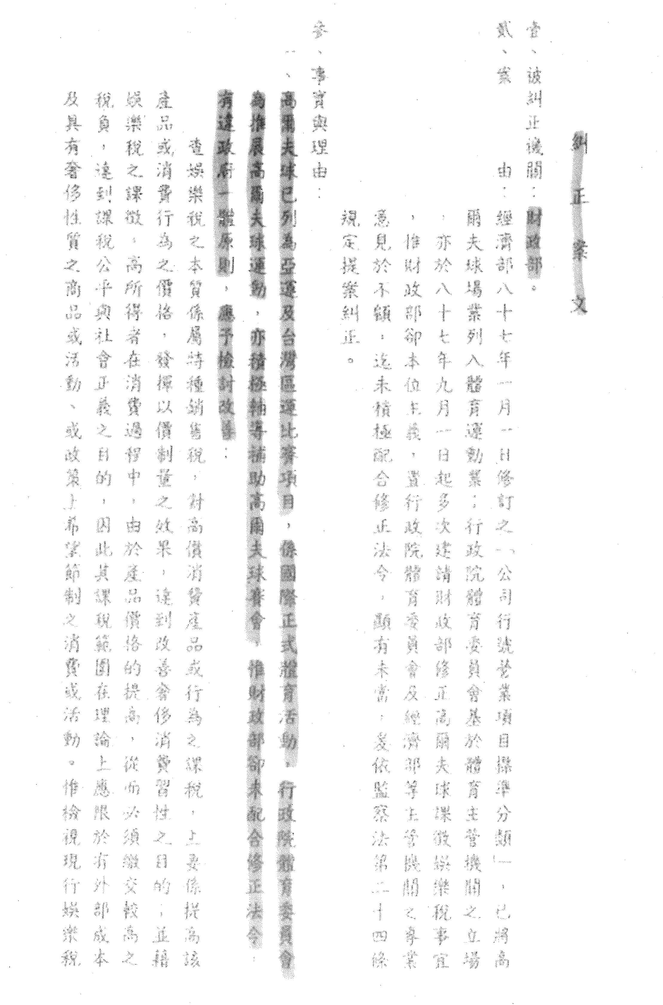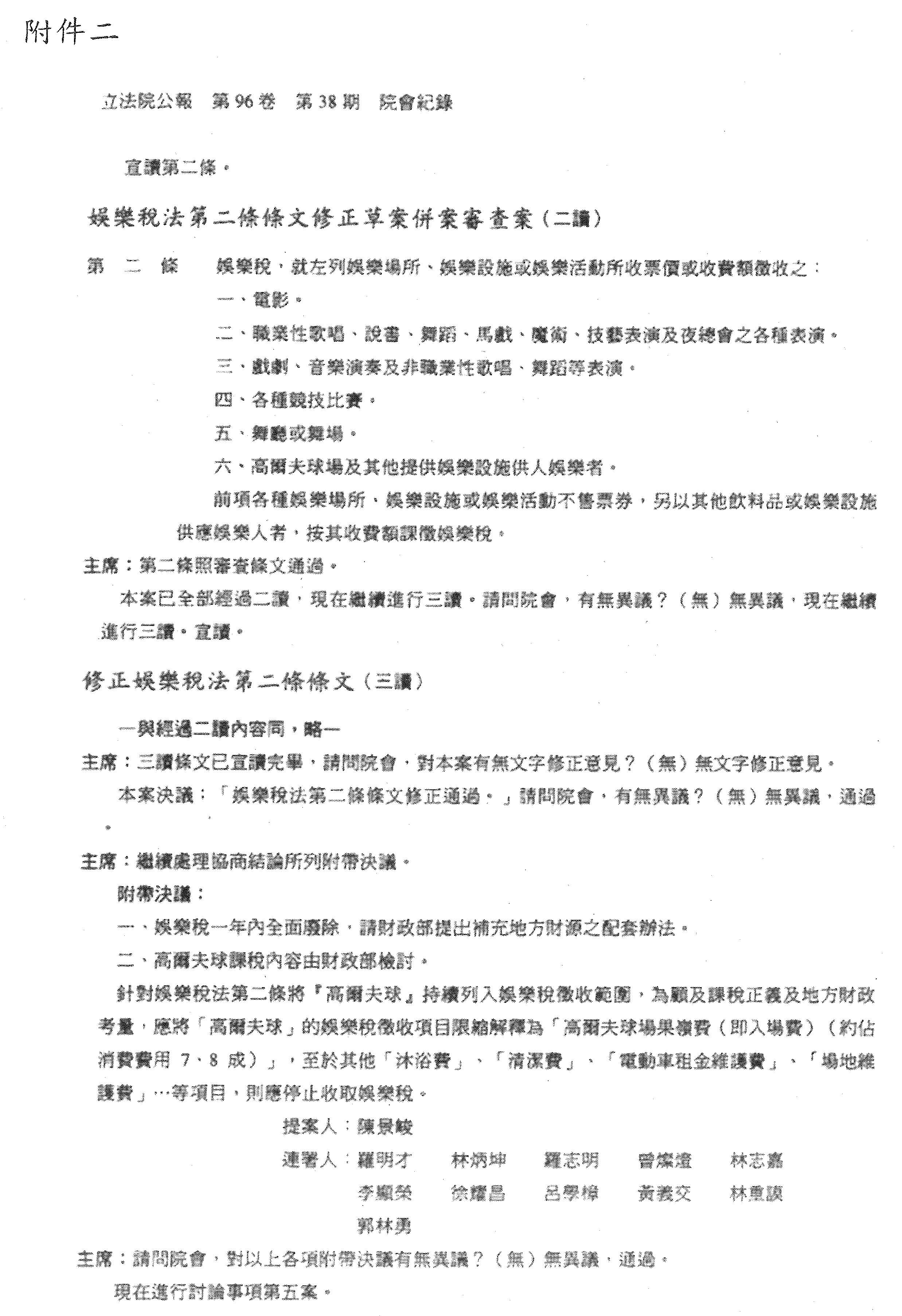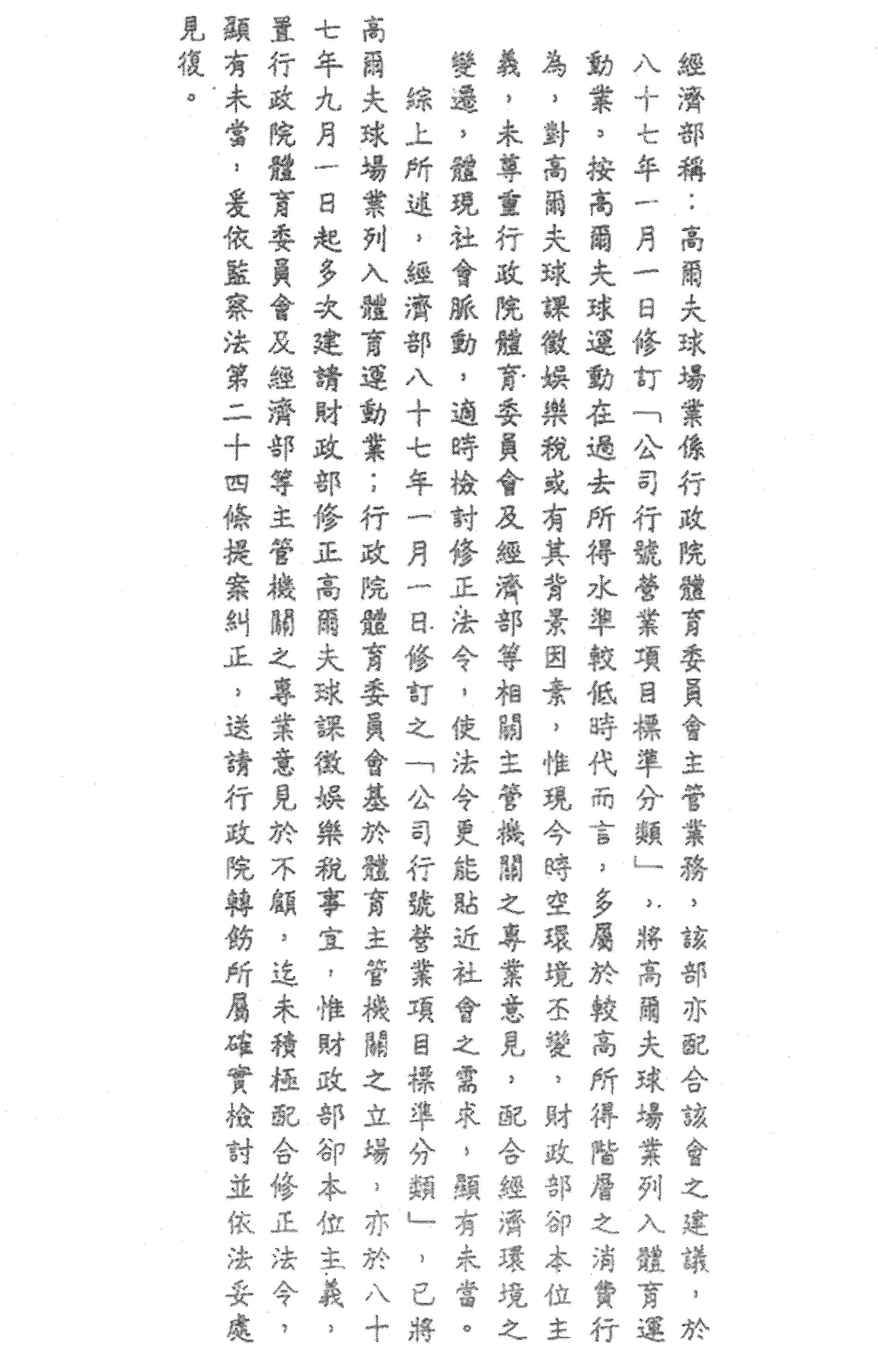 我想娛樂稅的繳交是出價娛樂的人,經常打球的人其實是運動,並不是娛樂,至於代徵的義務者,我們提供的是運動的場地,並不是娛樂的場地,所以高爾夫是運動,並不是娛樂,因此高爾夫球業者其實也並沒有代徵娛樂稅的義務。另外,我剛剛講我們爭取娛樂稅廢除的案子,已經努力超過20年了,在民國93年時,其實監察院也已經發出糾正函給財政部,但財政部總是認為各個體系還有主管機關的專業意見都不同,所以他們還是很堅持要徵收娛樂稅。另外,在96年立法院第六屆第五會期的會議裡面也通過娛樂稅法第二條條文,決議娛樂稅一年以內應該要全部廢除,同時也請財政部提出補充地方財源的配套措施。