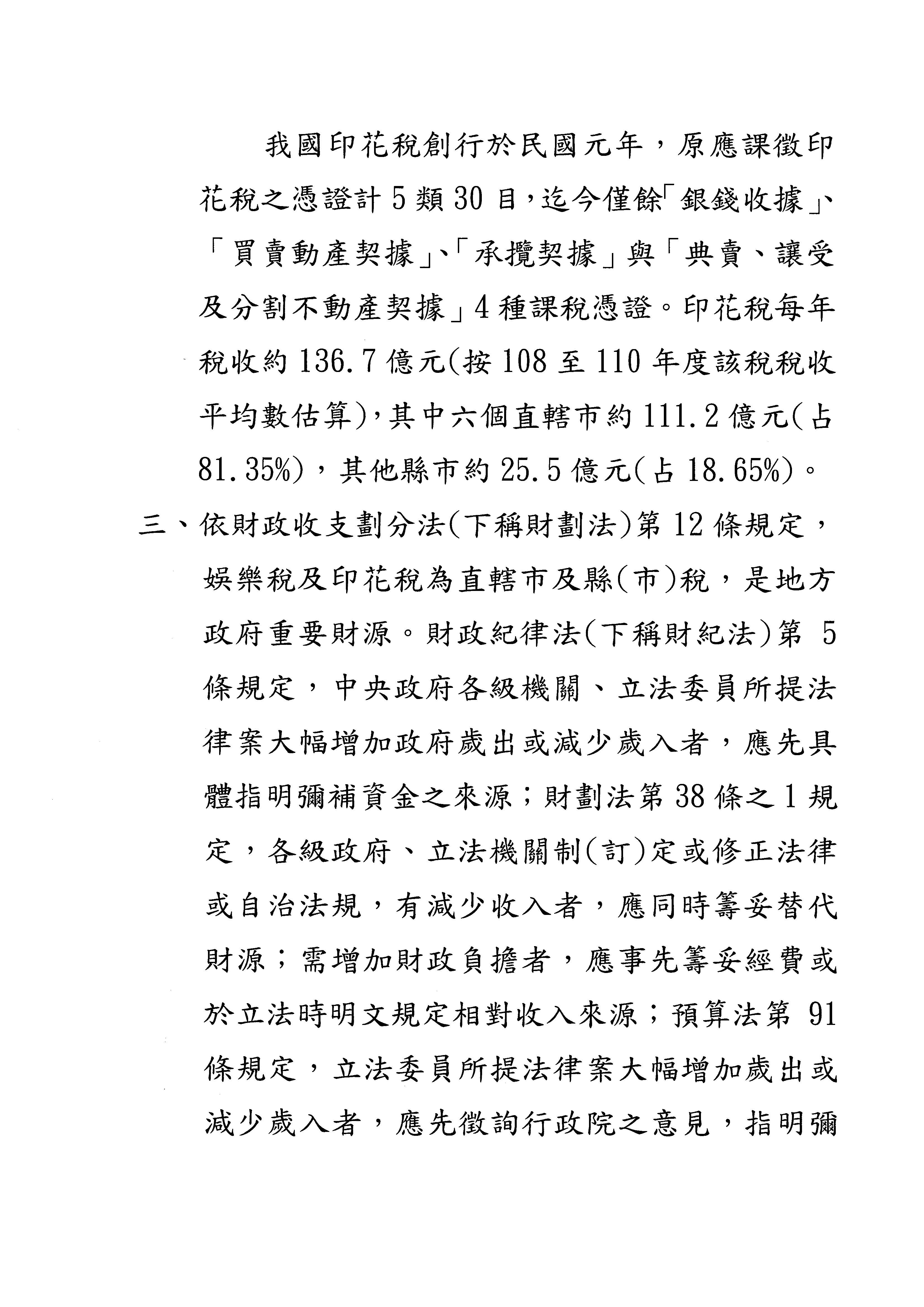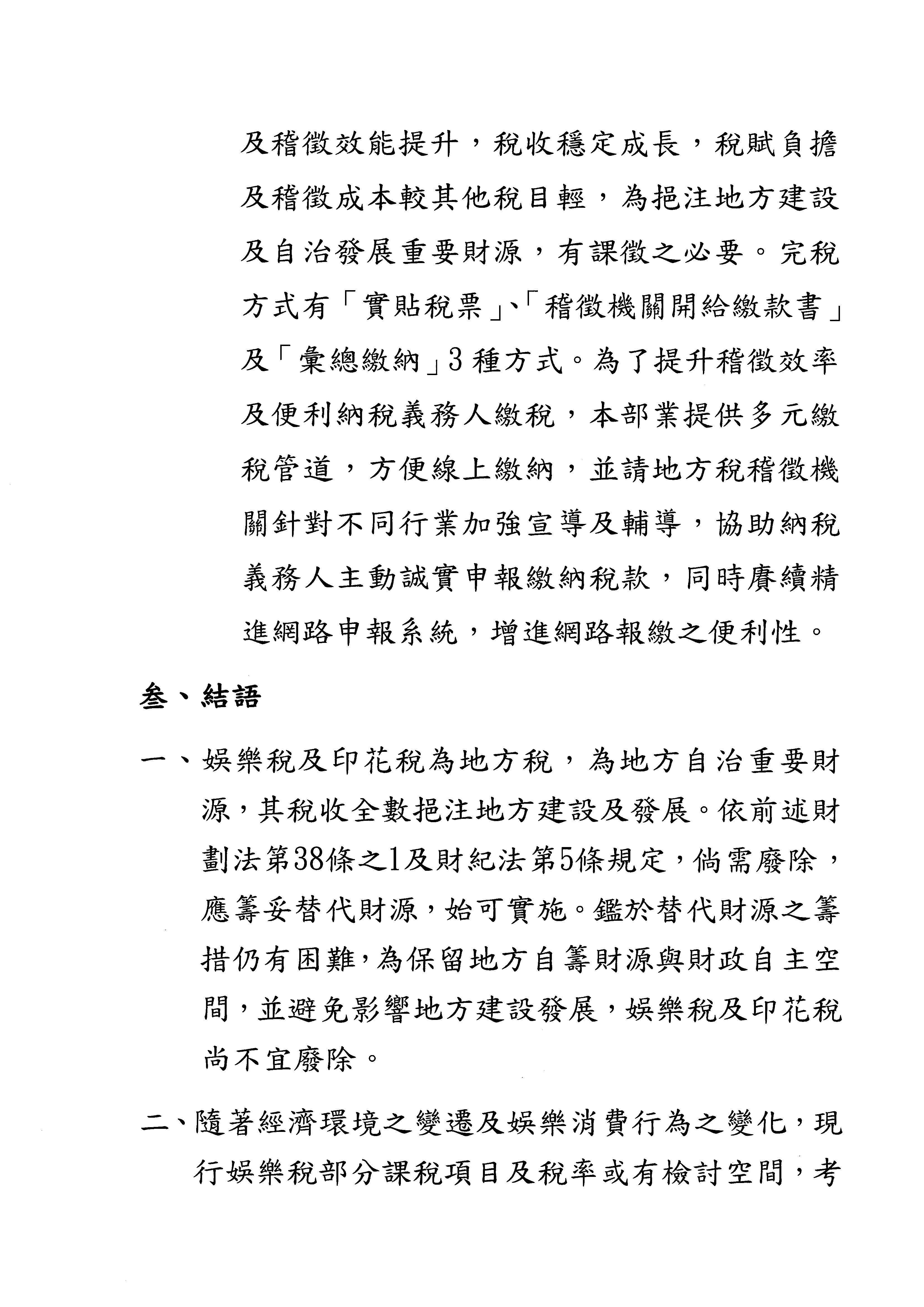 綜合以上,我們認為印花稅仍然有存在的必要。至於娛樂稅也有討論到一部分,娛樂稅是怎麼修的問題,而不是把它廢掉,同理,印花稅也有一些部分是可以調整的。我再次強調,財政部在這幾年當中帶領著地方稅稽徵機關不斷地精進稽徵作業、減少業者繳納成本的負擔,並且讓大家便利,這些是中央跟地方一直持續在努力的,也是必要走的道路。