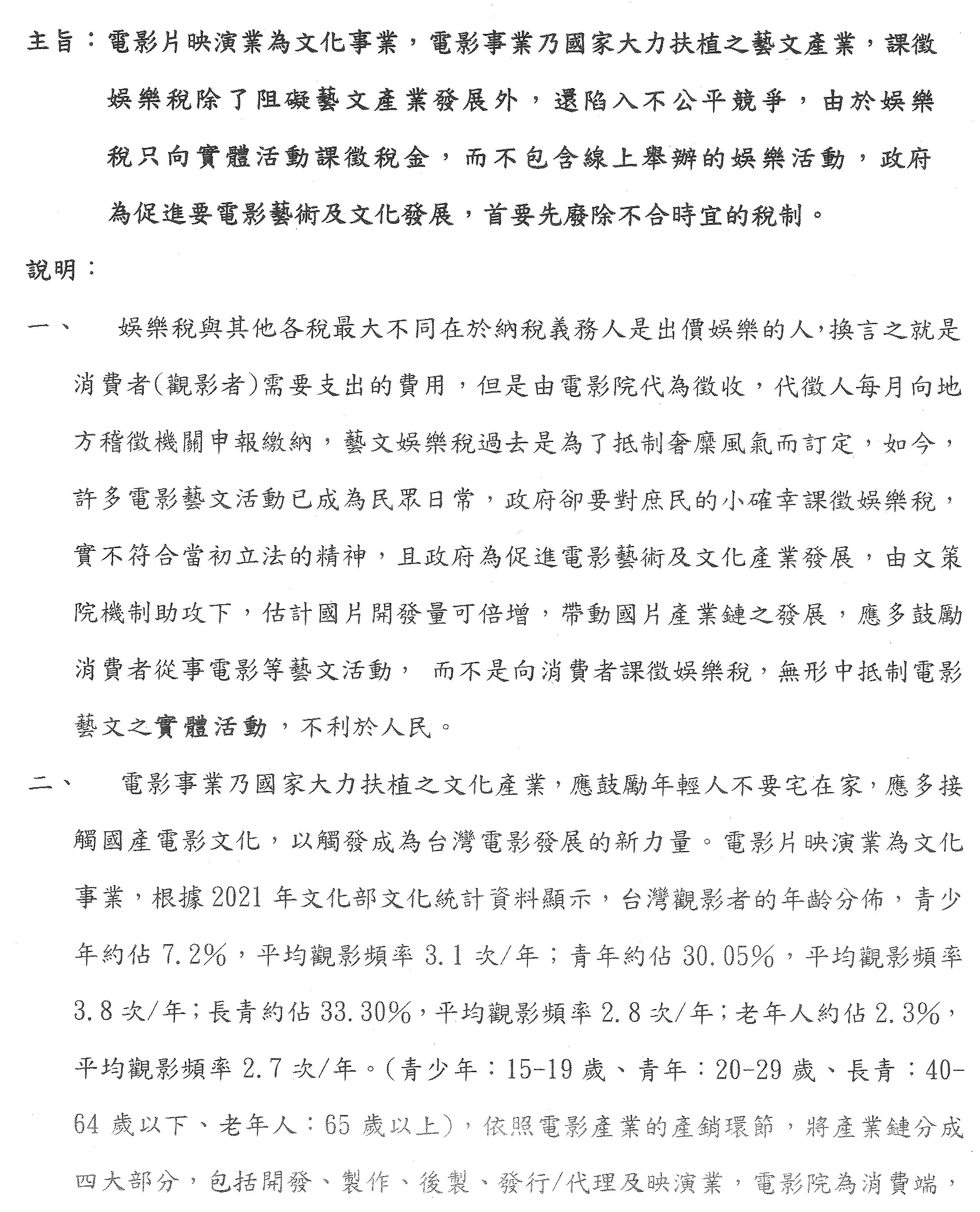 中華民國電影戲劇商業同業公會全國聯合會書面意見: