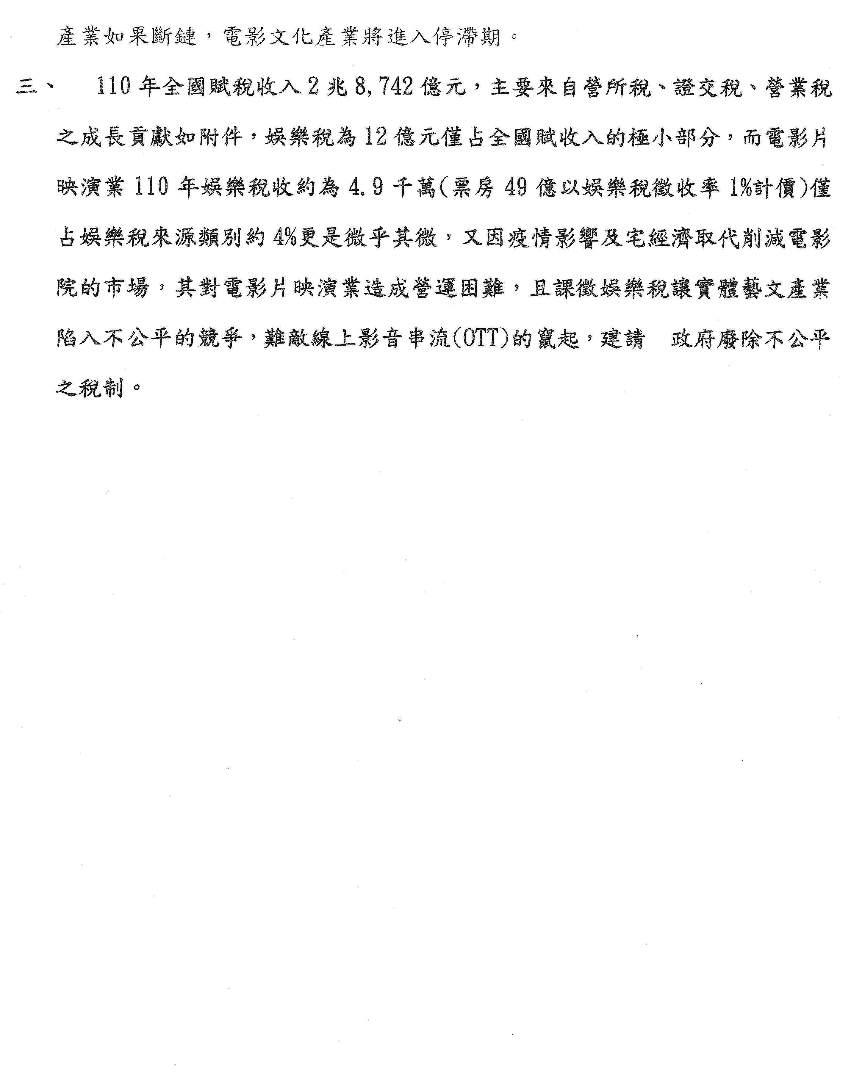 娛樂稅部分也是一樣,雖然臺北市每年稅收大概是2億,這幾年因疫情影響而不好,大概只有一億多,但這也是一筆經費收入,這個部分如果要刪減掉,我們也希望能有所補助。