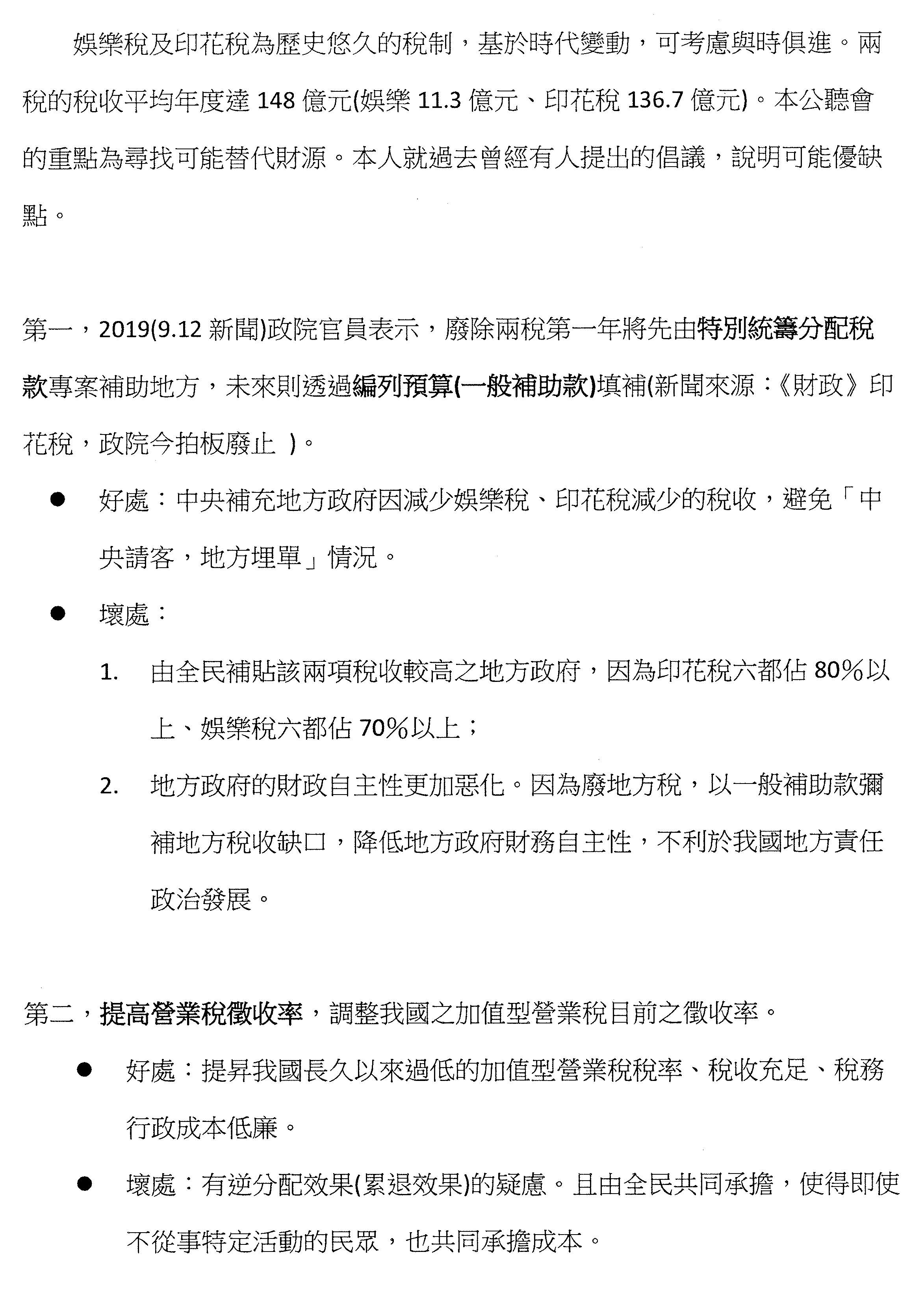另外,以娛樂稅來講,比如今天有一個爭點是關於高爾夫球,有些立場認為高爾夫球不宜拿掉的原因是什麼?其實原因並不在於它是不是娛樂,而是在於大家覺得它會不會破壞水土保持、破壞環境。從這個角度來看,高爾夫球場本身是不是該被徵收什麼稅,那個概念可能也不是靠娛樂稅這件事來幫忙解決的,比如解決它的環保問題,或者它造成負面外部性的問題是不是要靠娛樂稅來解決,所以我必須這樣講,今天的公聽會在概念上其實是混淆了好幾件事把它放在一起來談。第一個,我們要談這個稅制需不需要;第二個,我們要談地方的稅損怎麼解決,甚至再加上某些特定的稅課項目本身是不是要用娛樂稅這個工具去解決它的問題,比如它衍生的問題只能靠娛樂稅,所以其實是有一點點複雜的議題,如果我們今天把這三個東西混在一起談,說實話是很難解的。