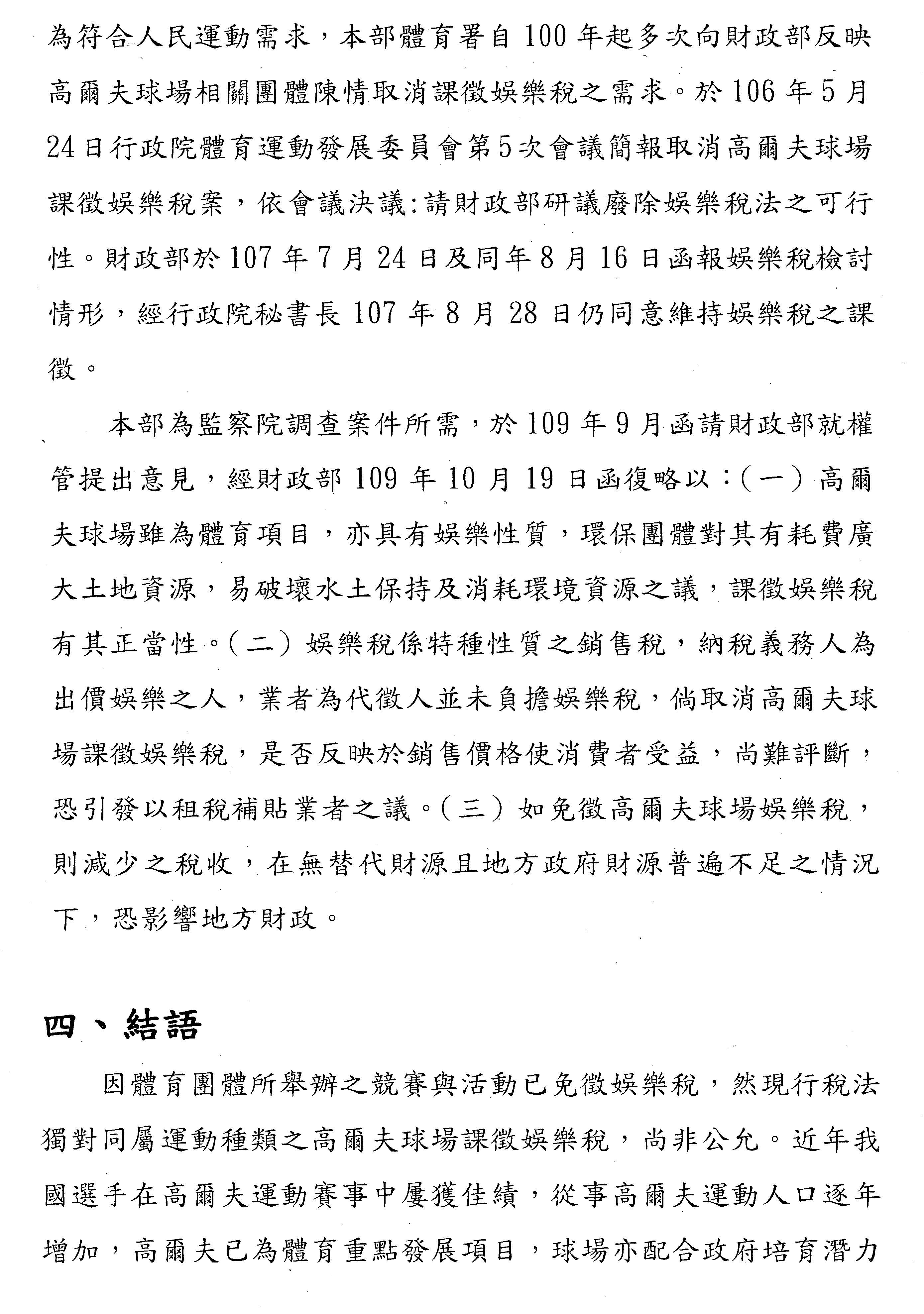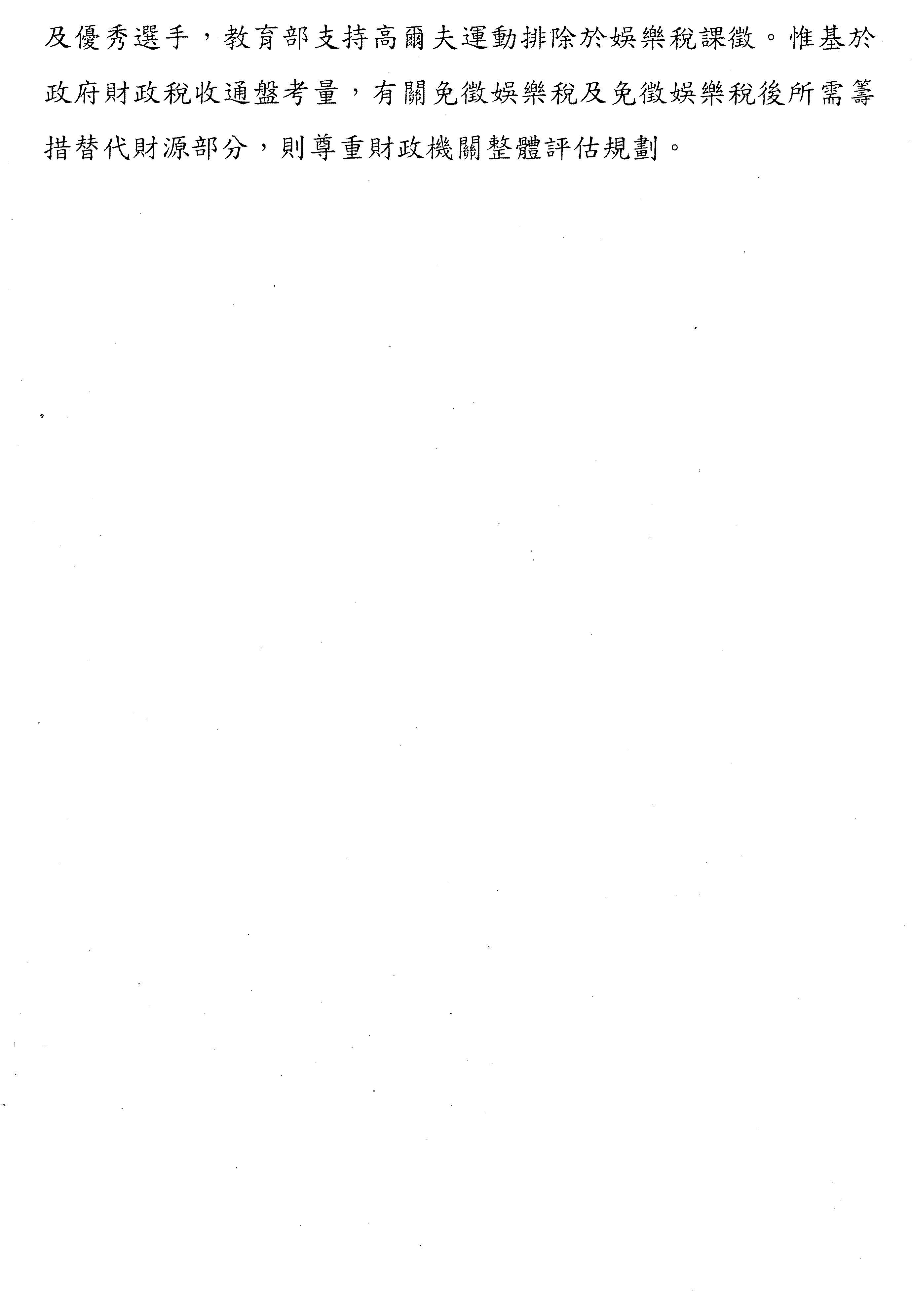 近年來我國的選手在高爾夫球場的運動賽事中屢獲佳績,從事高爾夫球運動的人口也會增加,高爾夫運動會列為體育的重點發展項目,球場也配合政府一起努力培育優秀跟優良的選手,所以教育部支持將高爾夫運動排除於娛樂稅的課徵,但是基於政府財政稅收的通盤考量,關於如果免徵娛樂稅跟免徵後所需籌措替代財源的部分,我們尊重財政機關的整體評估規劃,以上說明,謝謝。
