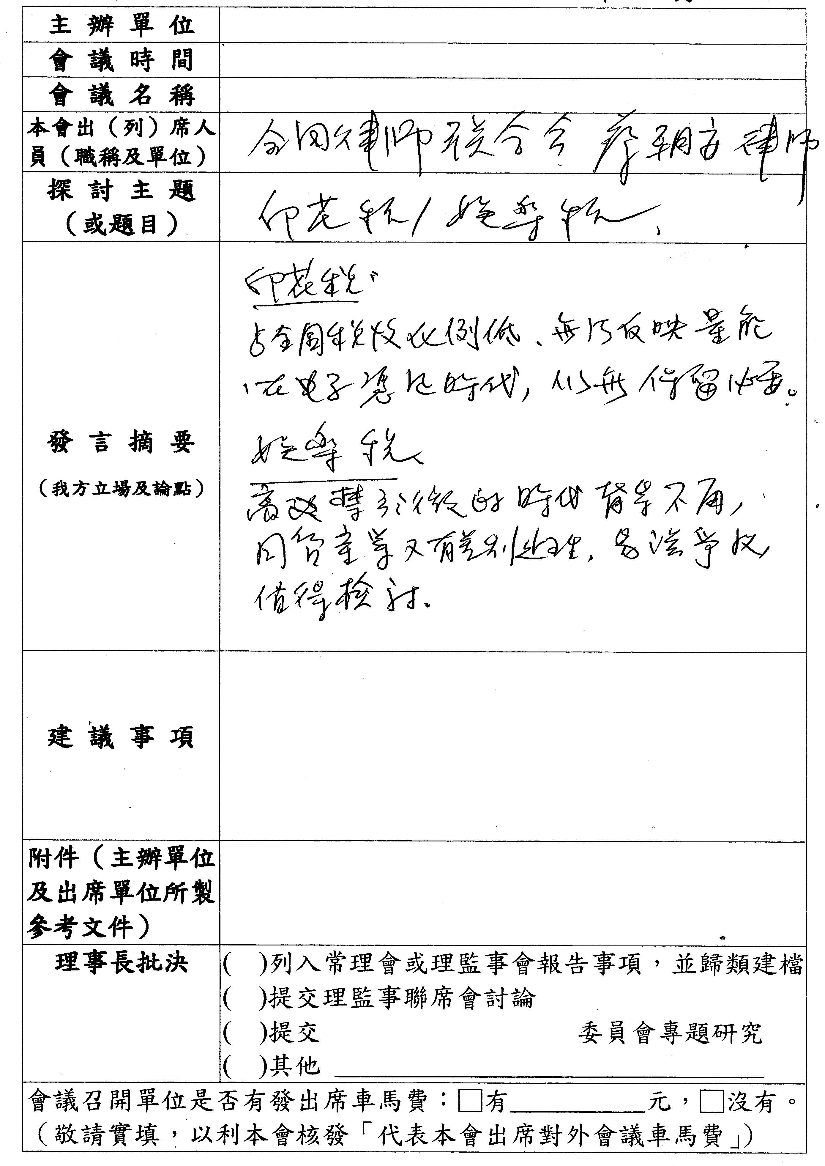 主席:再徵詢確認,有沒有其他中央或地方機關要做回應?再確認一下,因為我看今天多數是針對娛樂稅,也有部分針對印花稅,請問業界代表有沒有要對印花稅進行補充意見?第一次發言的有沒有?好像大家都還在思考。因為今天我們邀請的學者專家在第一輪發言、聽取各位意見之後,有些因為有事已先行離開,所以現場沒有學者專家要做第二輪發言。