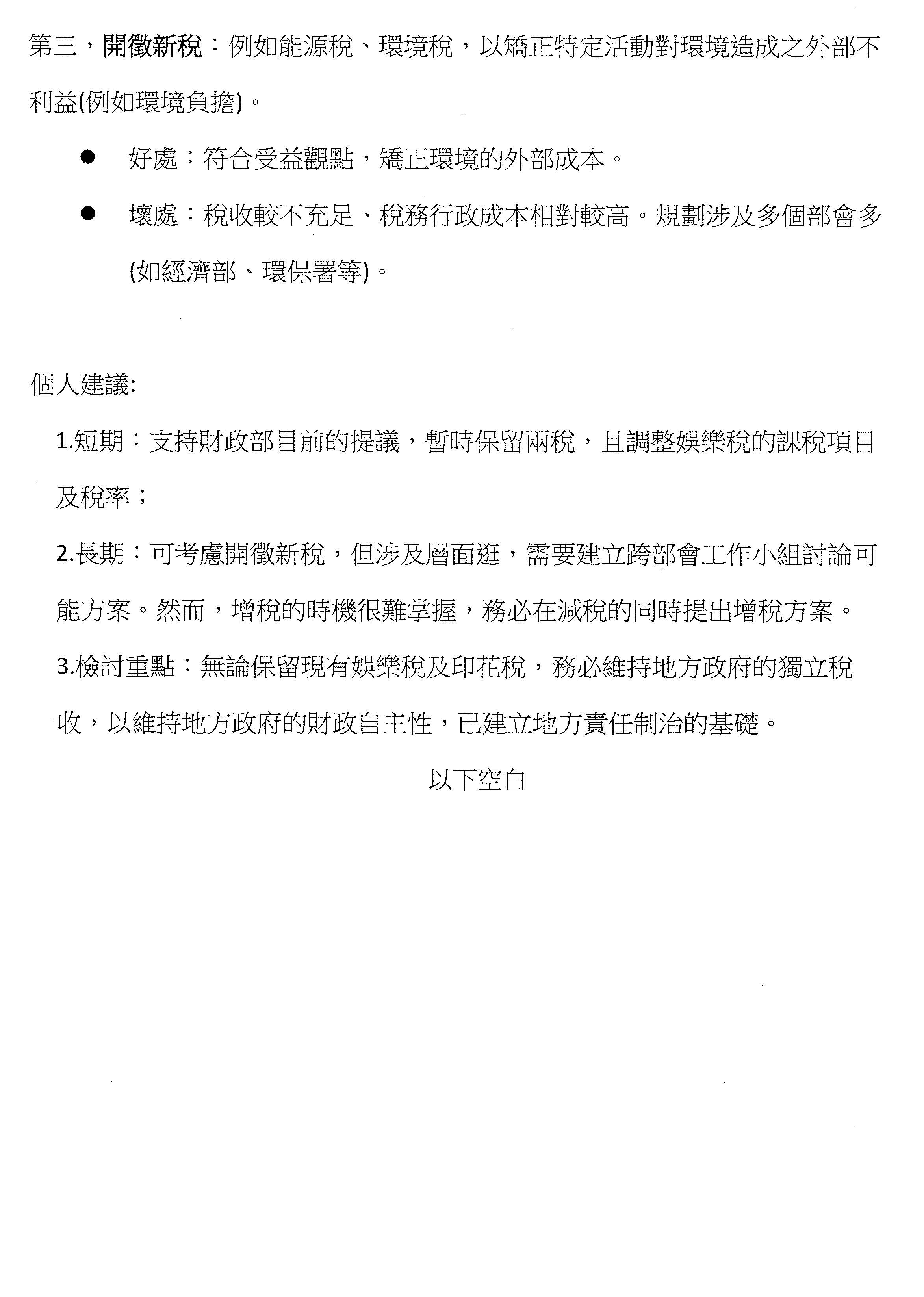 對於以上這三種過去可能的倡議,我個人的建議是,短期方面,我認為應該先保留這兩個稅,可以對娛樂稅的課稅項目和稅率做一些思考。長期方面,我個人比較贊成開徵新稅,可是因為開徵新稅所涉及的層面很多,要跨部會,而且要減稅的時候,社會氛圍比較難掌握,減稅的同時要增加一個稅收,這是要同時考慮的地方。我覺得這個稅收要減掉的最大重點是,我們要維持地方政府的稅收自主性,以免影響地方責任政治的發展,謝謝。