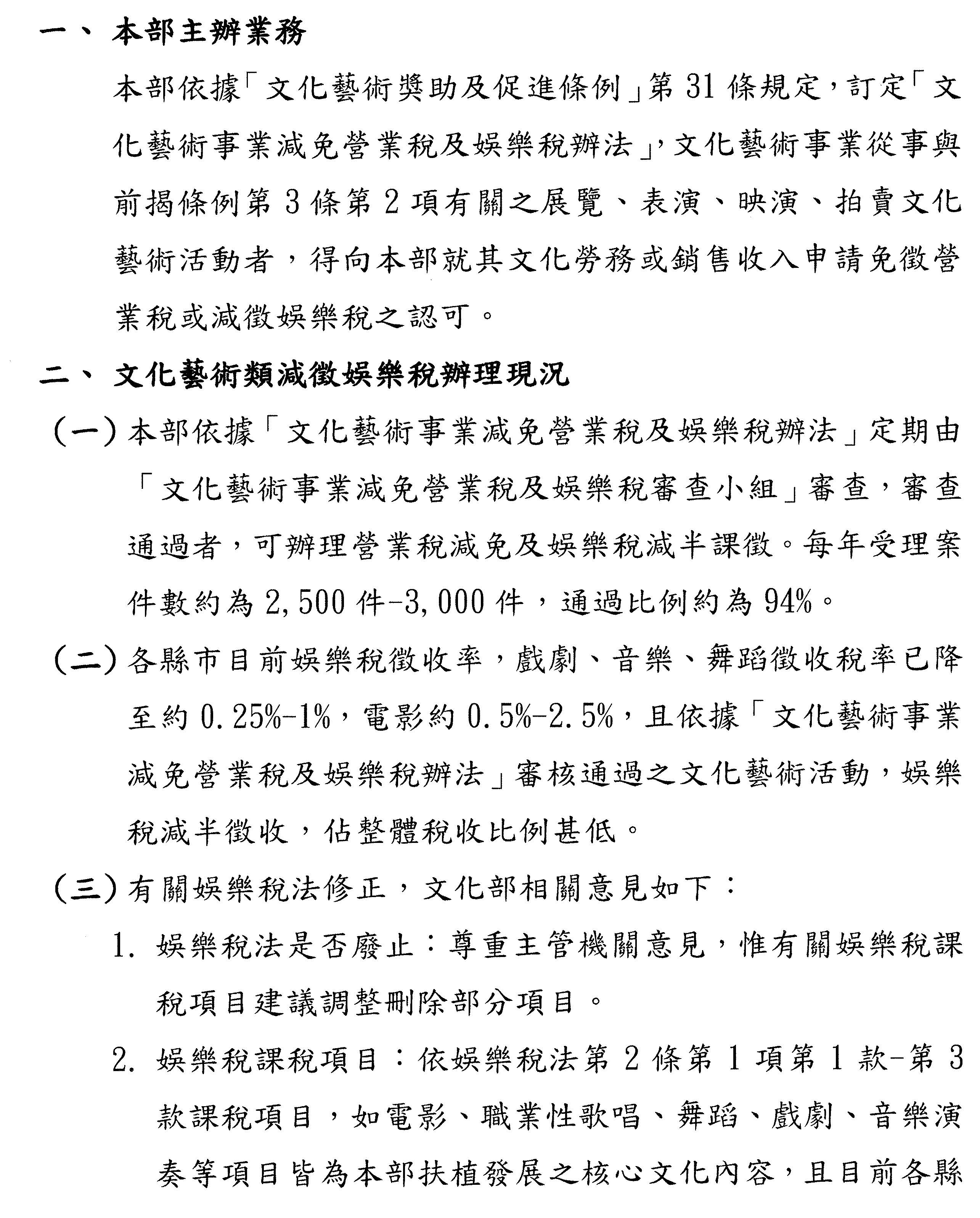 賴專門委員世哲:謝謝主席、現場各位先進。文化部補充報告,本部主管的範圍主要是針對娛樂稅法第二條第一項第一款到第三款的這些項目。其實從剛剛各位先進的說明裡面,我們知道目前有關展覽、表演、映演,就是舞蹈、戲劇、音樂跟電影的產業,其實不只文化部大力地來推動,我想從各縣市政府實際上通過的稅率來看也是站在一個獎勵的立場。我們知道雖然很多縣市政府娛樂稅法訂有最高稅率,可是有的地方政府稅率降低到億分之一,甚至是免徵,所以對於藝文活動的獎勵,中央跟地方政府應該是一致的立場。在這個情況之下,我們可以知道地方政府所訂的整體稅率也是低的,而且占整體稅基比例是非常地低,因此我們對於部分縣市政府主張這是地方重要財源感到疑惑,既然是重要財源,可是實際上經過地方政府自治的結果是稅率降到非常地低,甚至是億分之一,所以主張它是地方重要財源,這部分似乎有待商榷。我們建議文化部所主管有關舞蹈、戲劇、音樂及電影等等項目,在娛樂稅法修正的時候可以予以刪除免徵。至於整體娛樂稅法是否要予以廢除,這部分本部沒有特別的意見,以上補充報告。