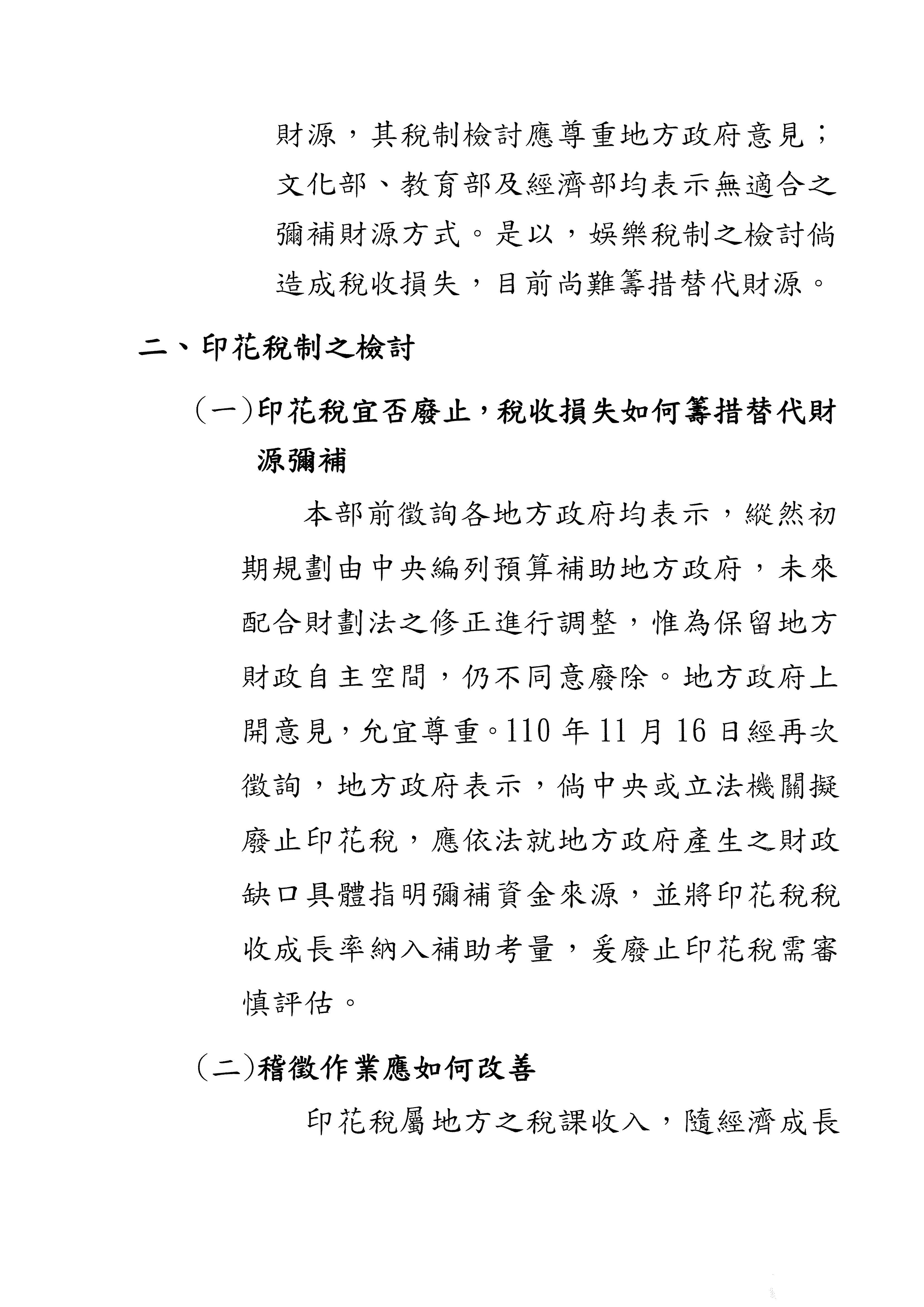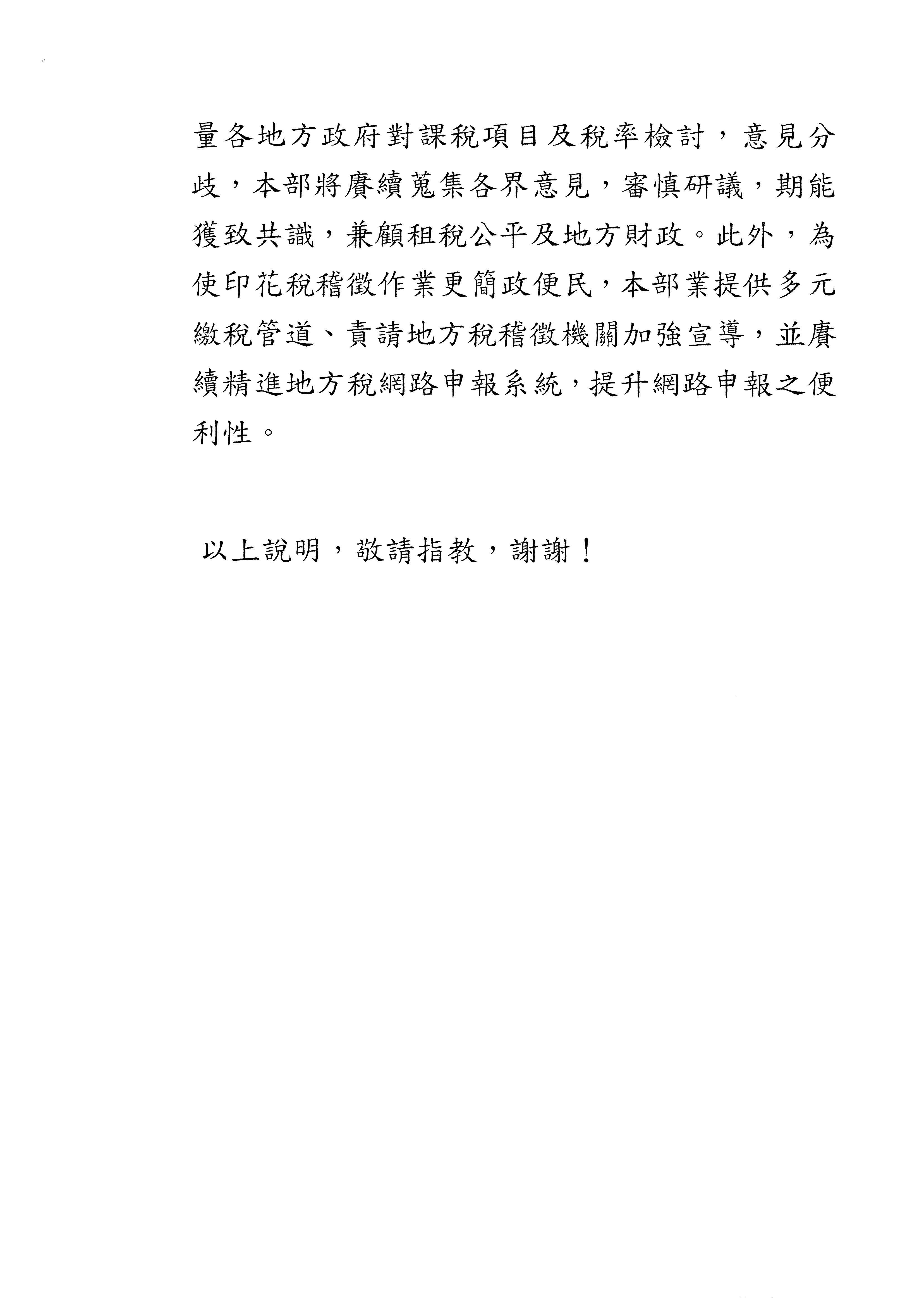 最後還是要說明一下,就是娛樂稅跟印花稅是地方政府主要的重要財源,因為它的稅收是全部歸屬地方政府,在財劃法沒有修正之前,有關替代財源的籌措確實有些困難,我們目前只能持續跟地方政府溝通,為了避免影響地方政府的建設跟發展,我們可能會從調整、修正一些不合時宜的課稅標的之方式來調整,但是我們不建議用廢除的方式讓這兩項稅目從此消失。另外我們也會持續地精進娛樂稅跟印花稅稽徵作業的便利性,讓納稅義務人在繳稅的方式上面能夠更為便捷,減輕民眾的負擔。以上是表達財政部目前的立場,還有跟地方政府溝通結果的意見,以上報告,謝謝委員。