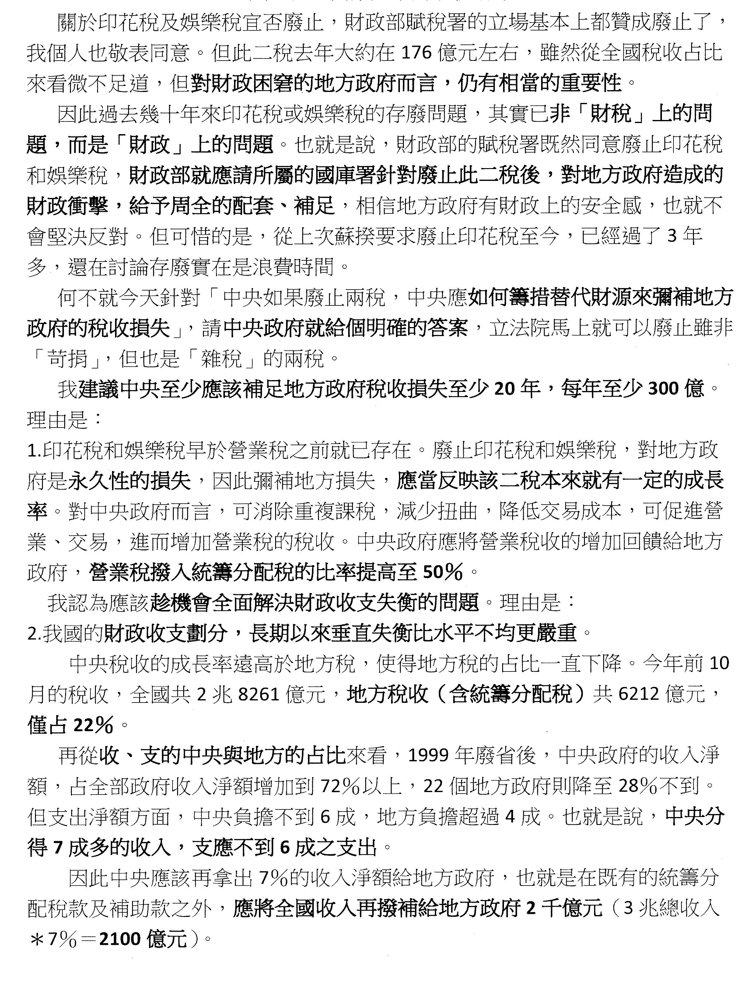 今天一個是娛樂稅的問題,另外一個是印花稅的問題,其實這些都是屬於古老的稅制,是在當時的時空環境下所制定的稅制,但是隨著時空環境的演變,現在是不是還適合?我必須指出,其實我們今天所談的問題,一個爭點是在稅制本身,就是說這個稅到底適不適合,另外一個就是它衍生的效果,可是我們可能常常把衍生的問題和稅制本身要不要修的問題混在一起,為什麼?因為我們知道這兩個稅都是地方稅,而且它可能還是一些特定地方的重要財源,大家因為覺得有財源的損失所以去反對等等,可是有時候我們要仔細想一下,其實這本來是兩碼子事,坦白講,地方的財源不足,難道一定要用這個過去在稅制上有問題的稅來貼補嗎?是不是這樣?認真來講,從88年起財政收支劃分法就沒有再修了,整個中央與地方稅制之間的關係要正本清源,其實是沒有解,所以現在等於是把兩件事併在一起。