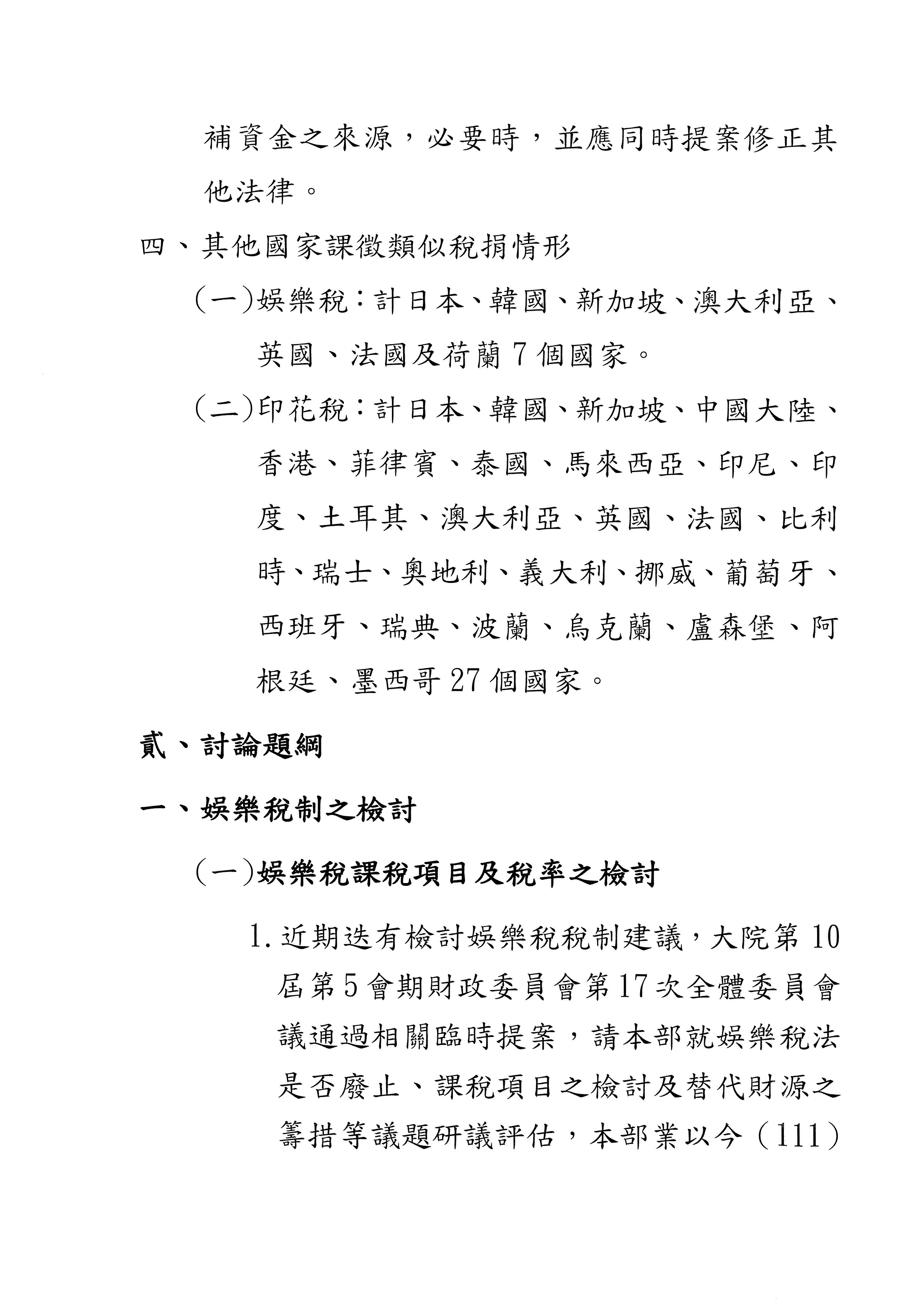至於娛樂稅和印花稅,剛才說過,雖然它是一個古老的稅制,但不是只有臺灣在課徵,其實很多國家也有課徵。像娛樂稅,包含鄰近的日本、韓國、新加坡,以及澳大利亞、英國、法國、荷蘭,這7個國家都有在課娛樂稅。另外,包含日本、韓國、新加坡,甚至是中國大陸、香港,將近27個國家也有在課徵印花稅,所以我要再回應前面的發言,它雖然是一個古老的稅制,但它不一定要廢止。