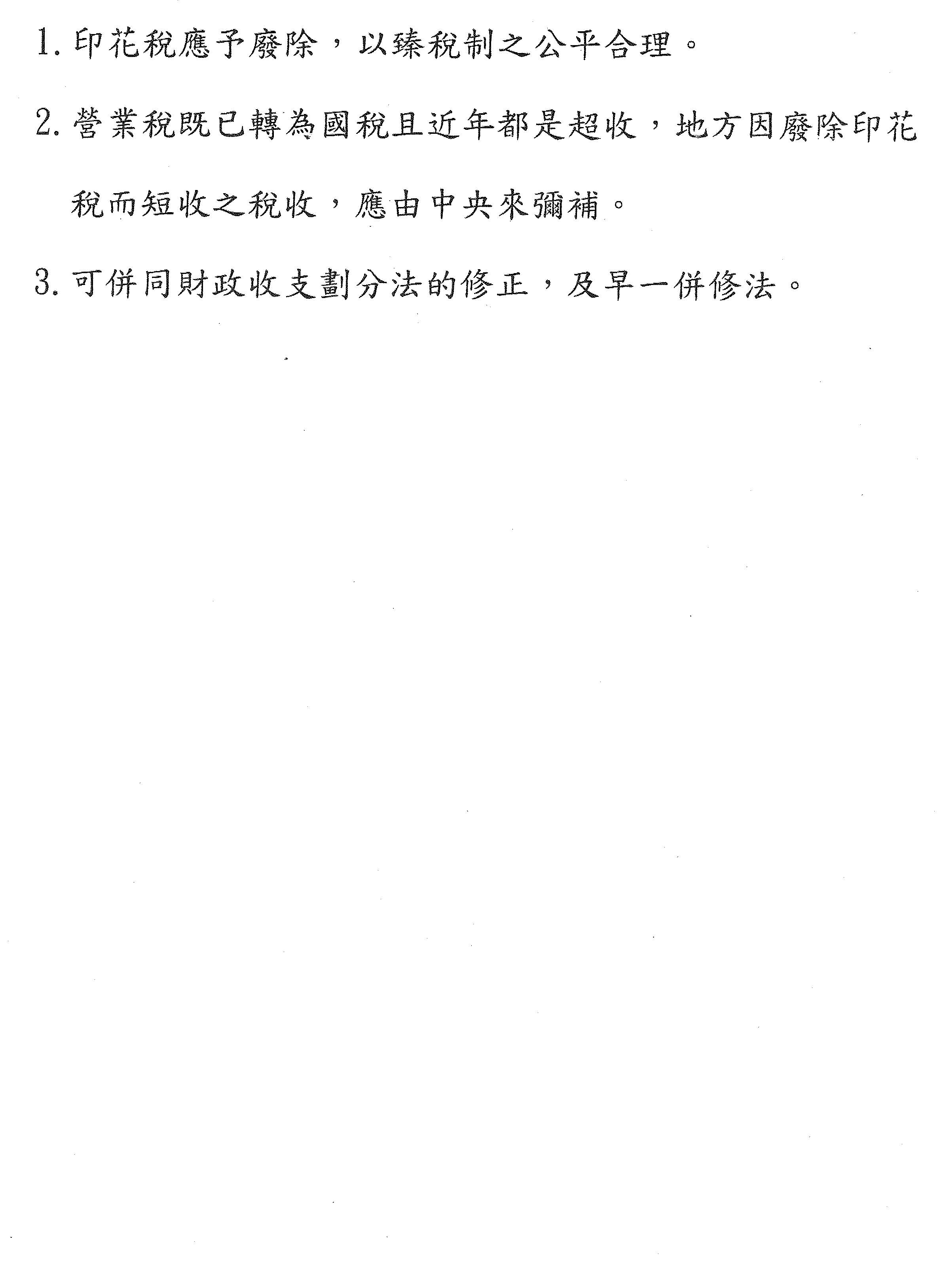 就印花稅的課徵方面來講,其實可以稍微酌予修正,看如何修正,我們認為是可以修,但不宜廢止。我同樣想報告的是,我真的不希望將印花稅廢止,因為廢止對整個市政府建設推動的影響非常大,如果真的要廢止,也希望中央能補助地方的財源,以上報告。