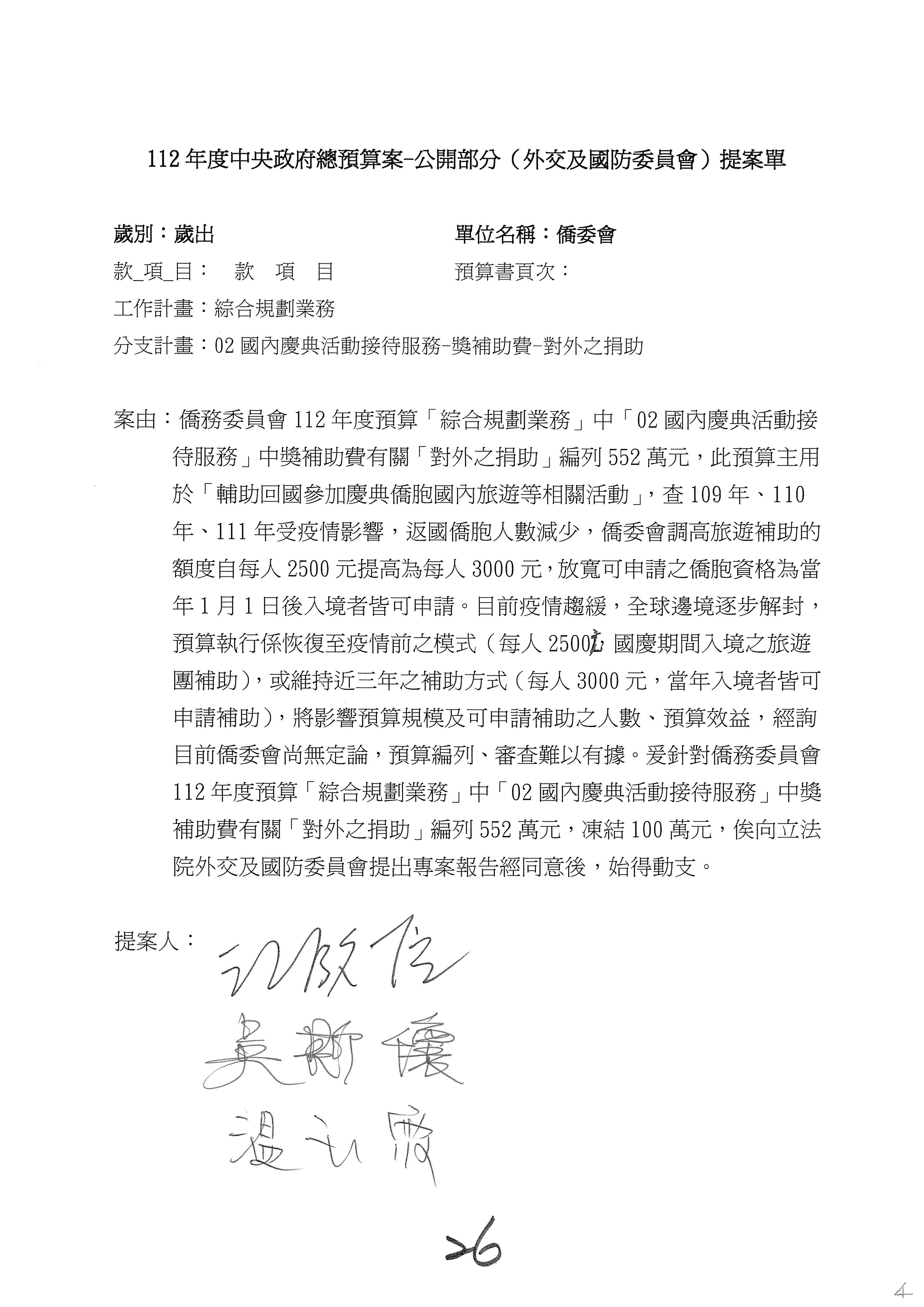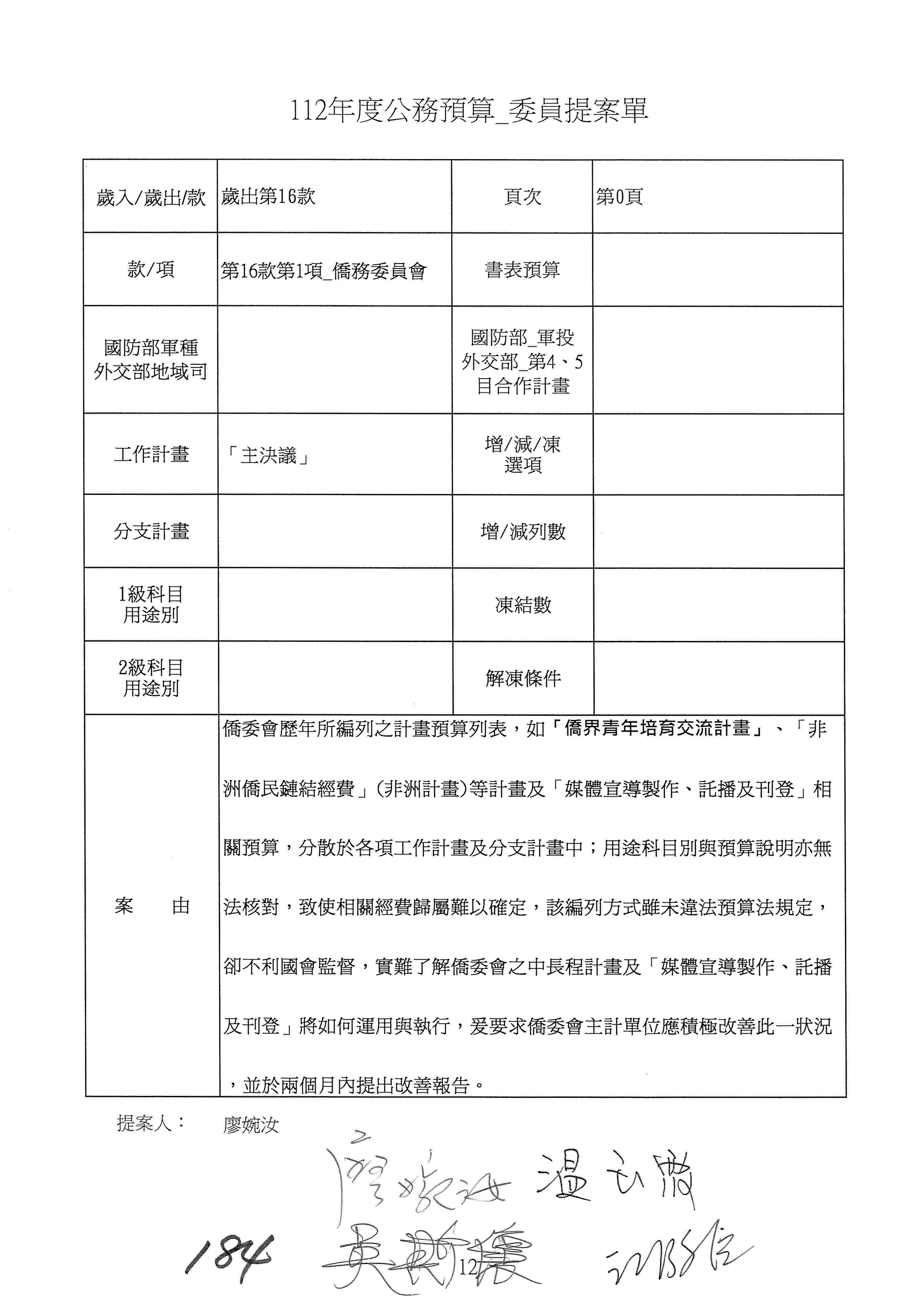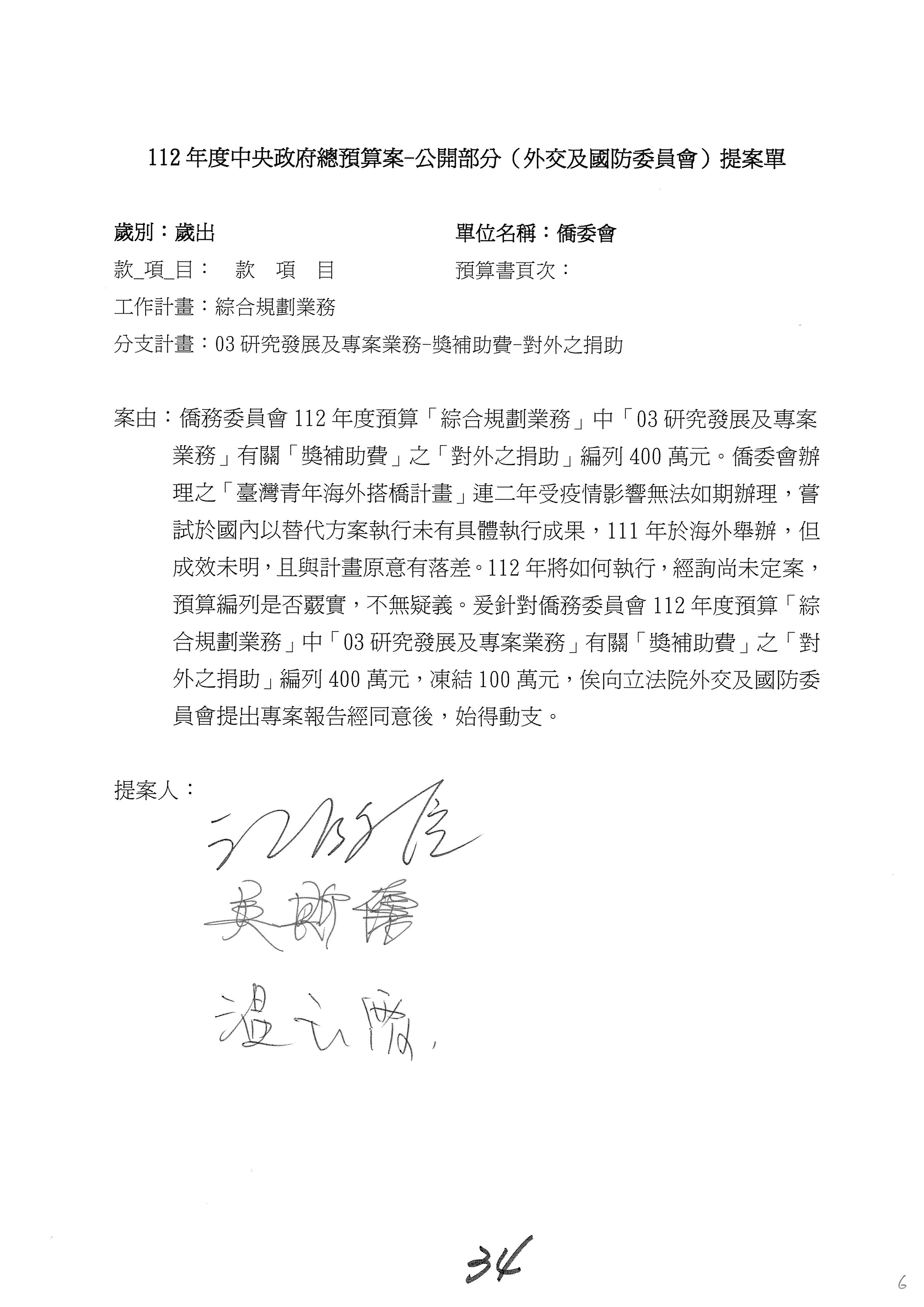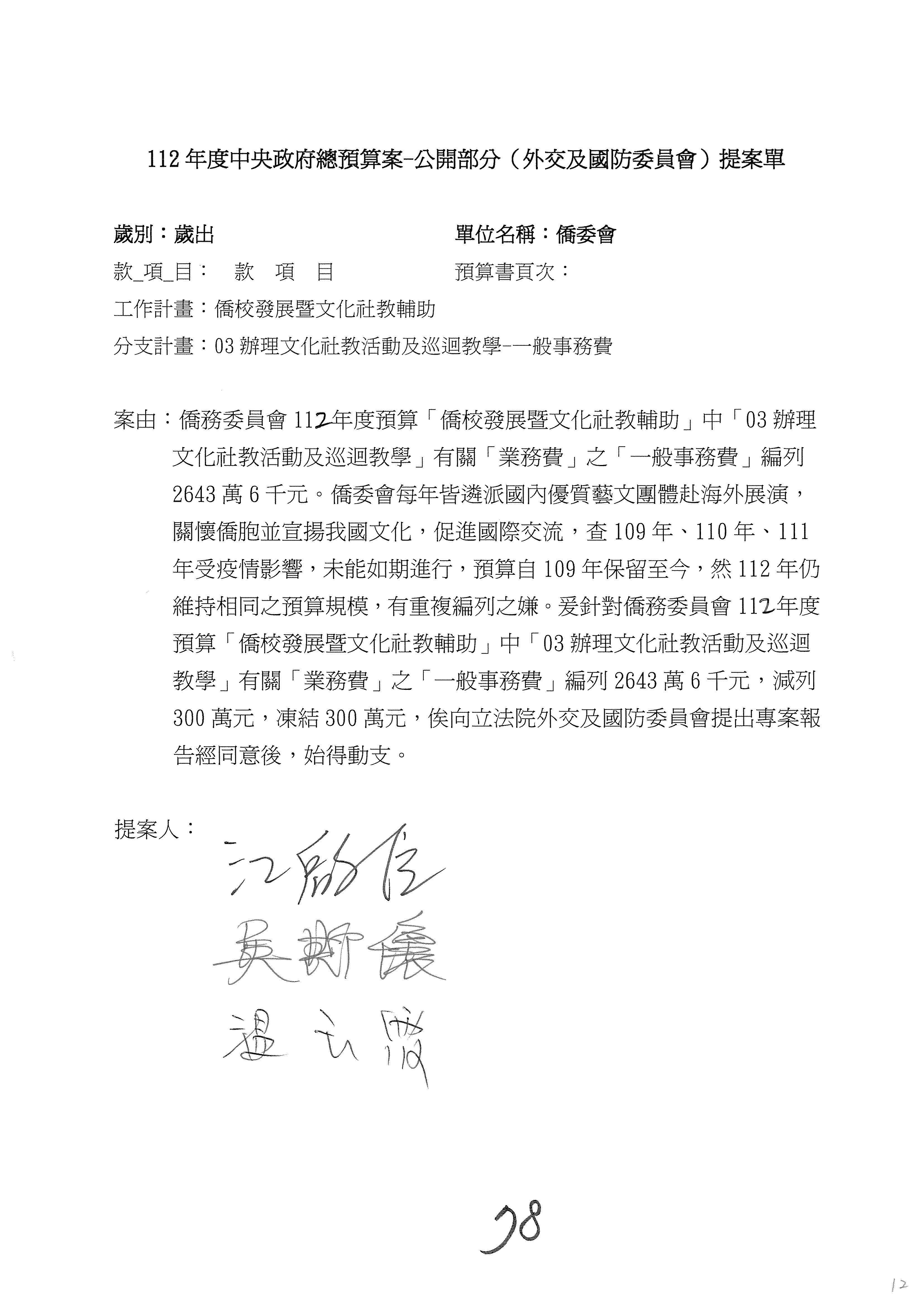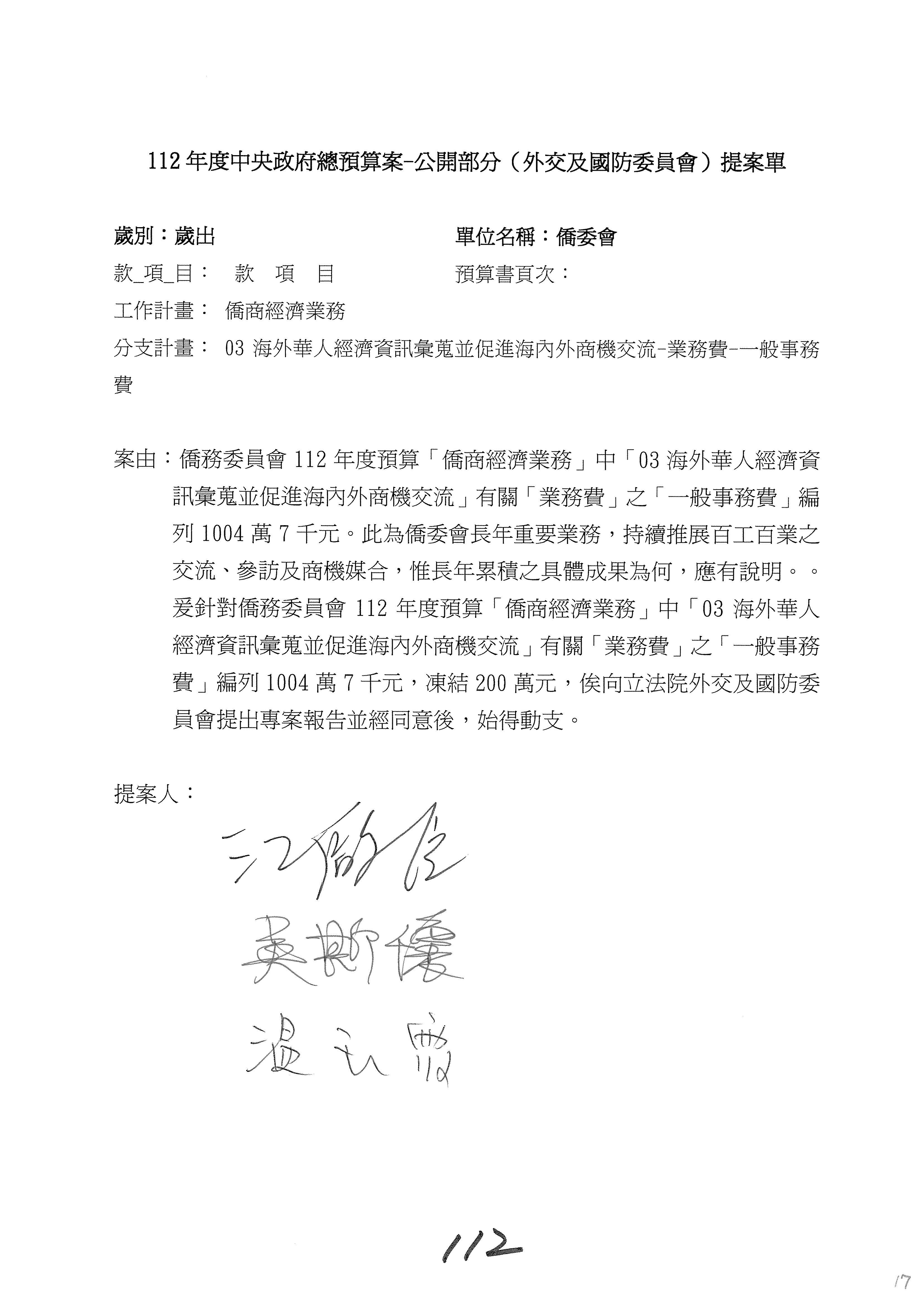 (二)112年度僑務委員會主管預算提案單(公開部分):