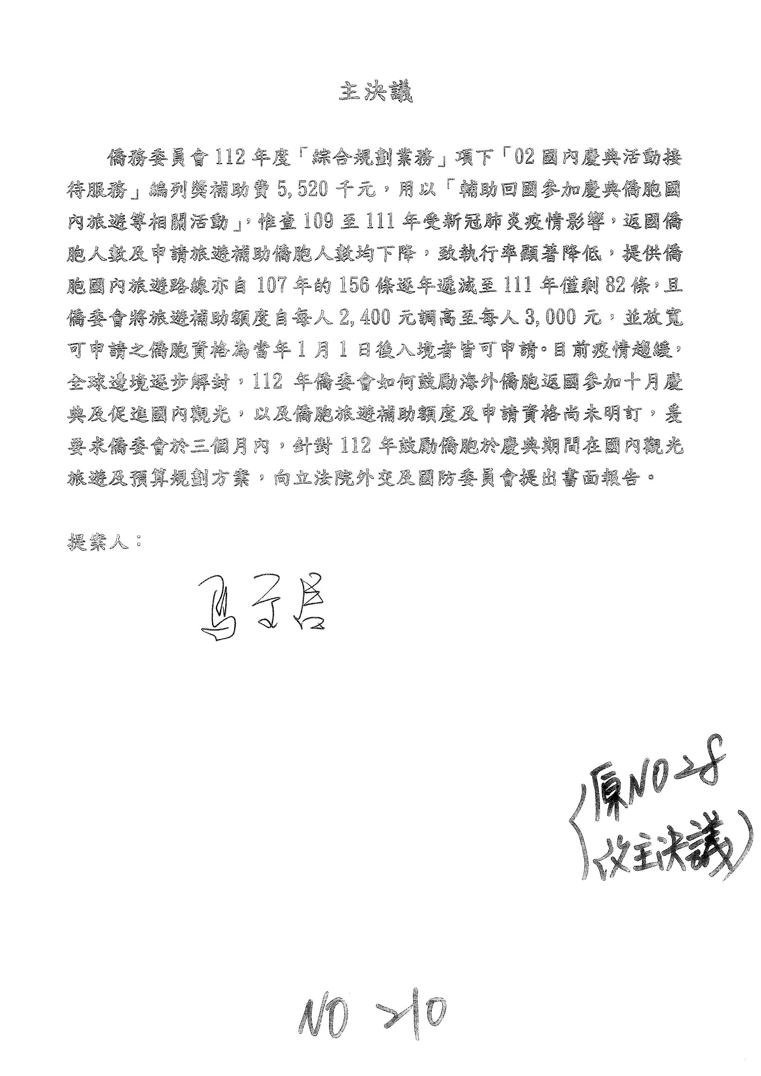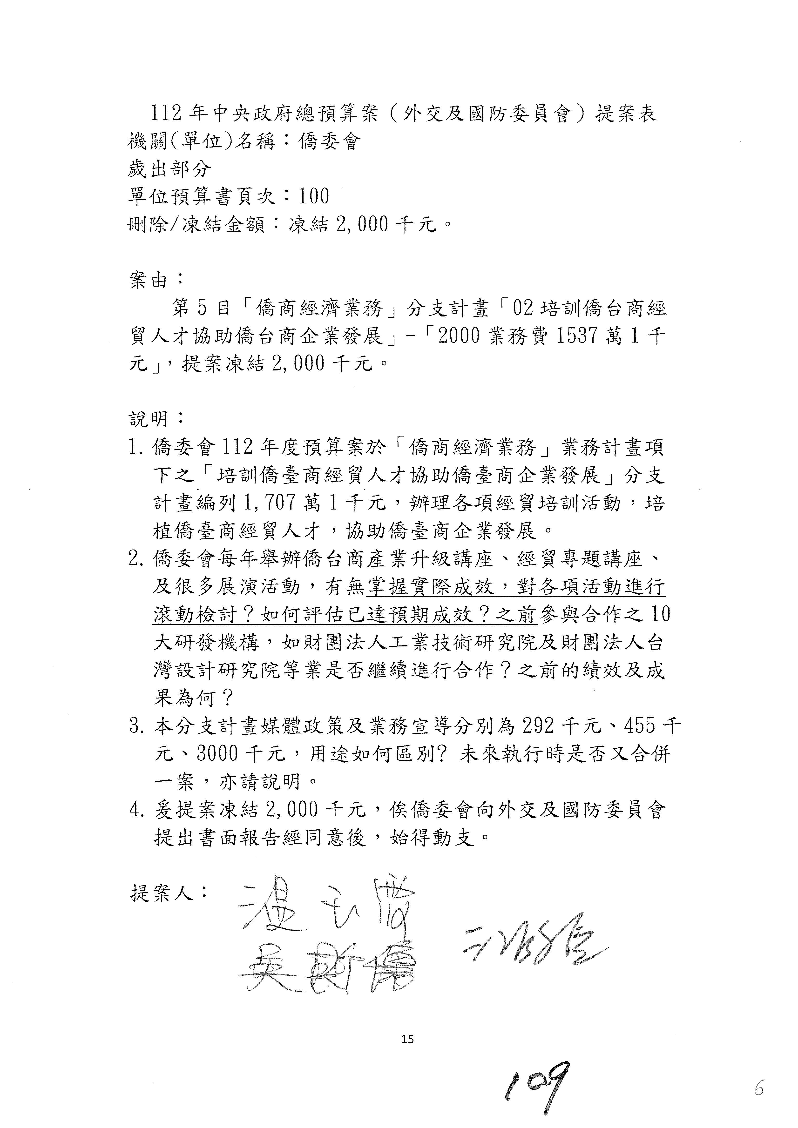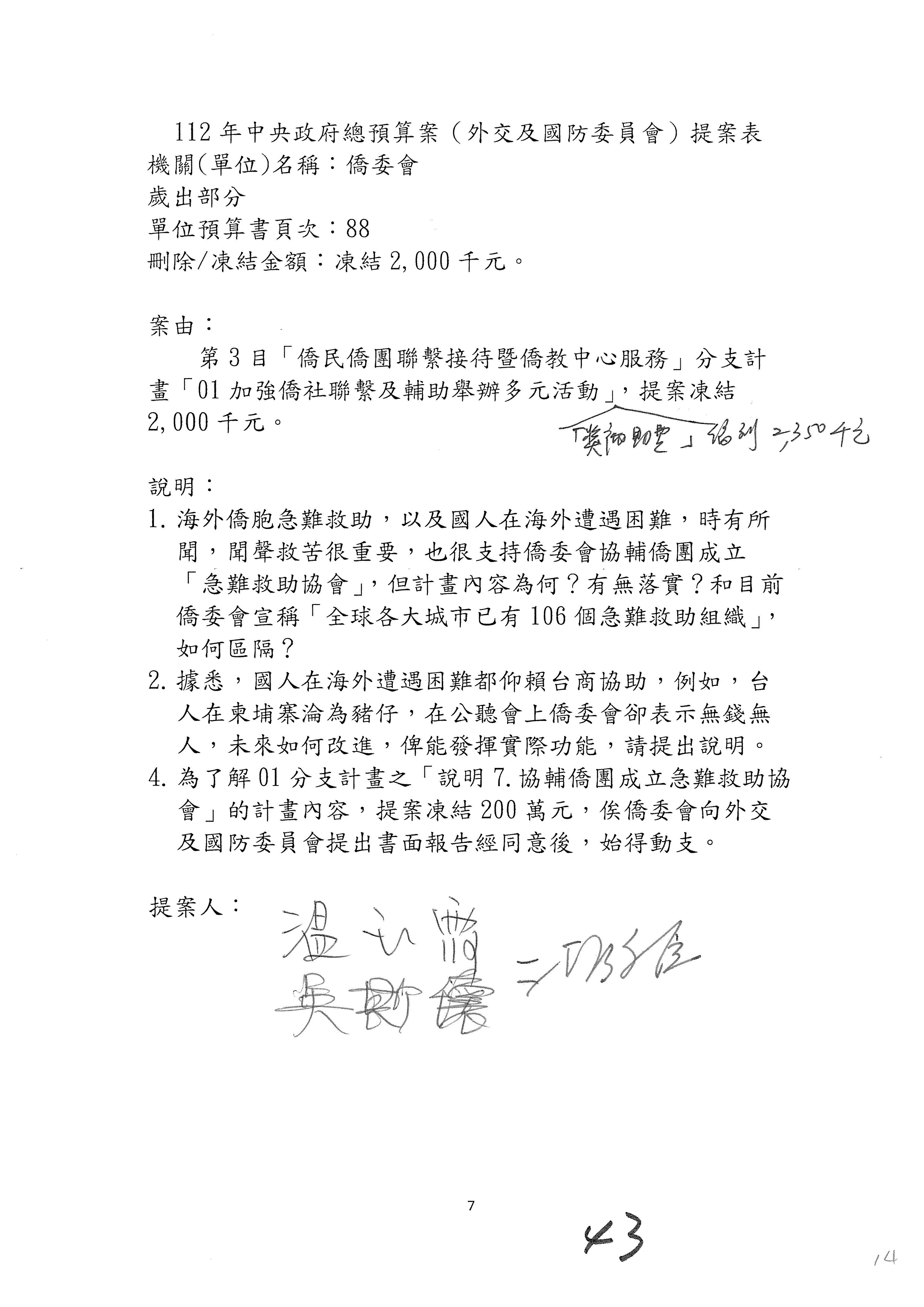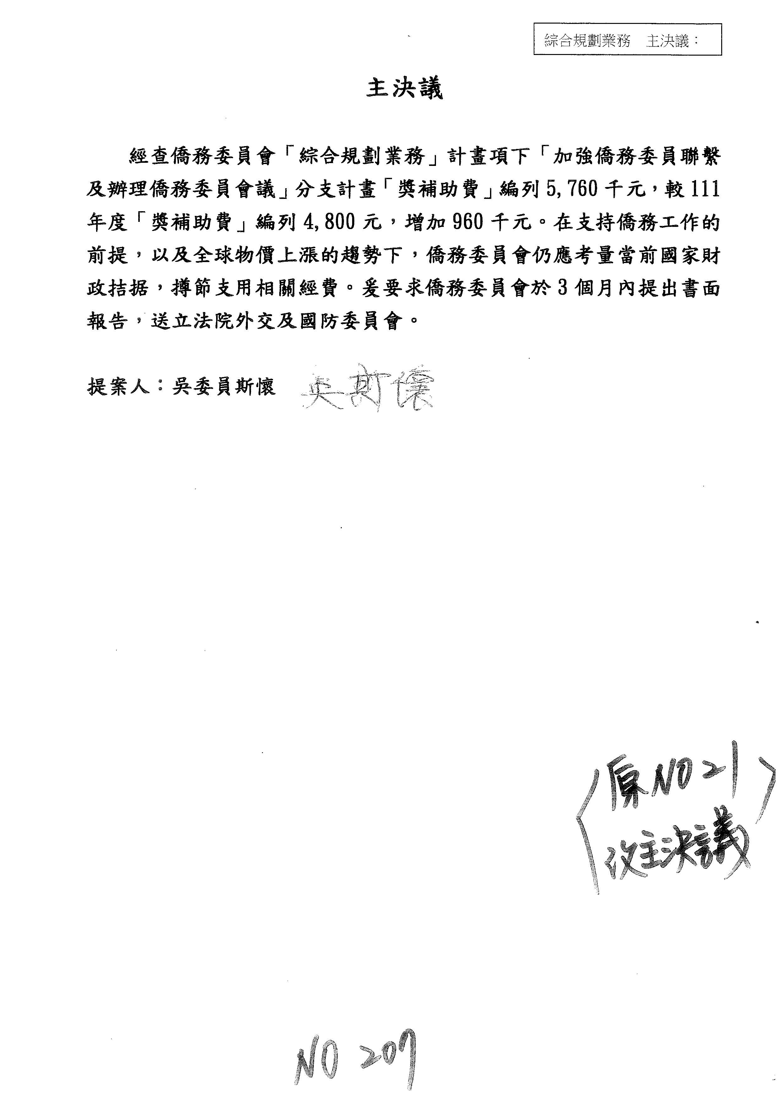 童委員長振源:有,他的提案是寫「建請僑務委員會調整計畫內容」,是不是可以將這幾個字拿掉,就接後面的「明確劃分業務內容」,將「調整計畫內容,」這幾個字拿掉,因為調整計畫內容會涉及到中長程計畫,這會比較……