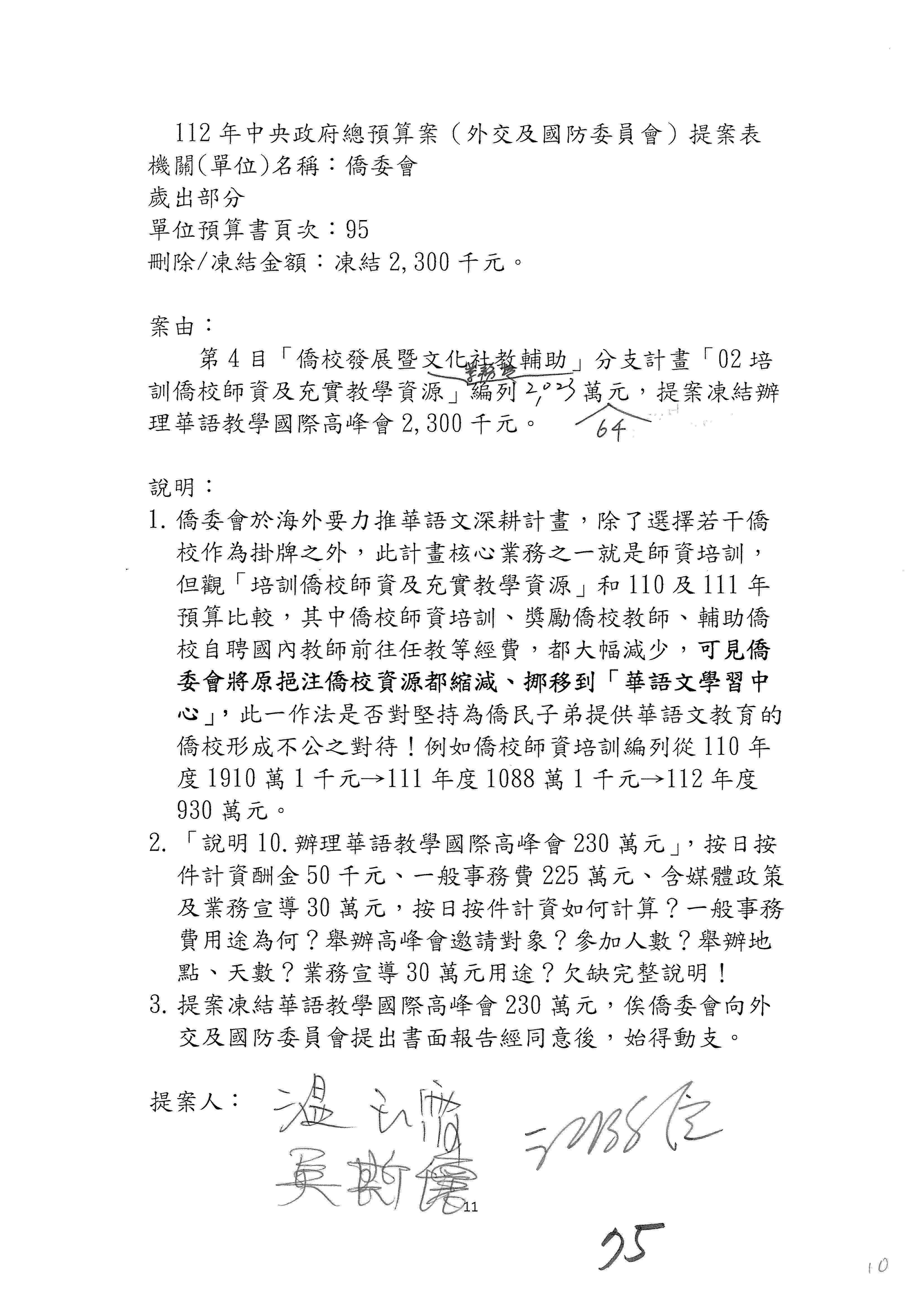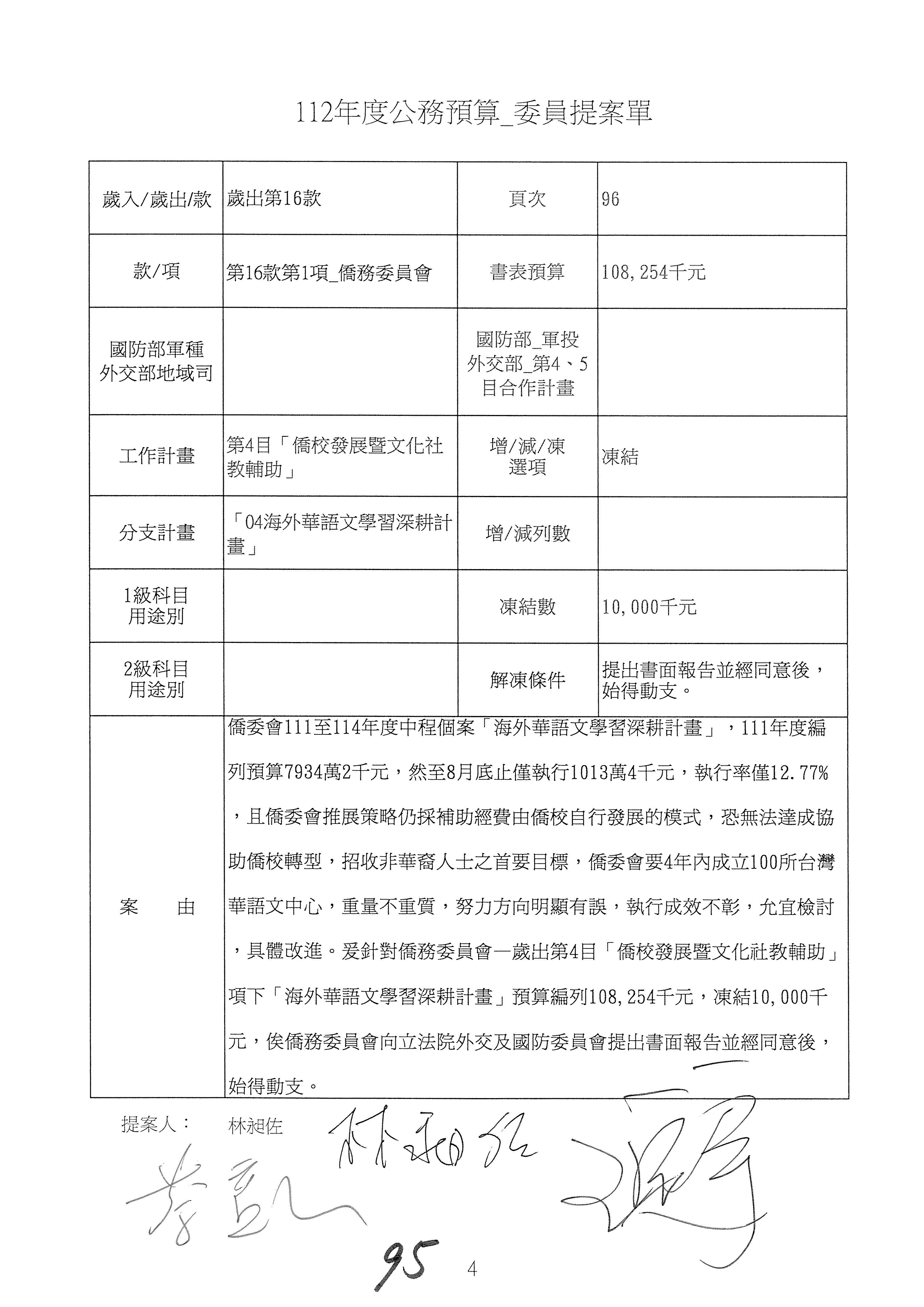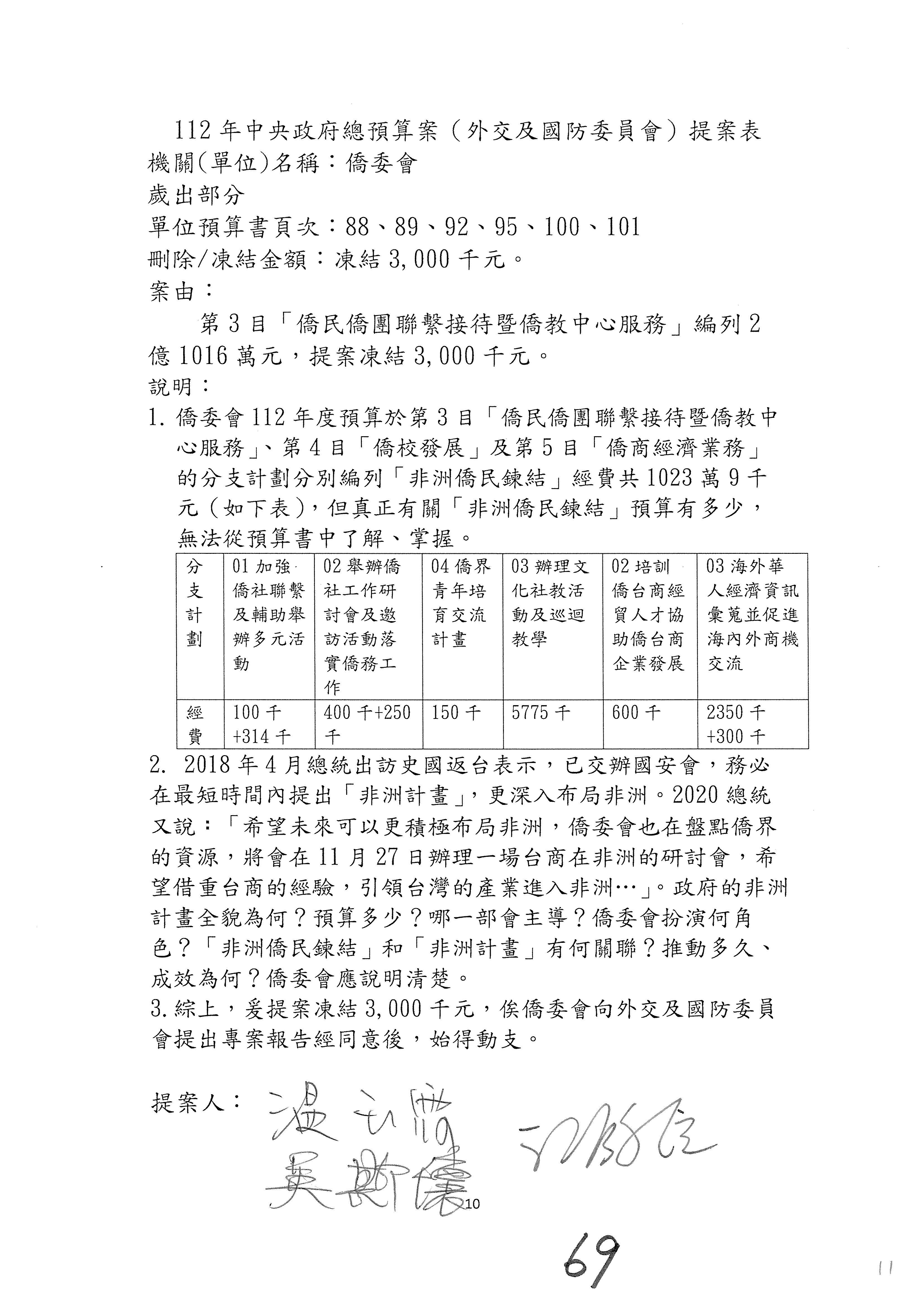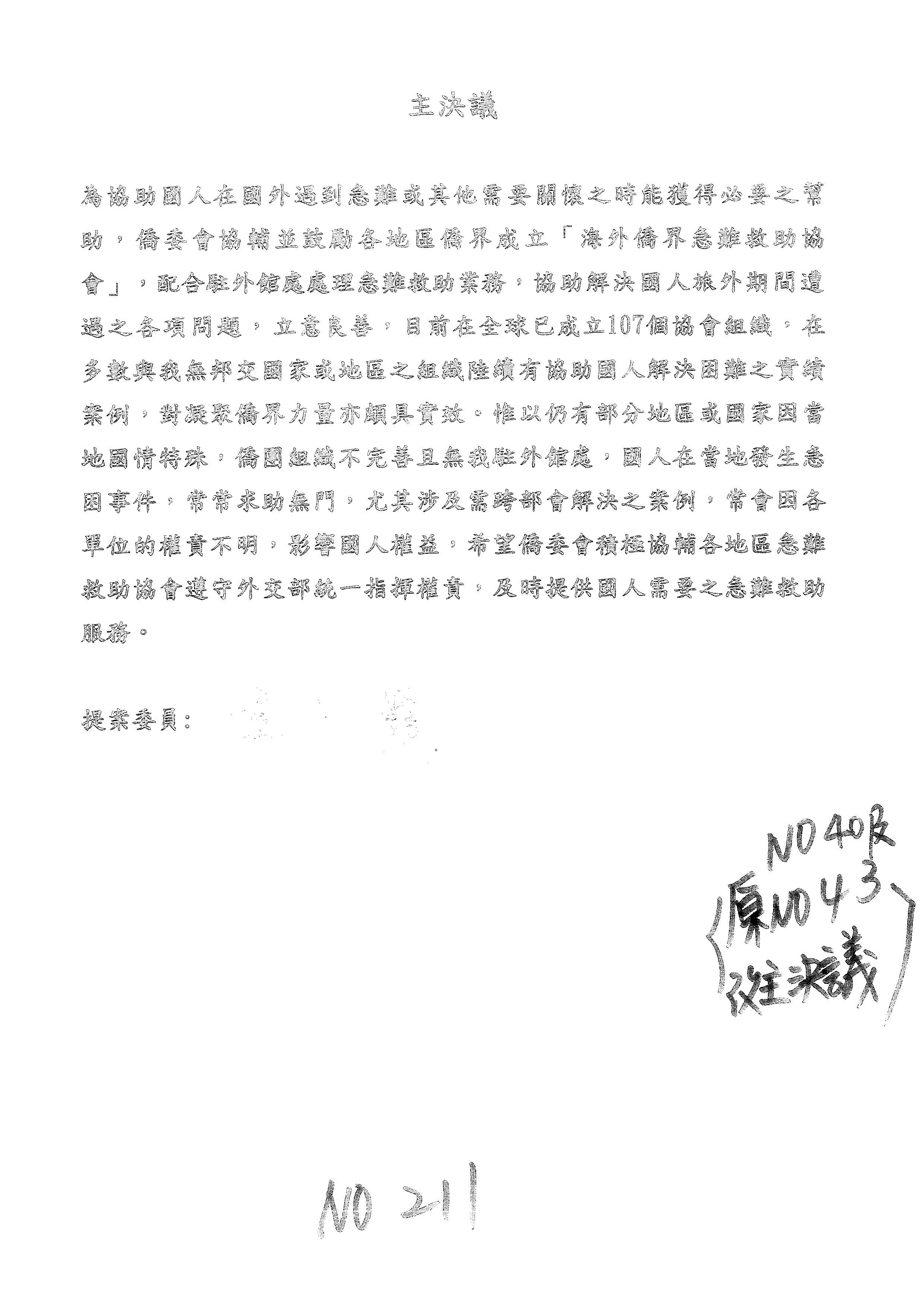 童委員長振源:有,他的提案是寫「建請僑務委員會調整計畫內容」,是不是可以將這幾個字拿掉,就接後面的「明確劃分業務內容」,將「調整計畫內容,」這幾個字拿掉,因為調整計畫內容會涉及到中長程計畫,這會比較……