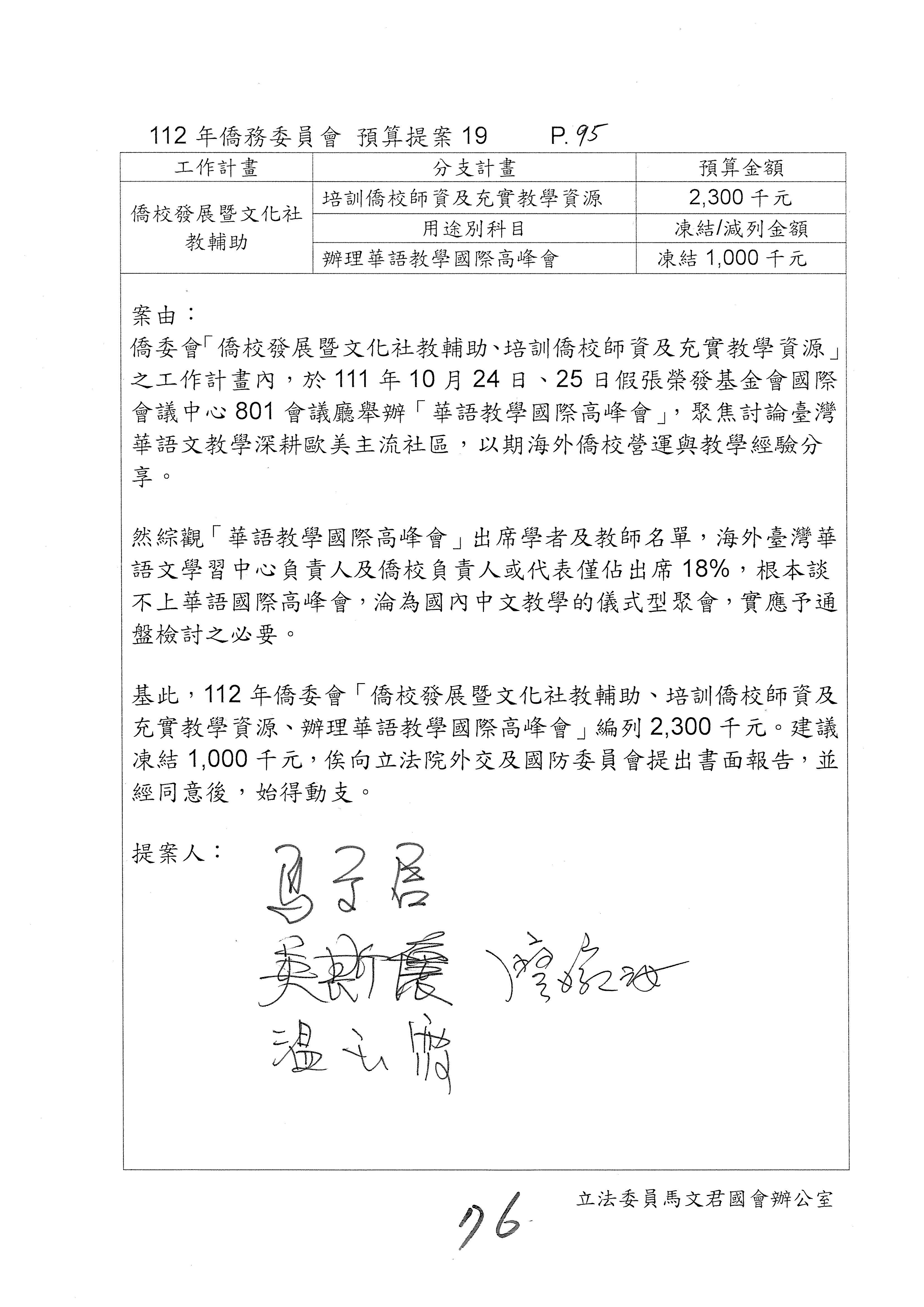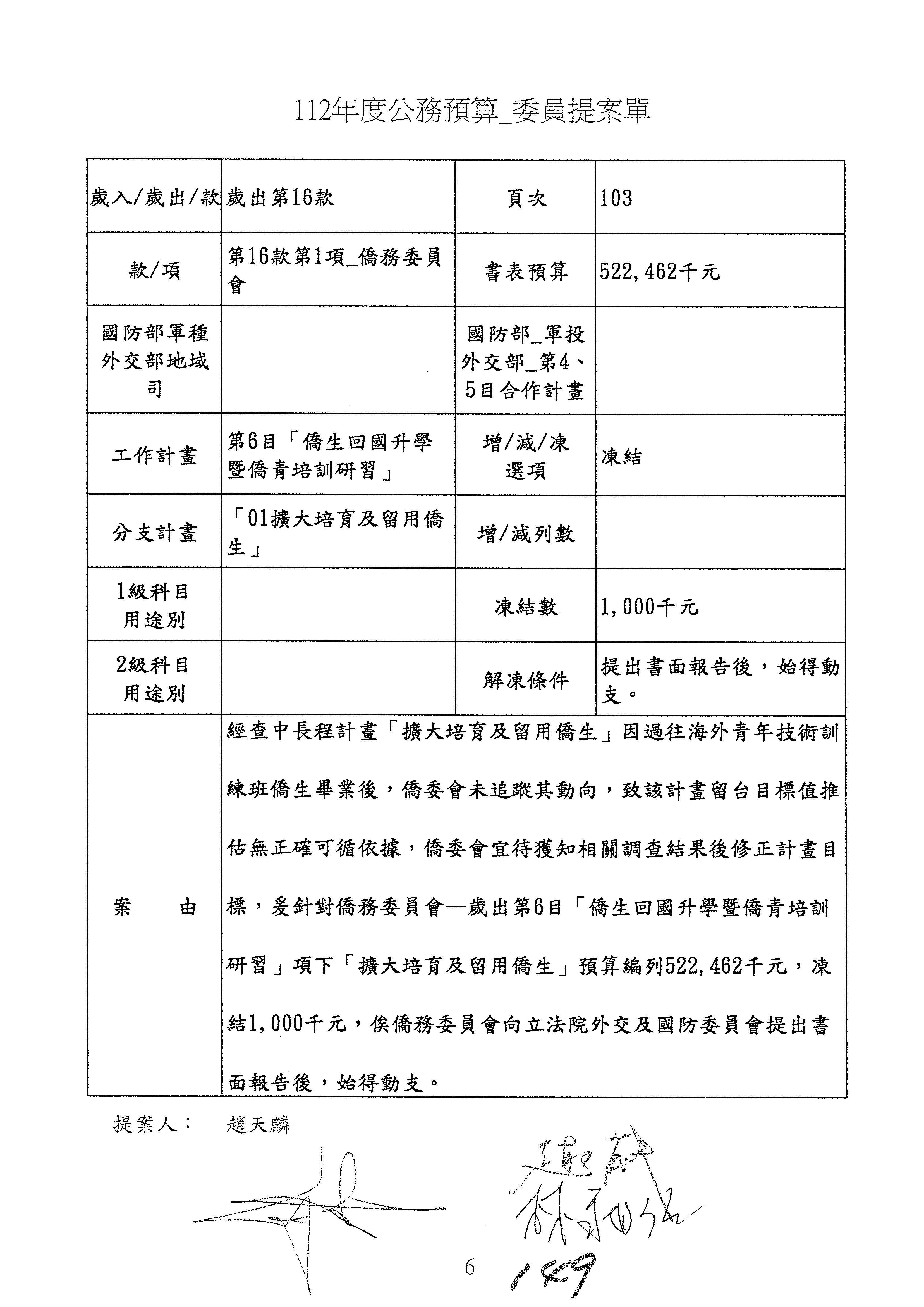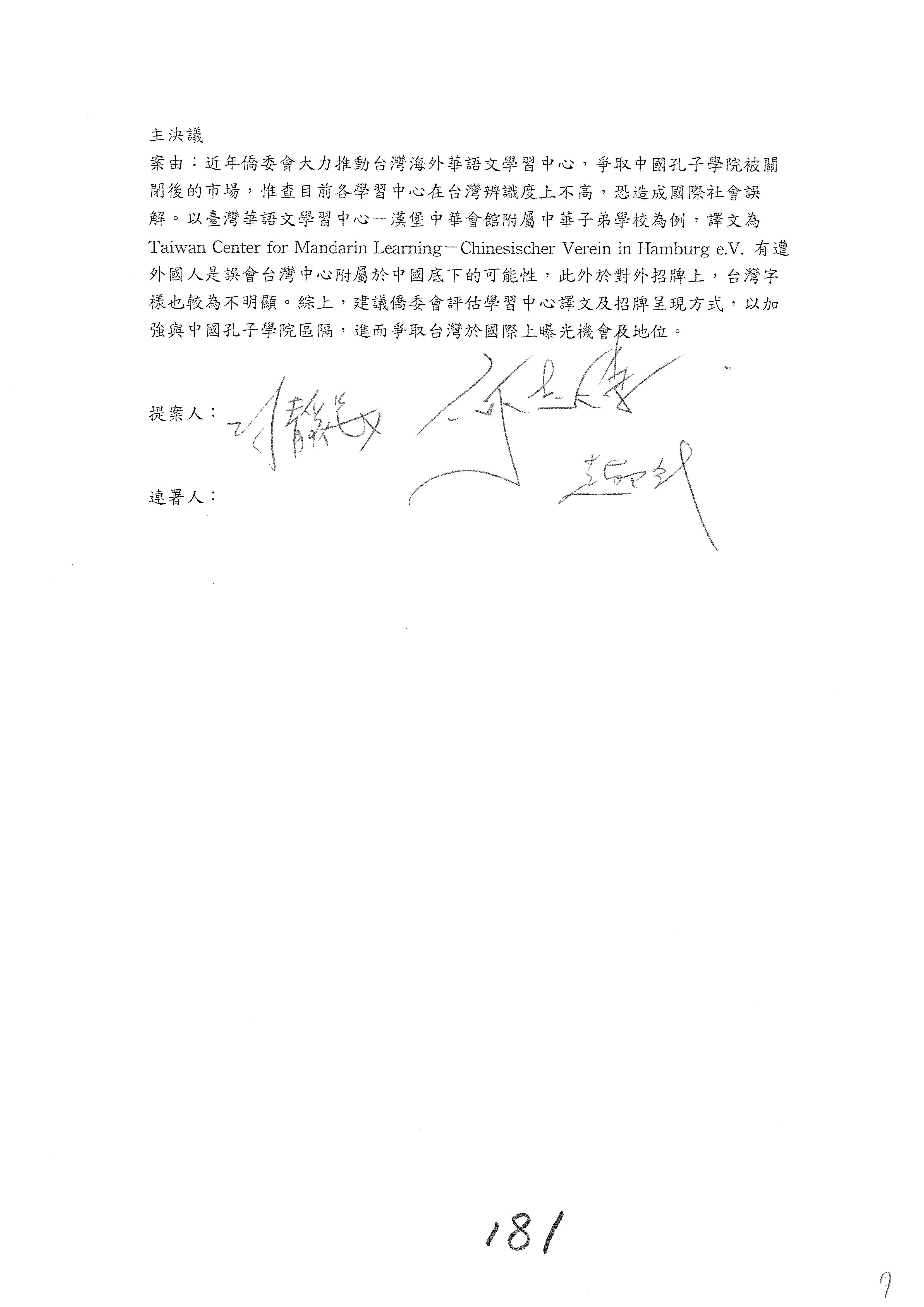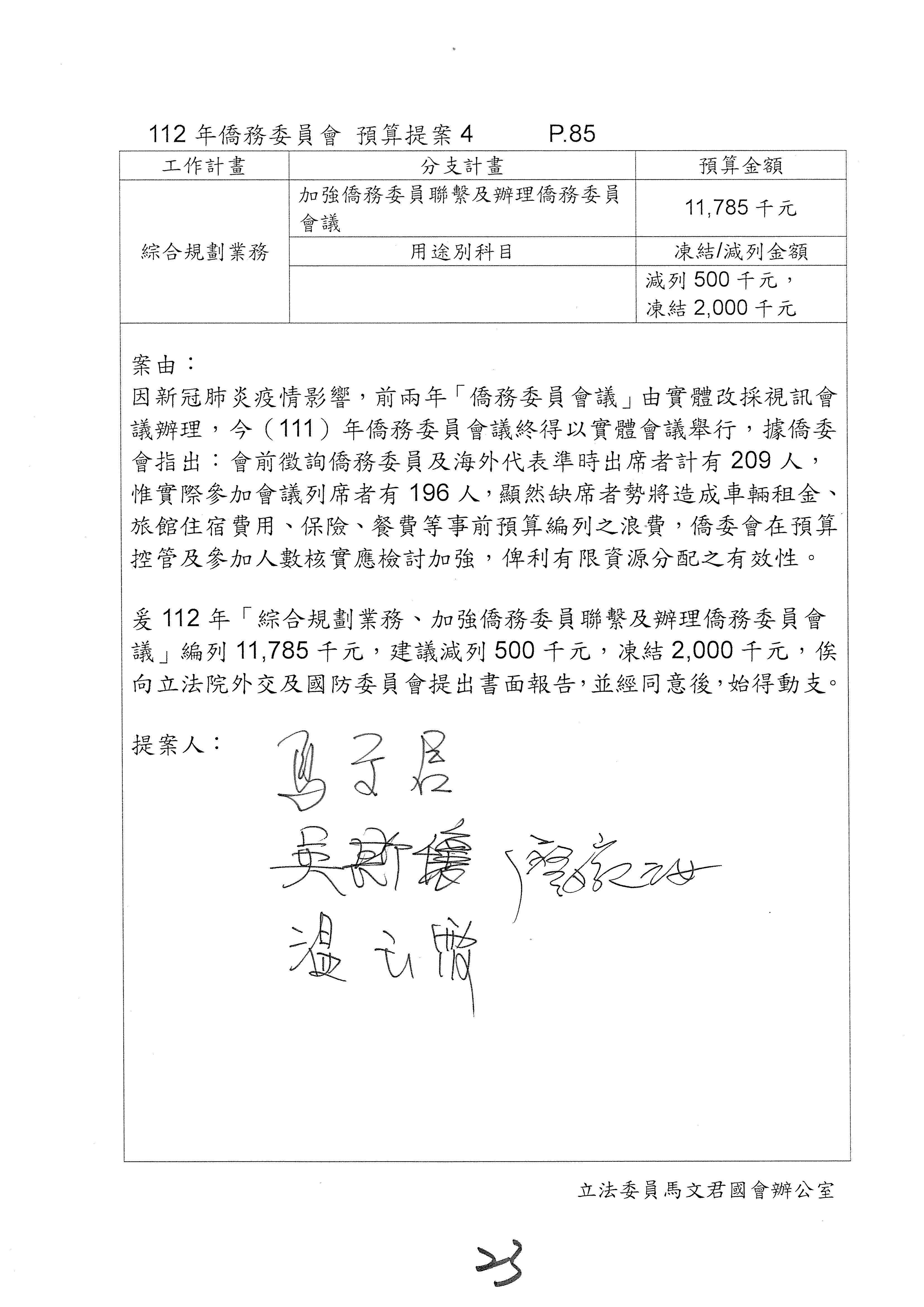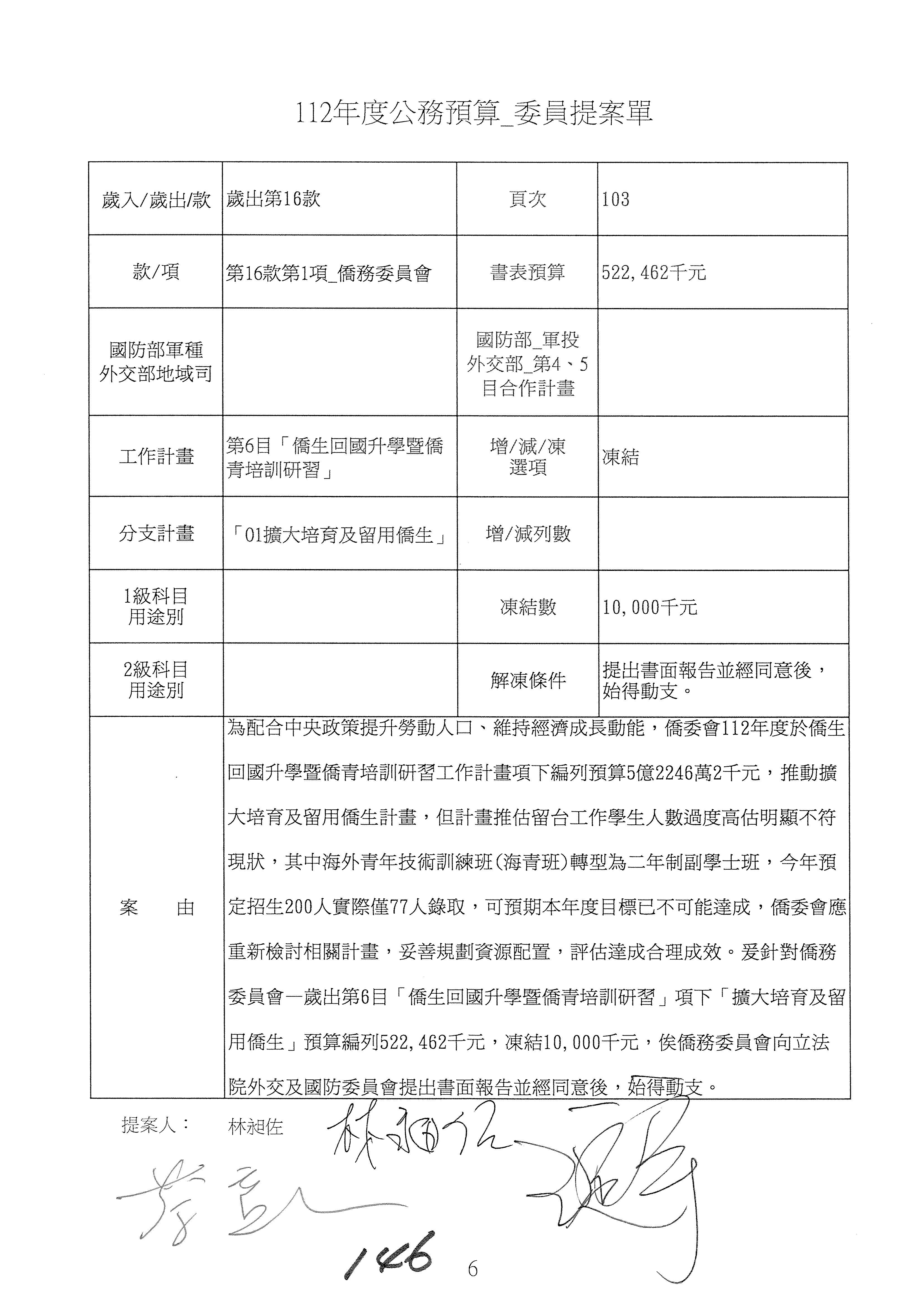 童委員長振源:有,他的提案是寫「建請僑務委員會調整計畫內容」,是不是可以將這幾個字拿掉,就接後面的「明確劃分業務內容」,將「調整計畫內容,」這幾個字拿掉,因為調整計畫內容會涉及到中長程計畫,這會比較……